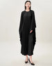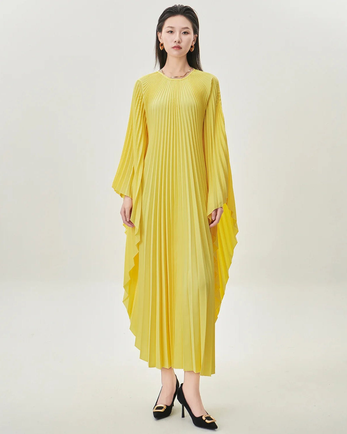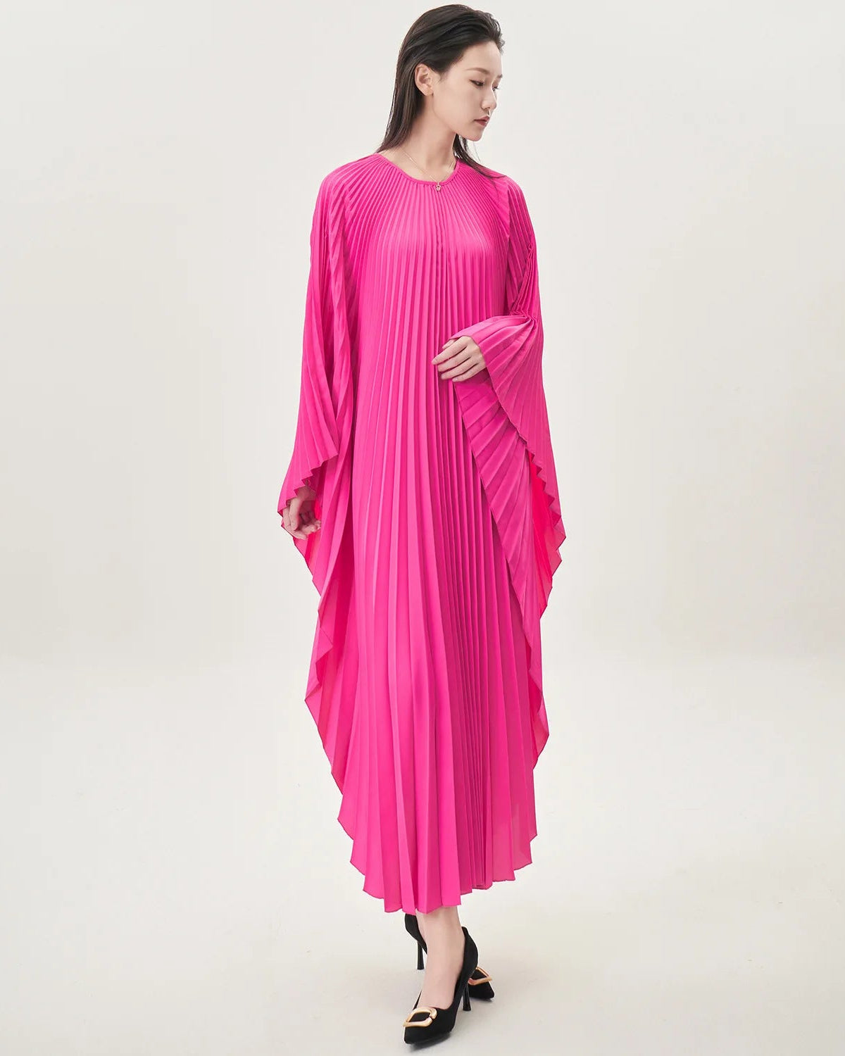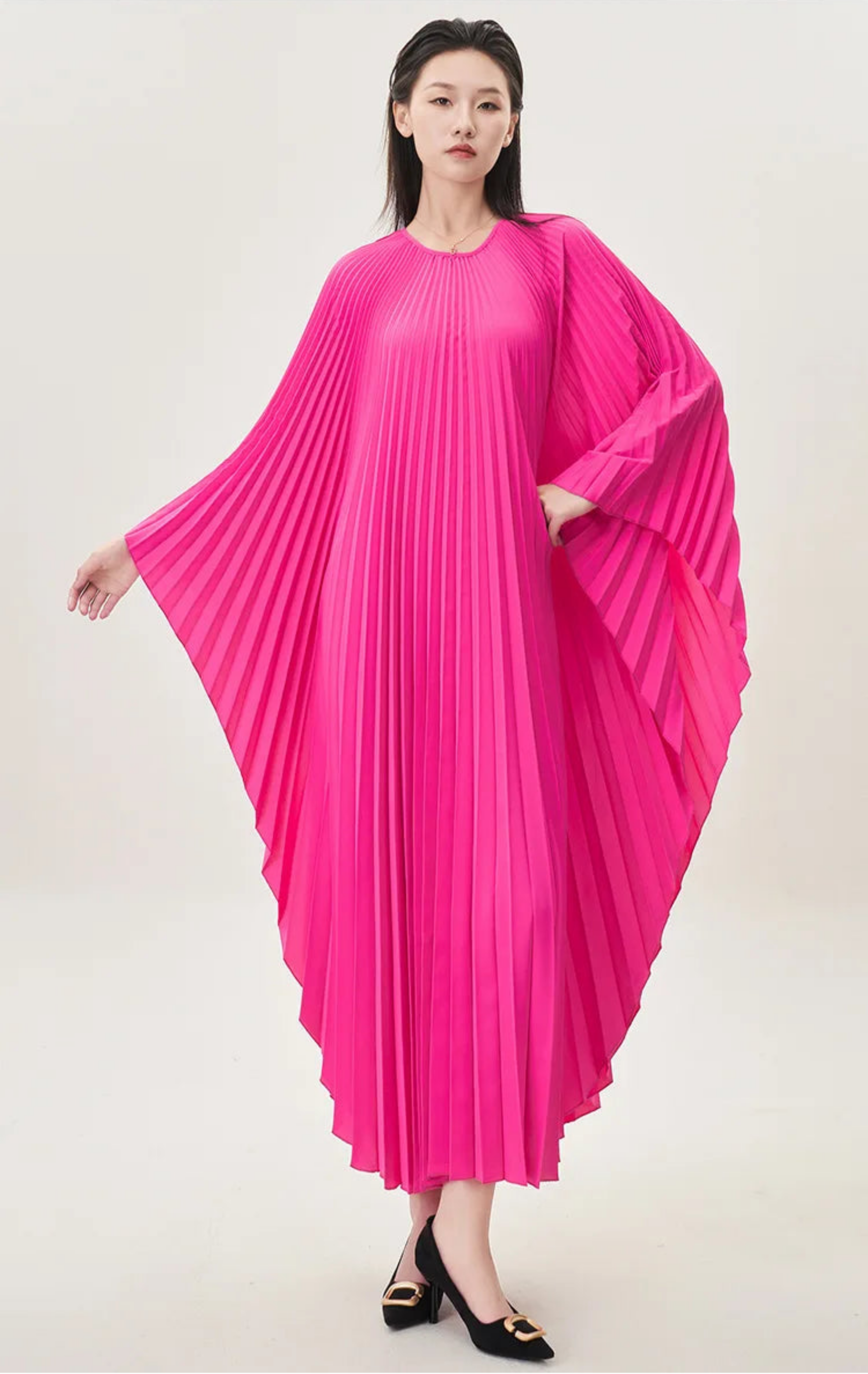 A statement piece crafted from premium Japanese plissé fabric. This flowing cape dress combines elegant movement with sculpted pleats that hold their shape beautifully.