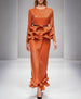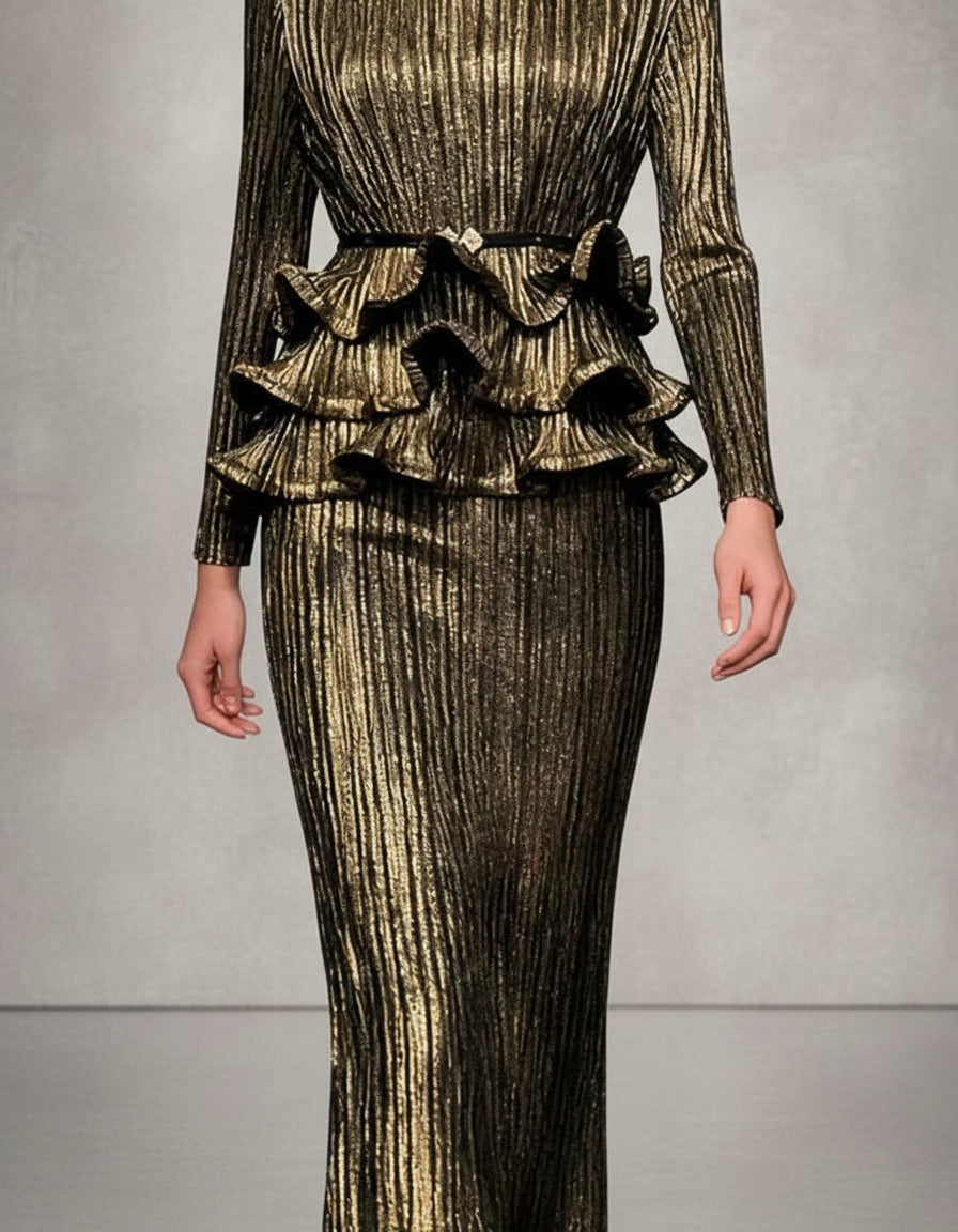This two-piece matching set features a long-sleeve peplum ruffle blouse and a midi-to-maxi peplum hem skirt with an elastic waistband.