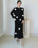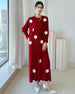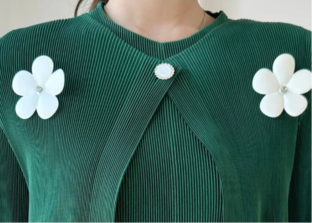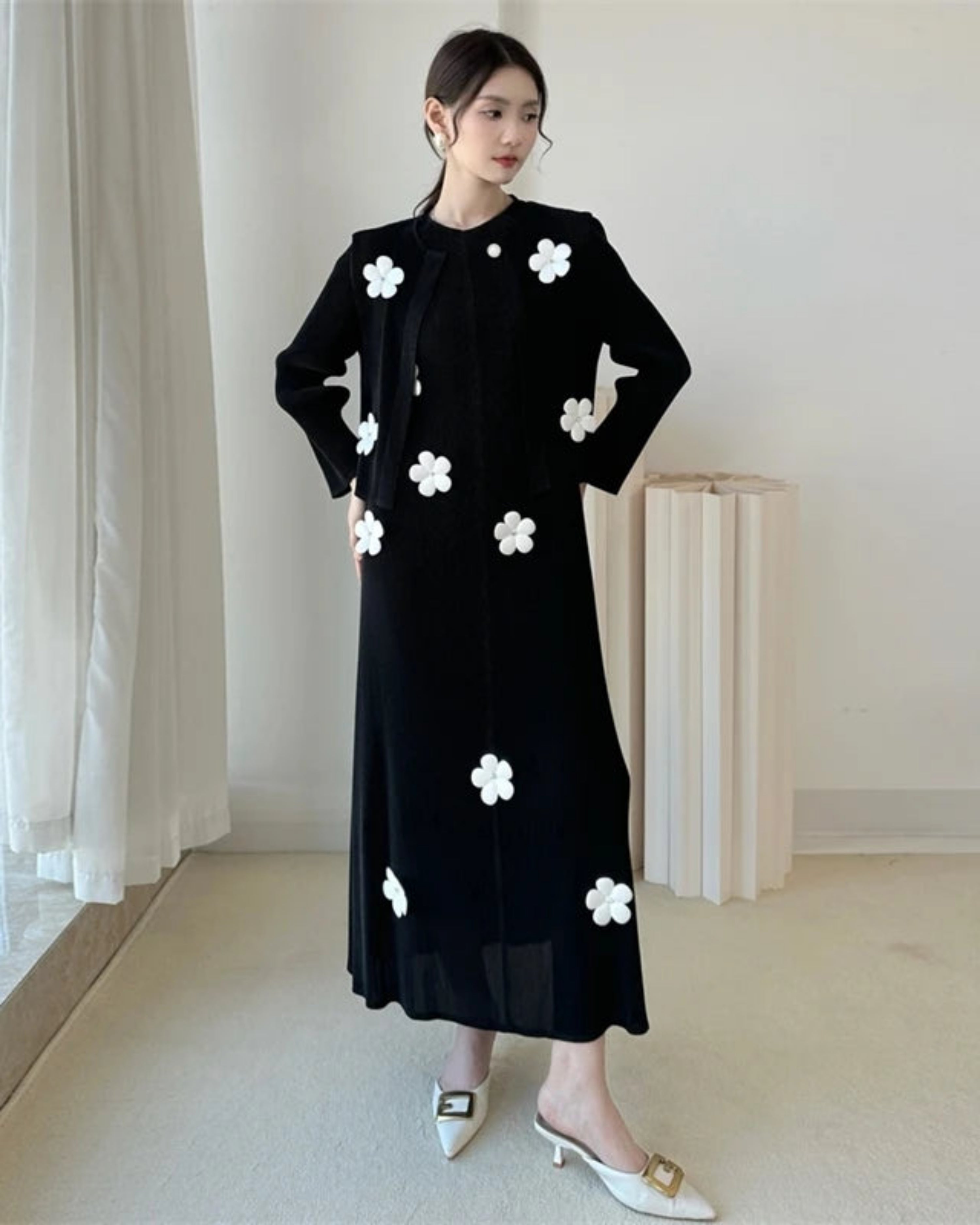 This luxurious 2-piece matching set pairs a micro-pleated midi dress with three-dimensional floral appliqués and a coordinating pleated cardigan.