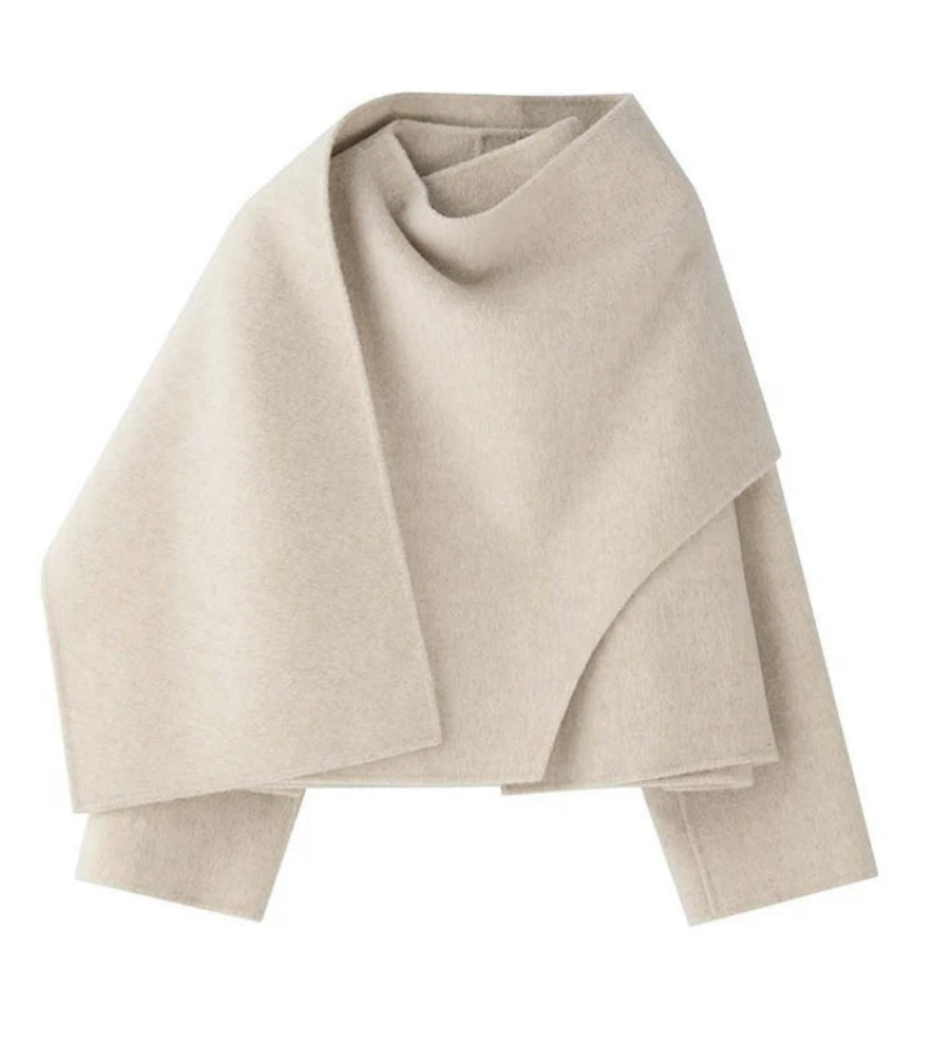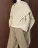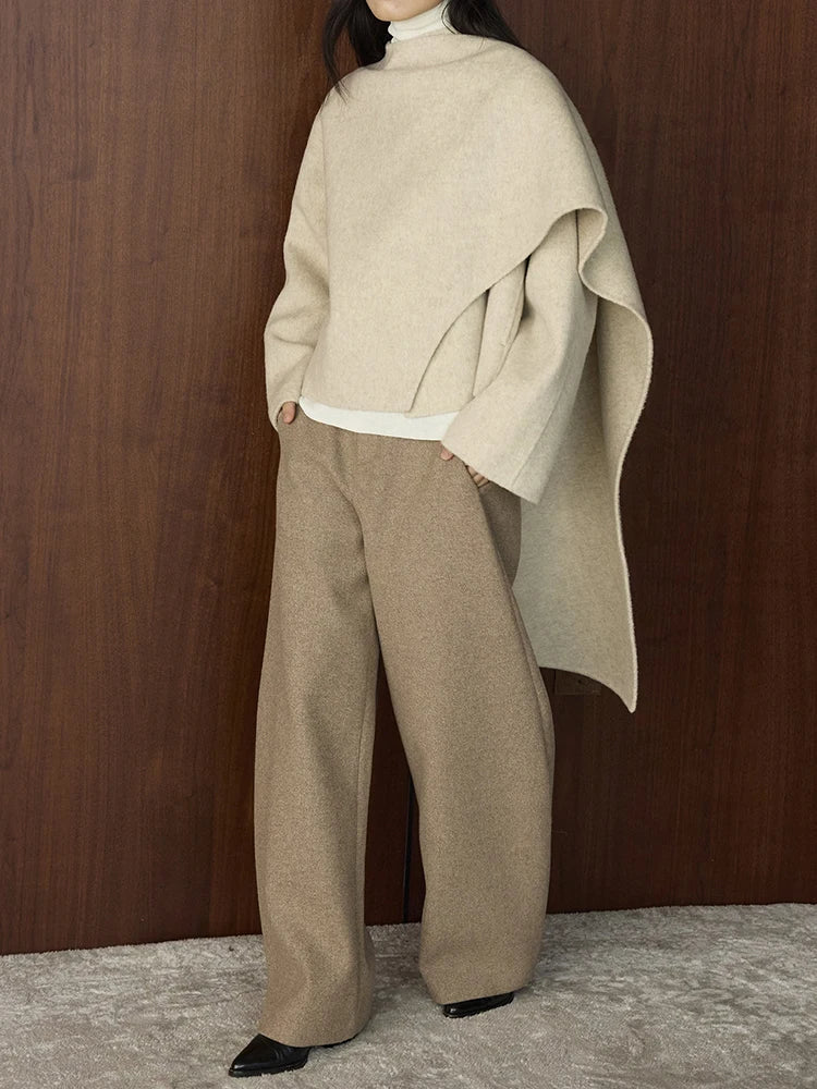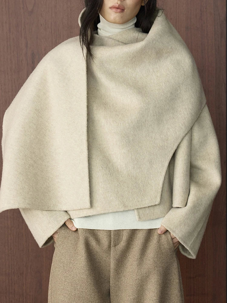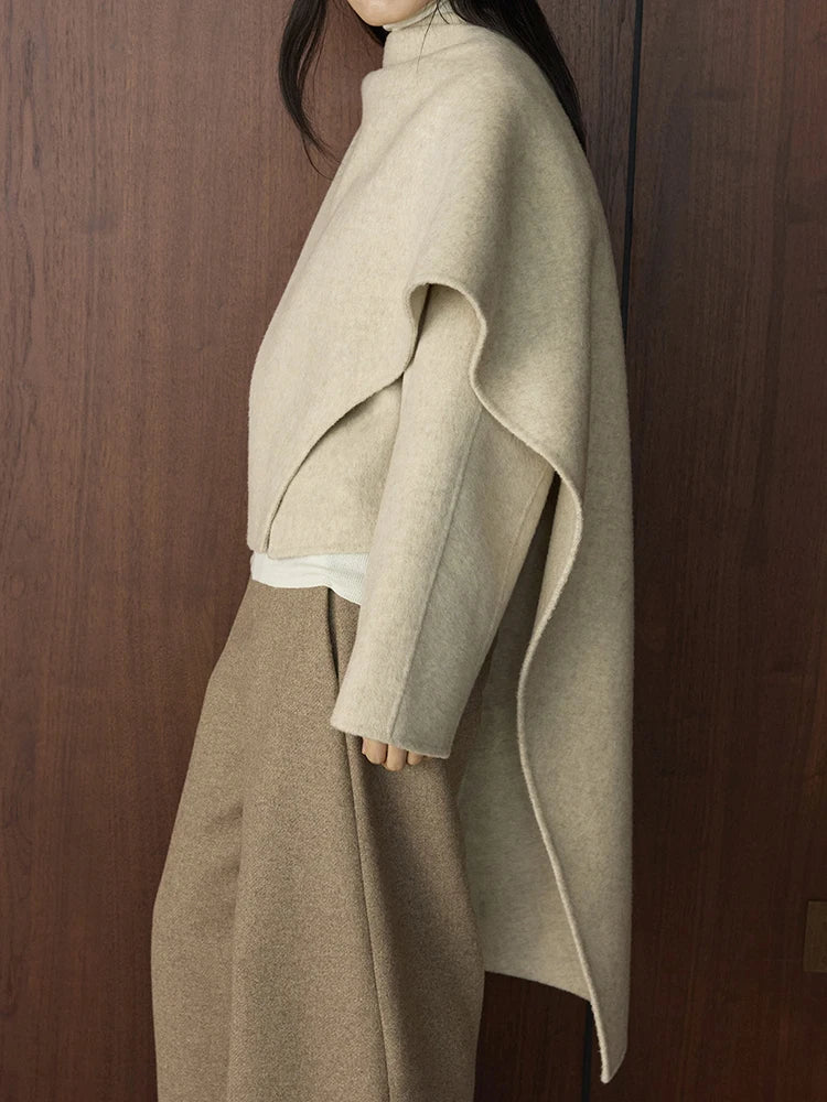 This modern, sophisticated coat features a flowing wool-blend cape silhouette with asymmetrical draping and an oversized fit.