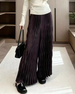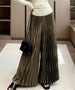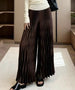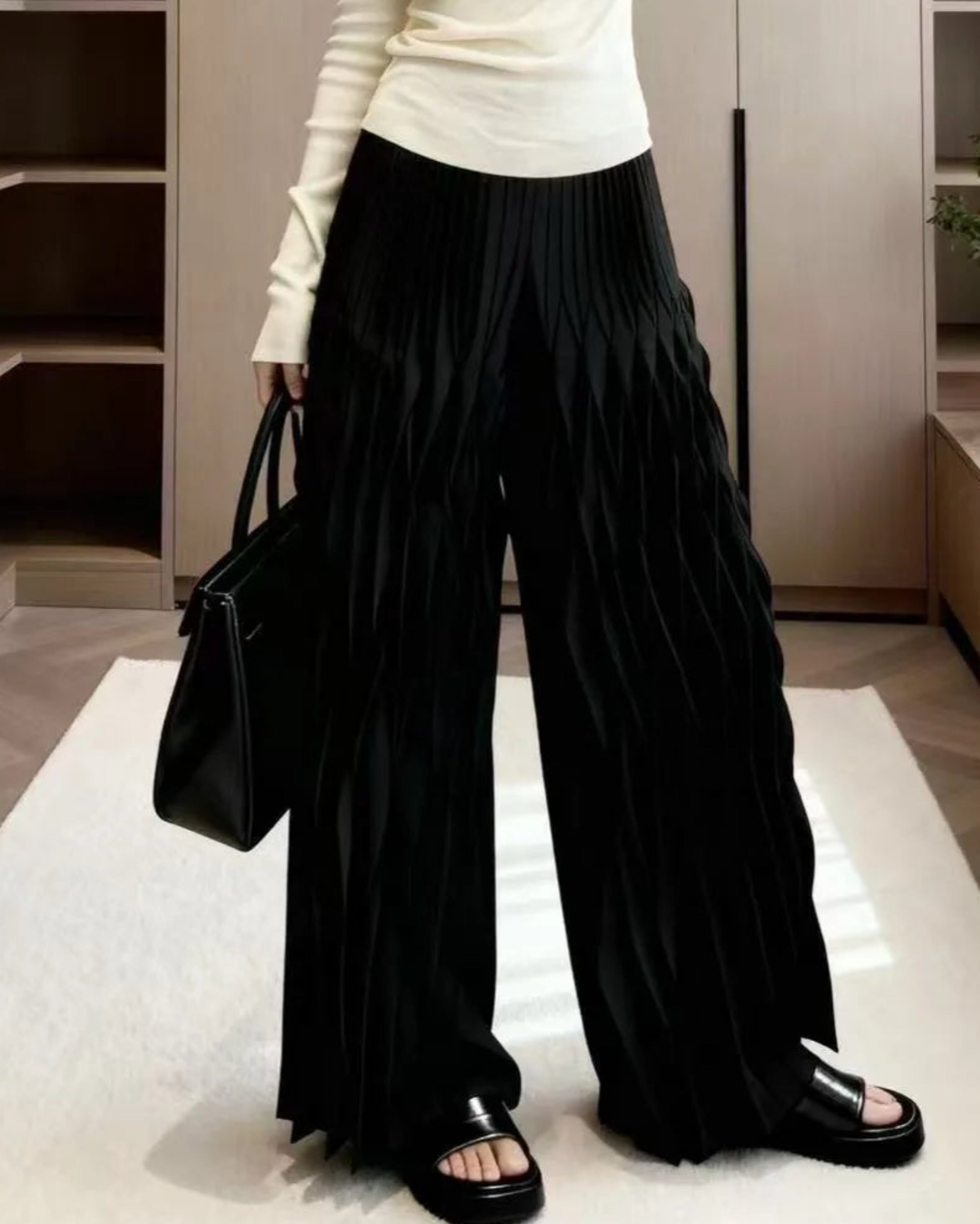 This luxurious pleated wide-leg pant features a high-waisted fit with an elastic waistband for comfort and style.