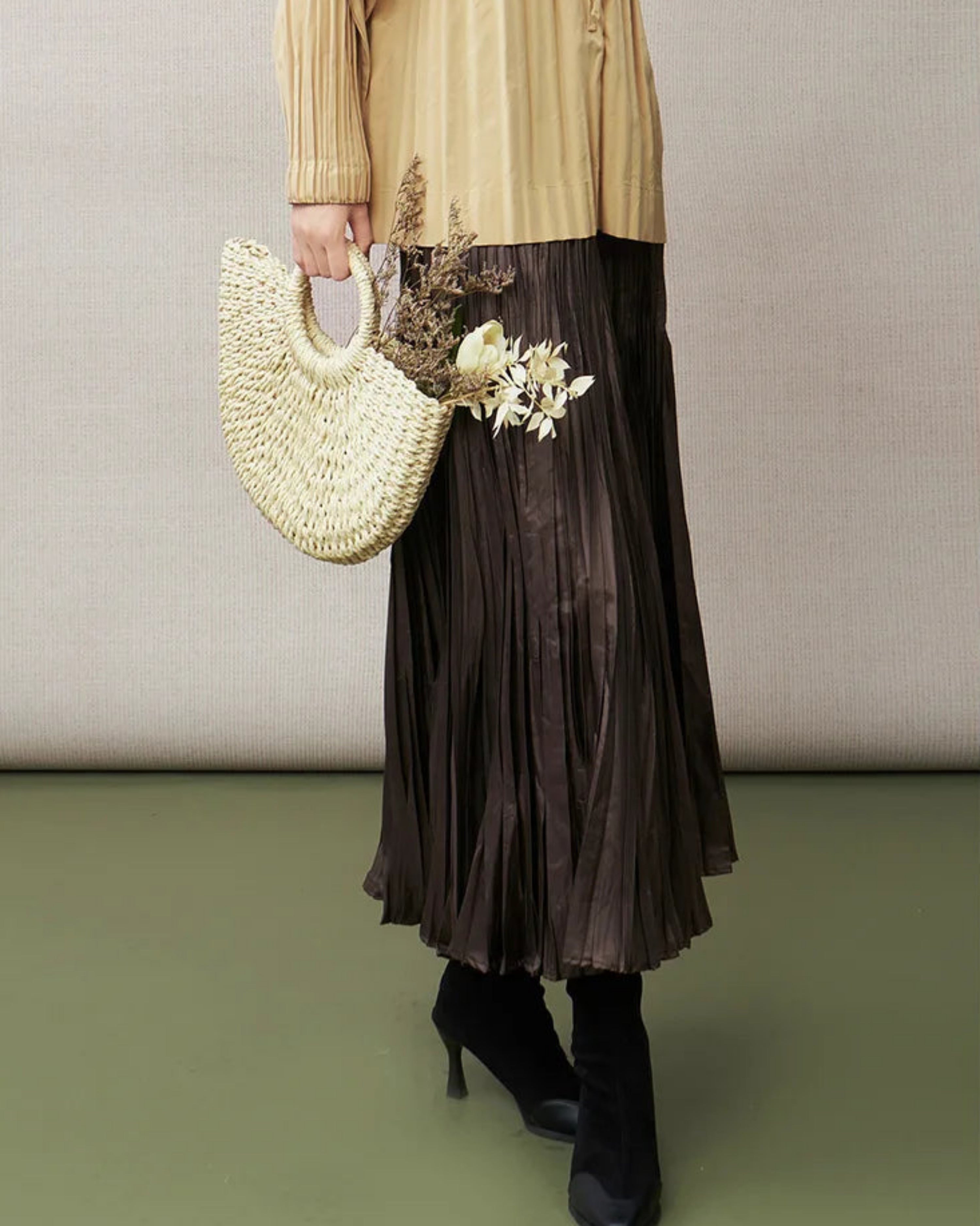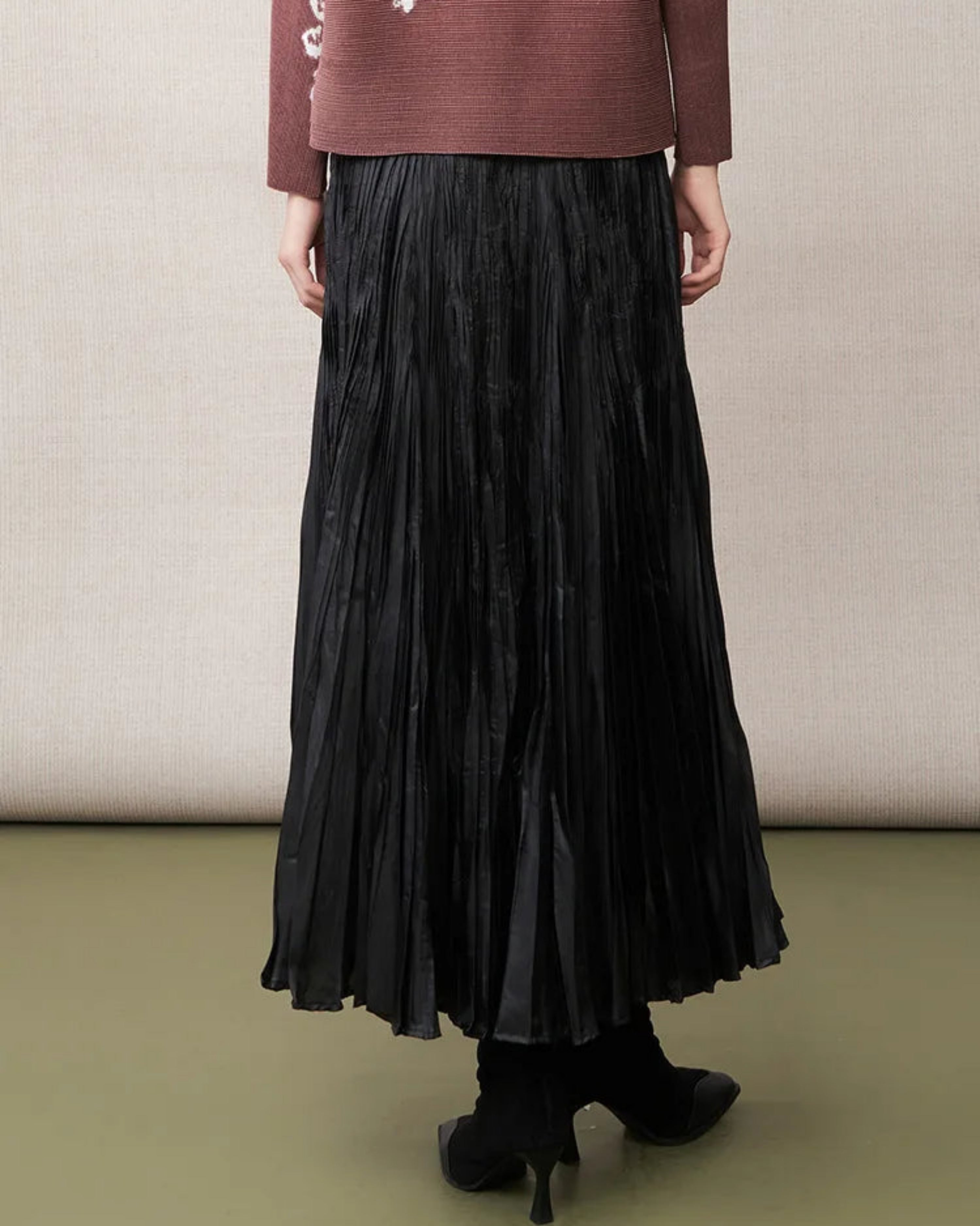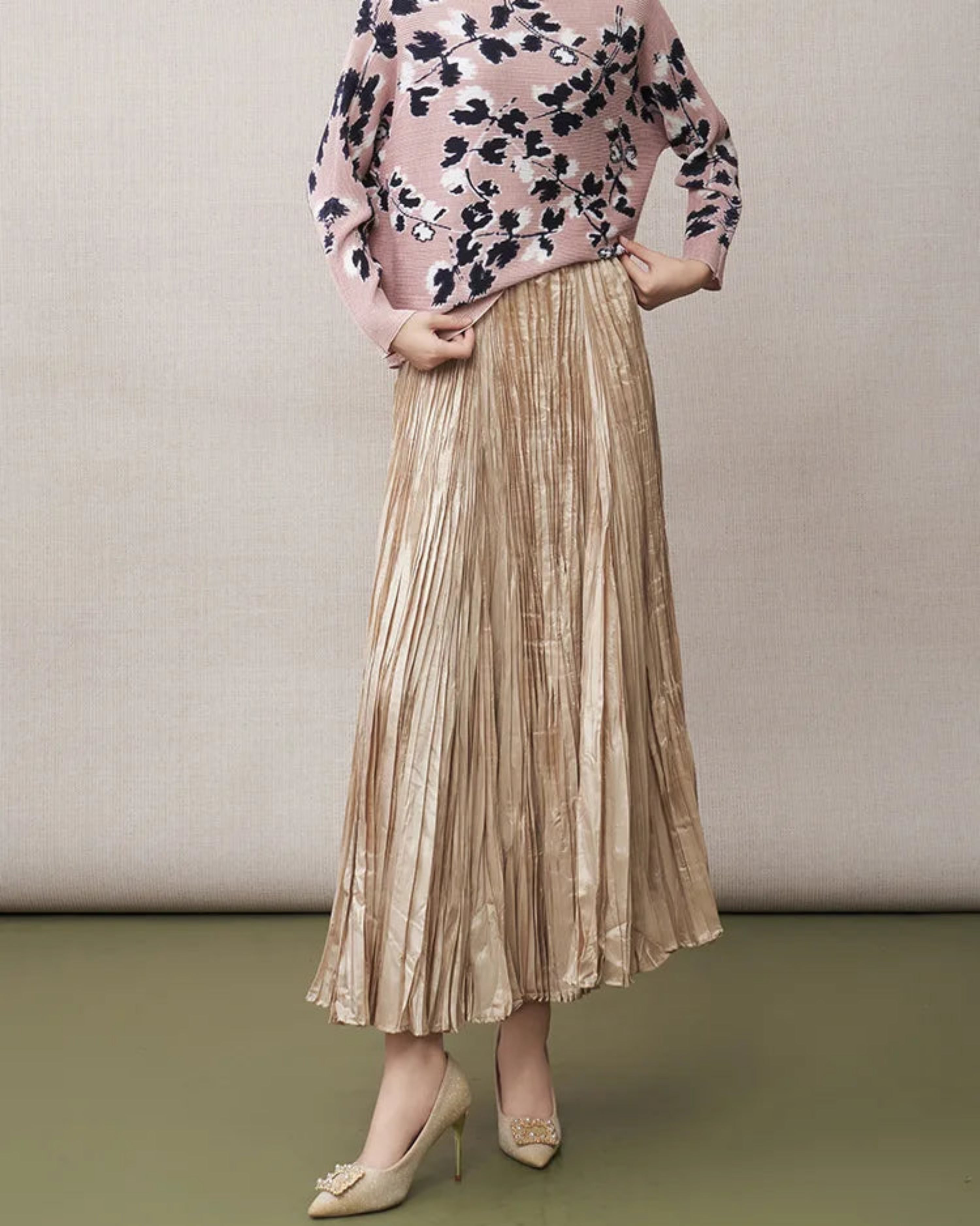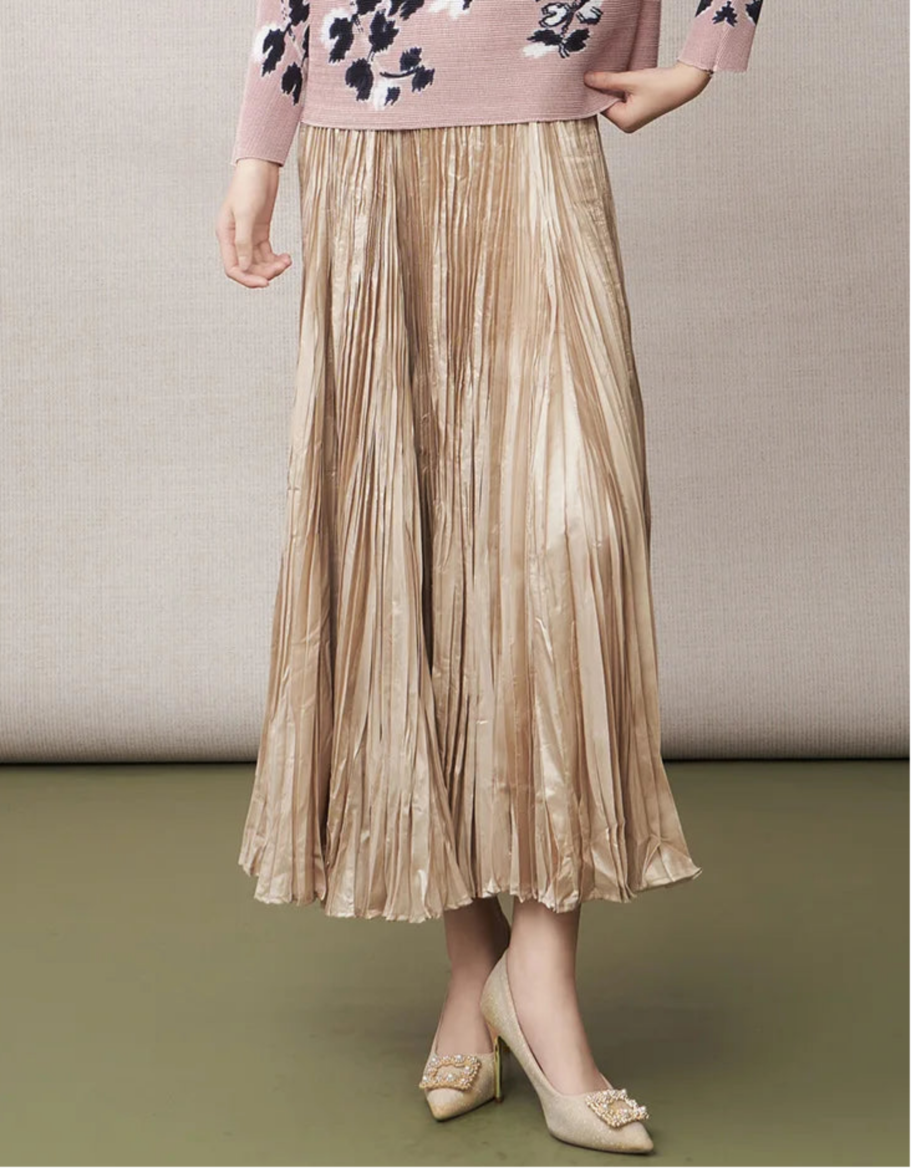 Accordion pleats with subtle crinkle and sheen create a flowing, relaxed fit to just above the ankle. Perfect for work, travel, resorts, formal events, vacations, or luxurious everyday wear.