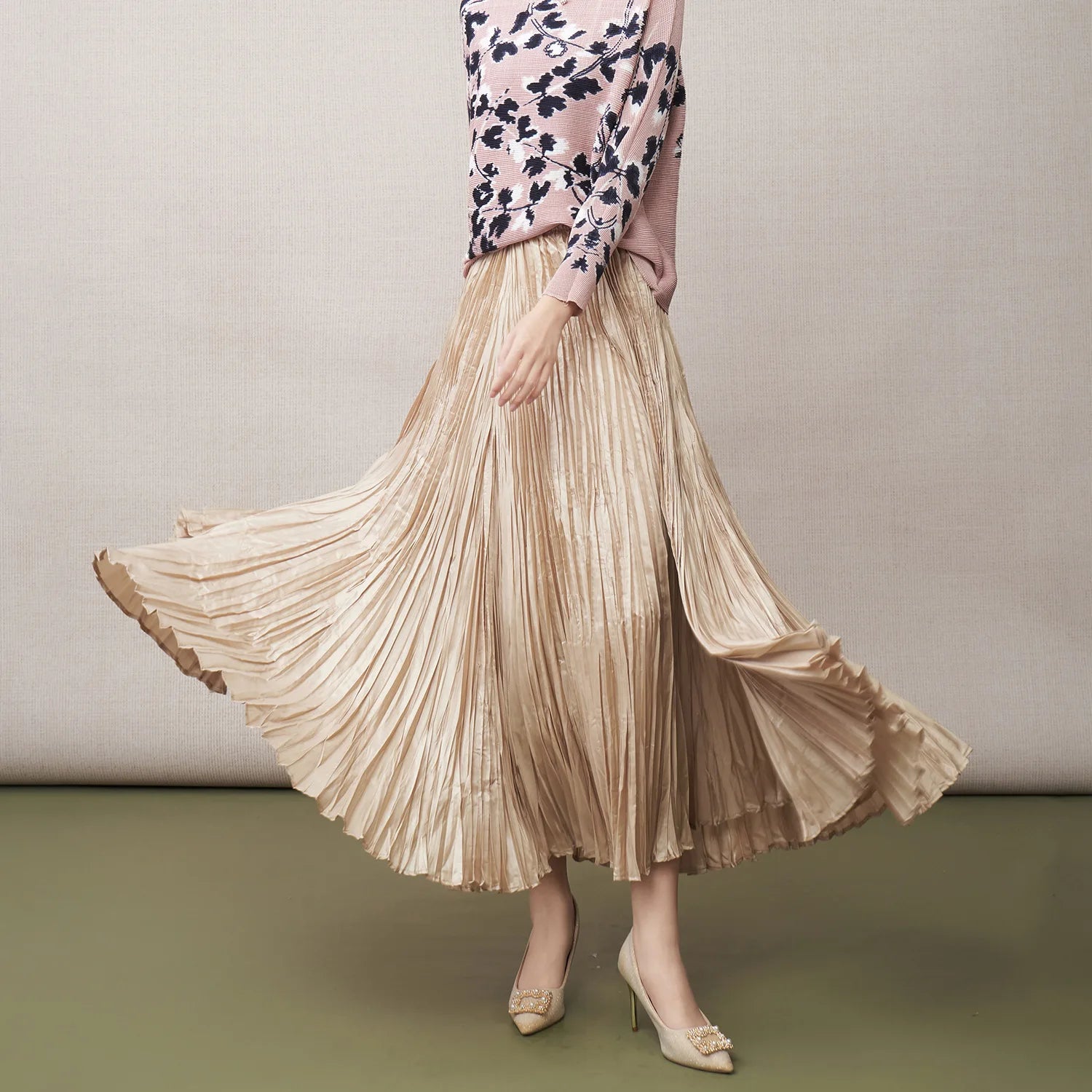 High-waisted A-line midi skirt in premium Japanese pleated fabric with stretch and wrinkle-resistant finish — no ironing needed.