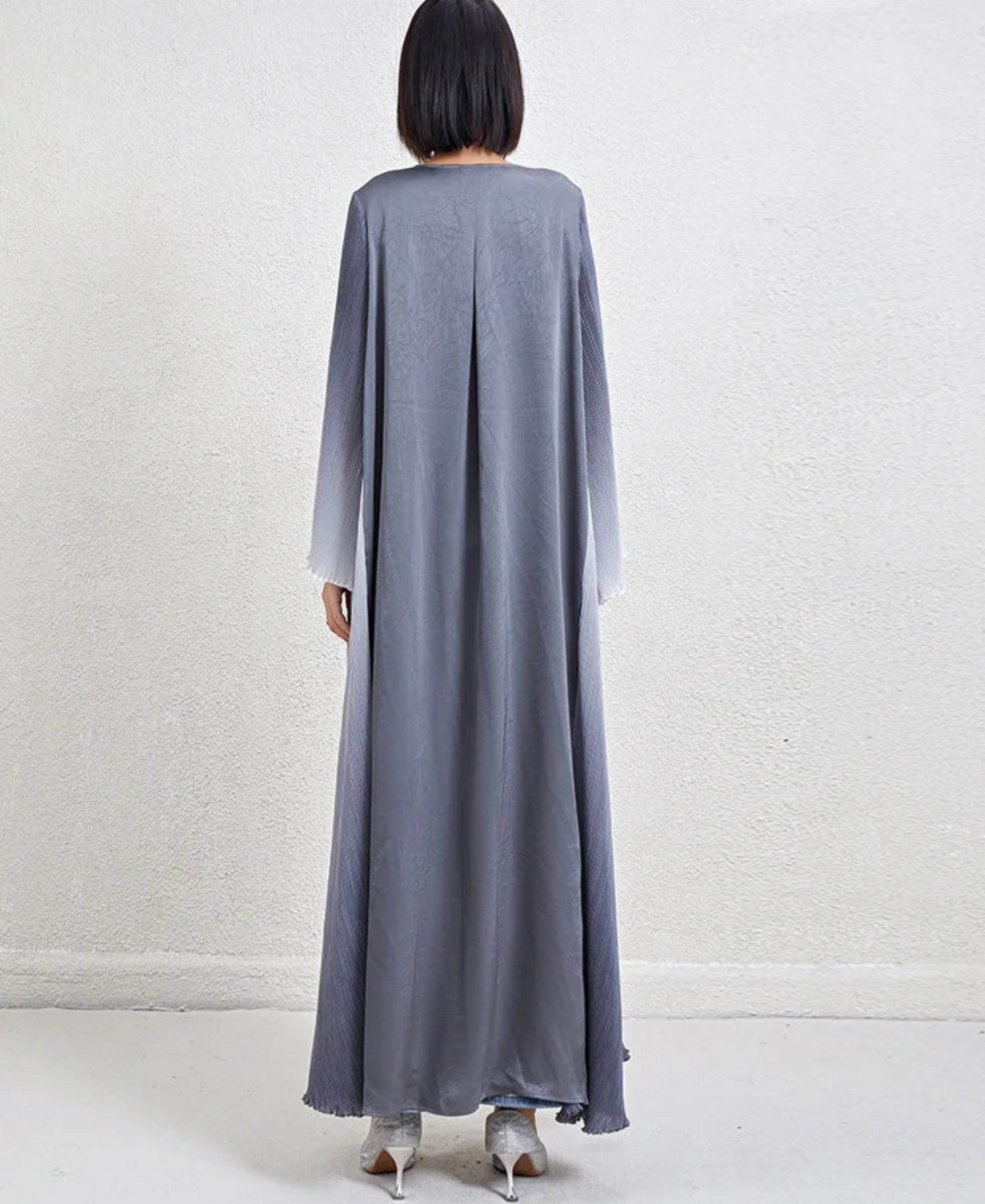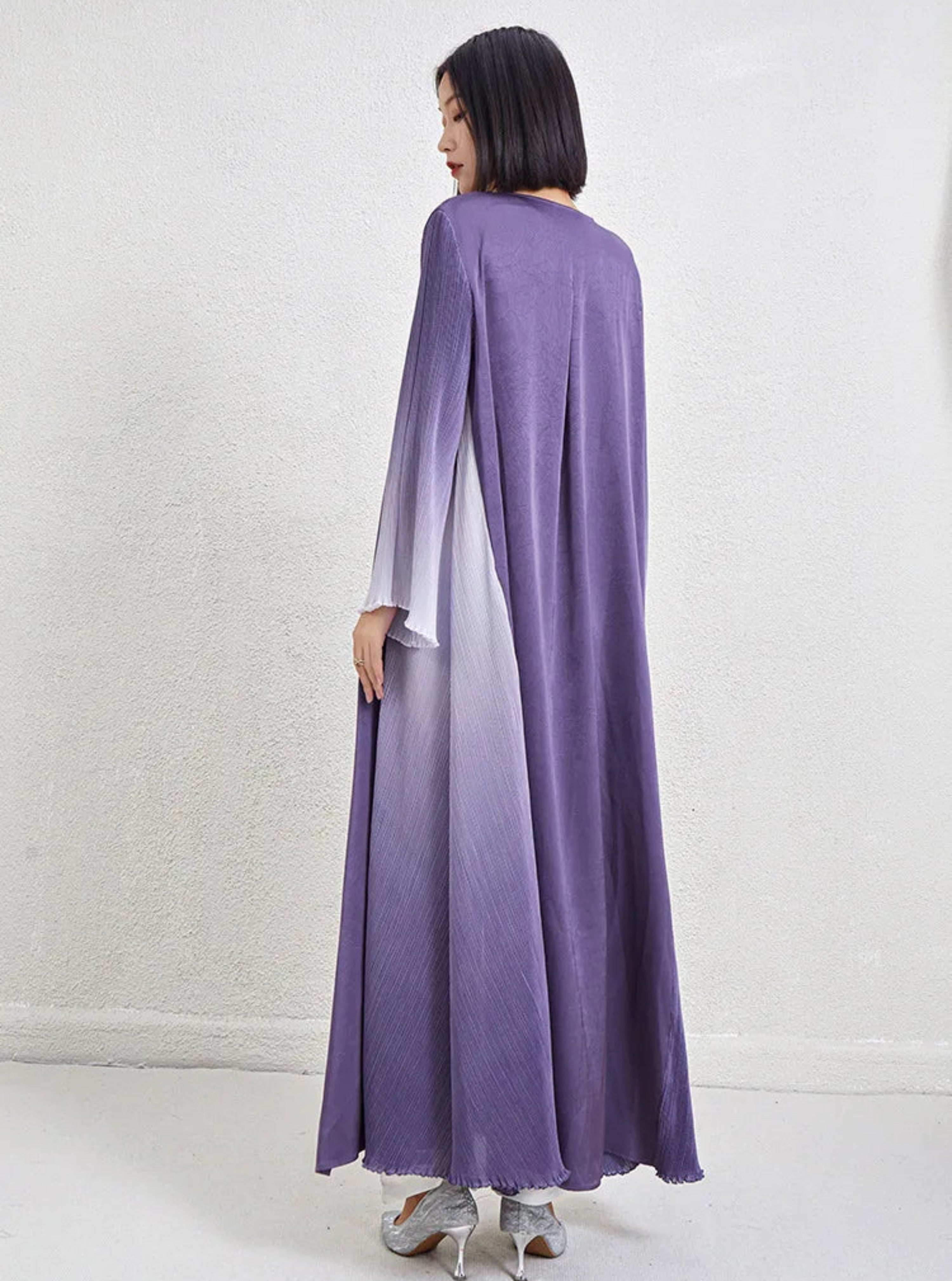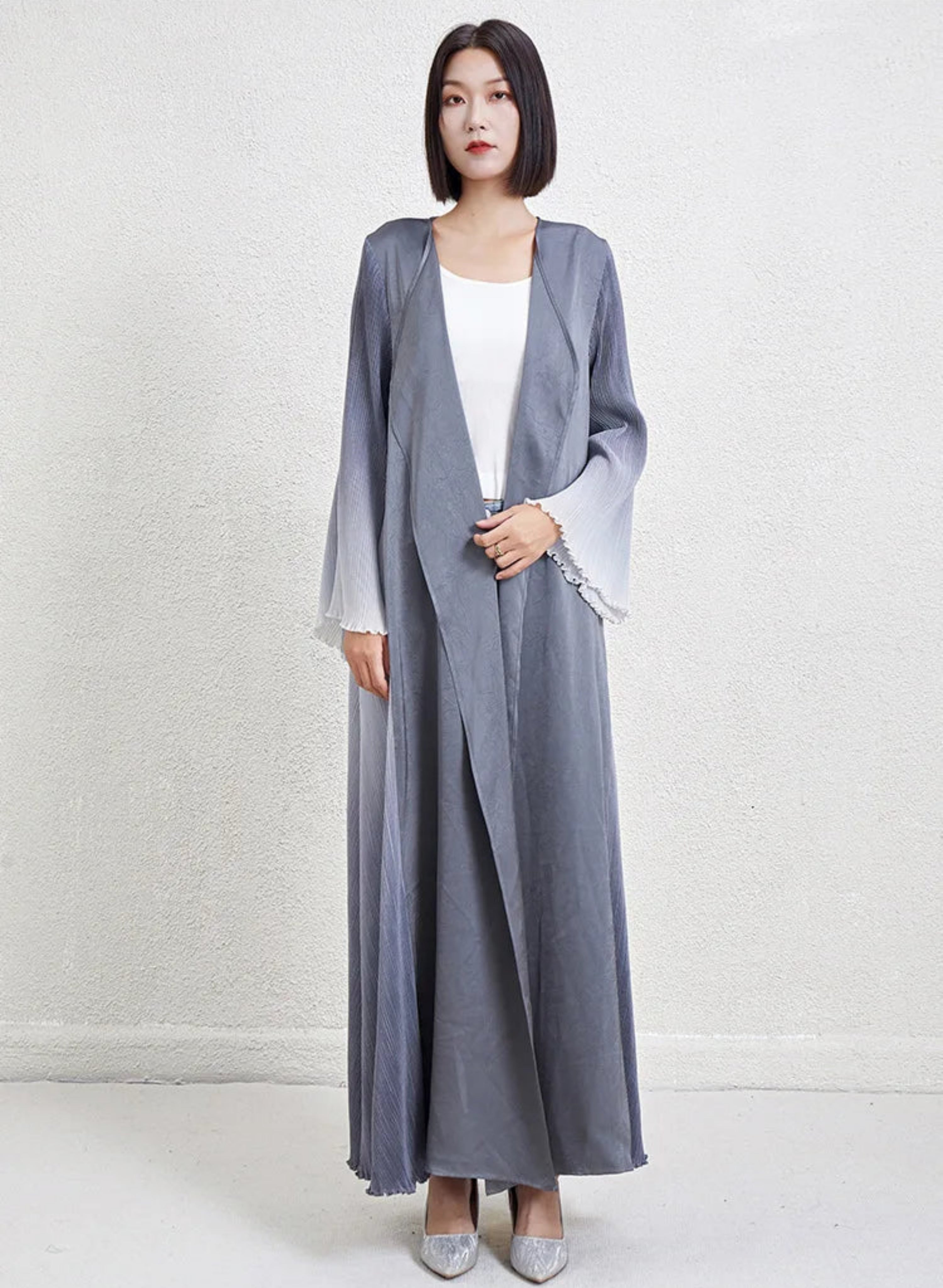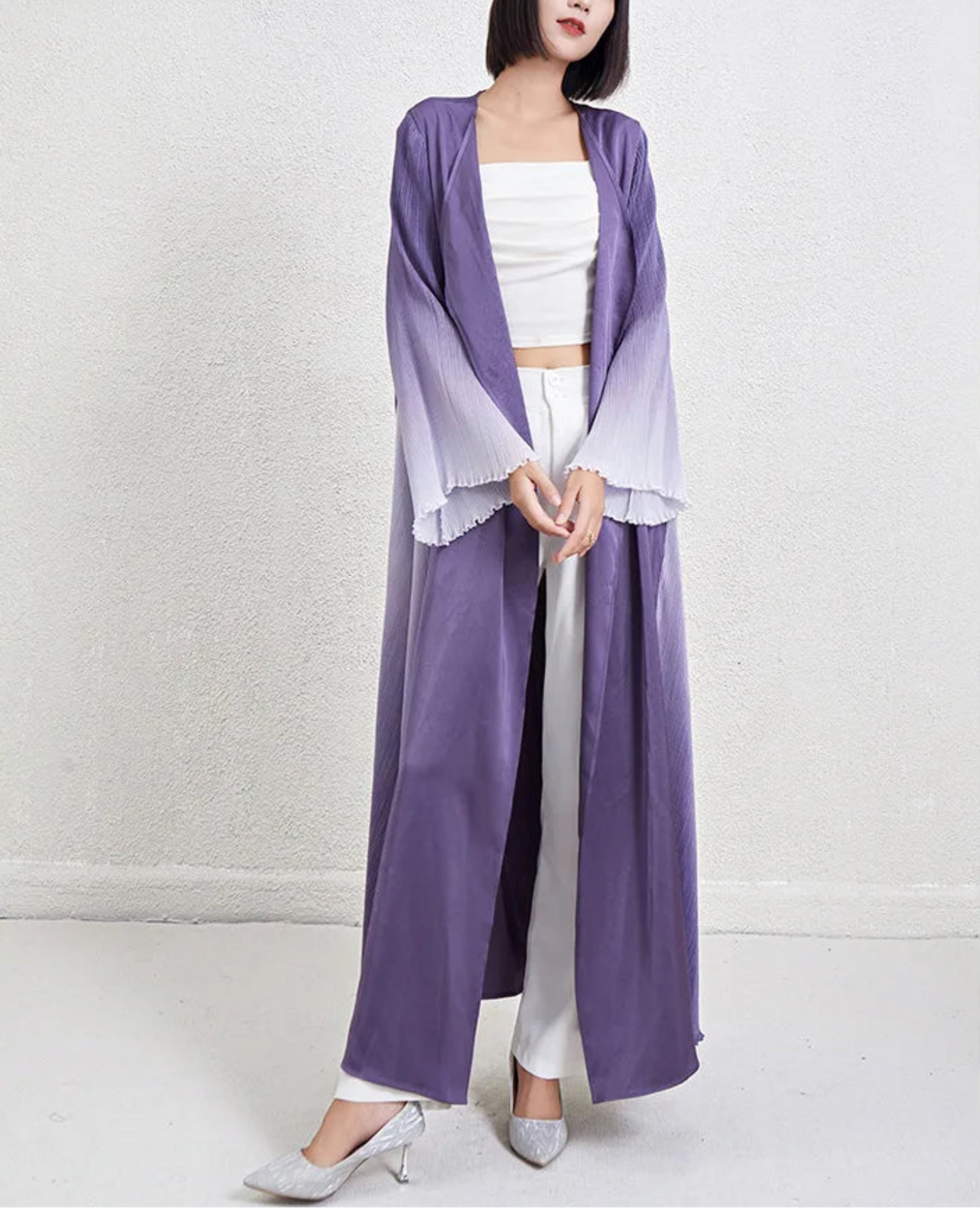 This luxurious longline cardigan features premium Japanese plissé pleats with a relaxed, flowing silhouette and dramatic bell sleeves. Wrinkle-resistant, lightweight, and stretchy, it combines elegance and comfort for both casual and formal occasions.