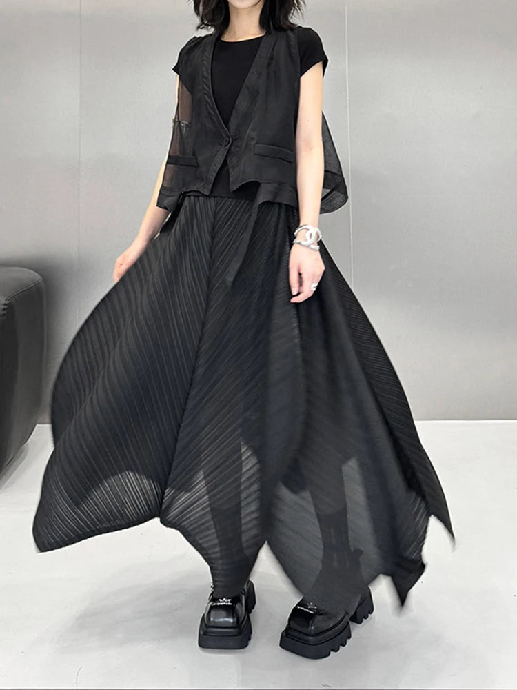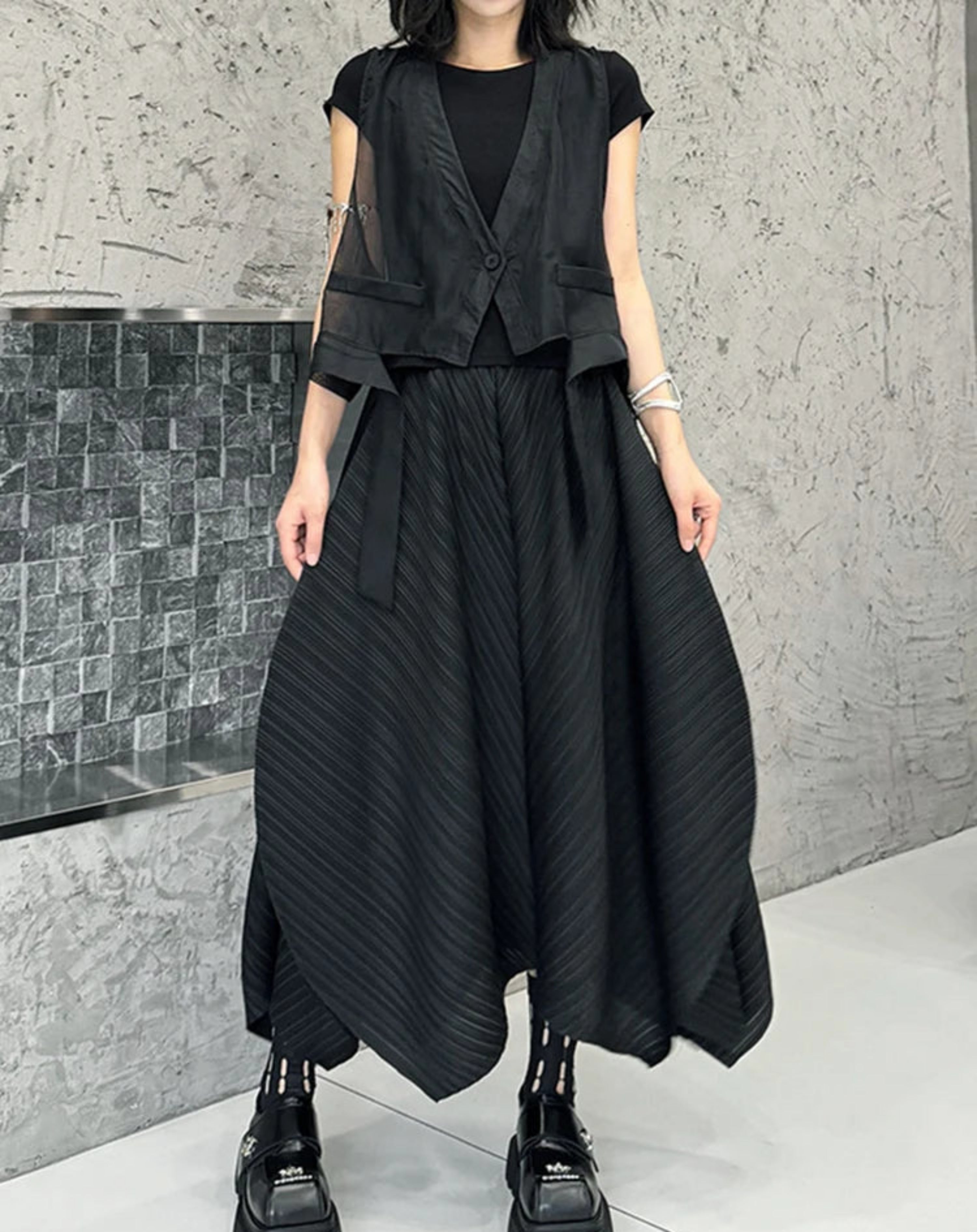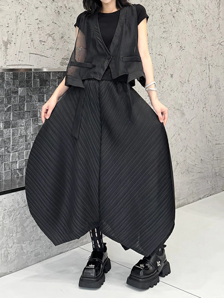 Luxury Japanese plissé fabric with stretch and wrinkle-resistant finish — no ironing needed. Lightweight, quick-dry, and anti-pilling, it drapes in an asymmetric silhouette with an elastic pull-on waistband.