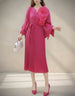 Fluid bell sleeves add movement. Premium Japanese plissé fabric is stretchy, wrinkle-resistant, and never needs ironing — perfect for formal nights, weddings, and travel.