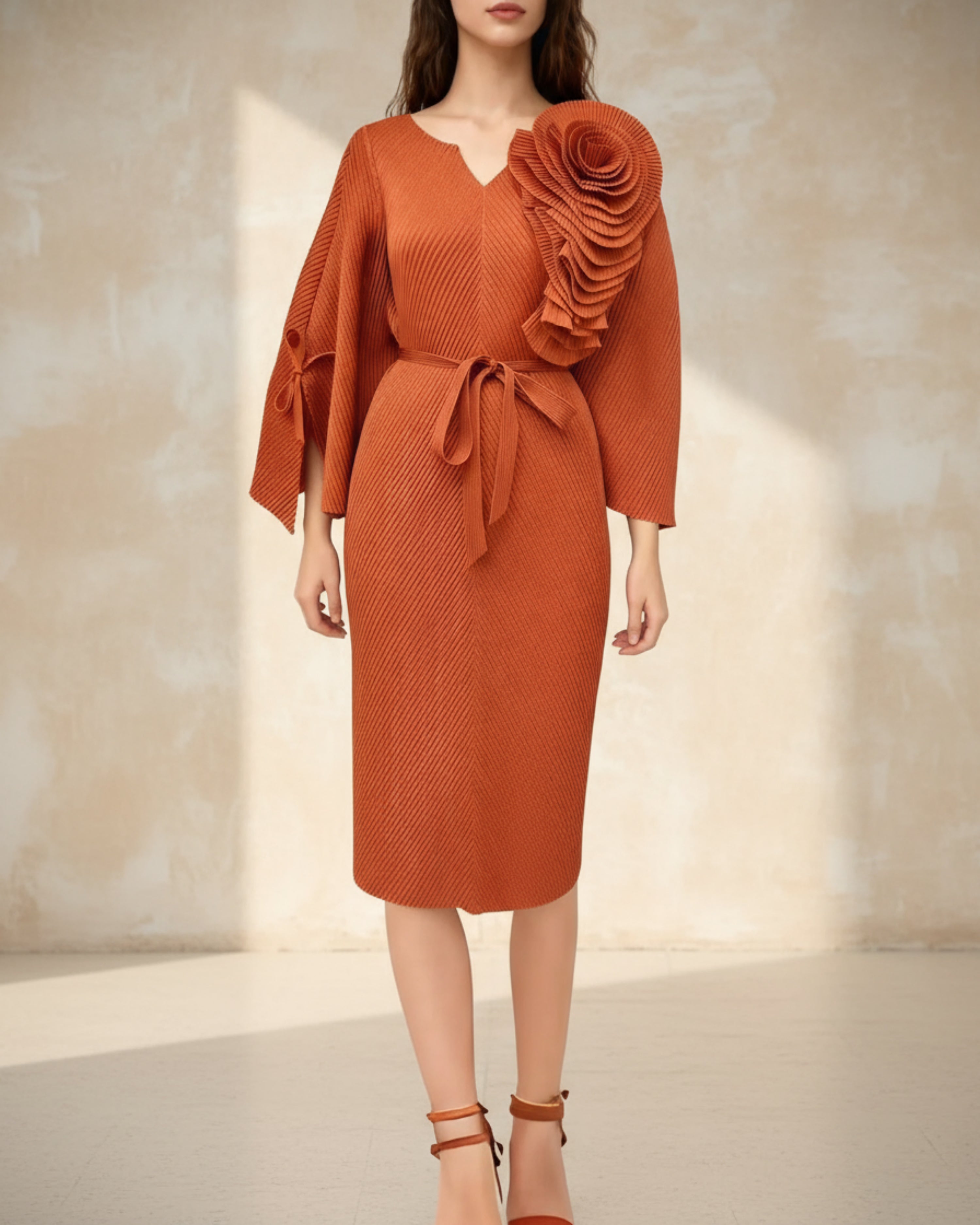 Inspired by Japanese pleating, this midi dress features a sculptural floral shoulder, V-neckline, and self-tie belt.