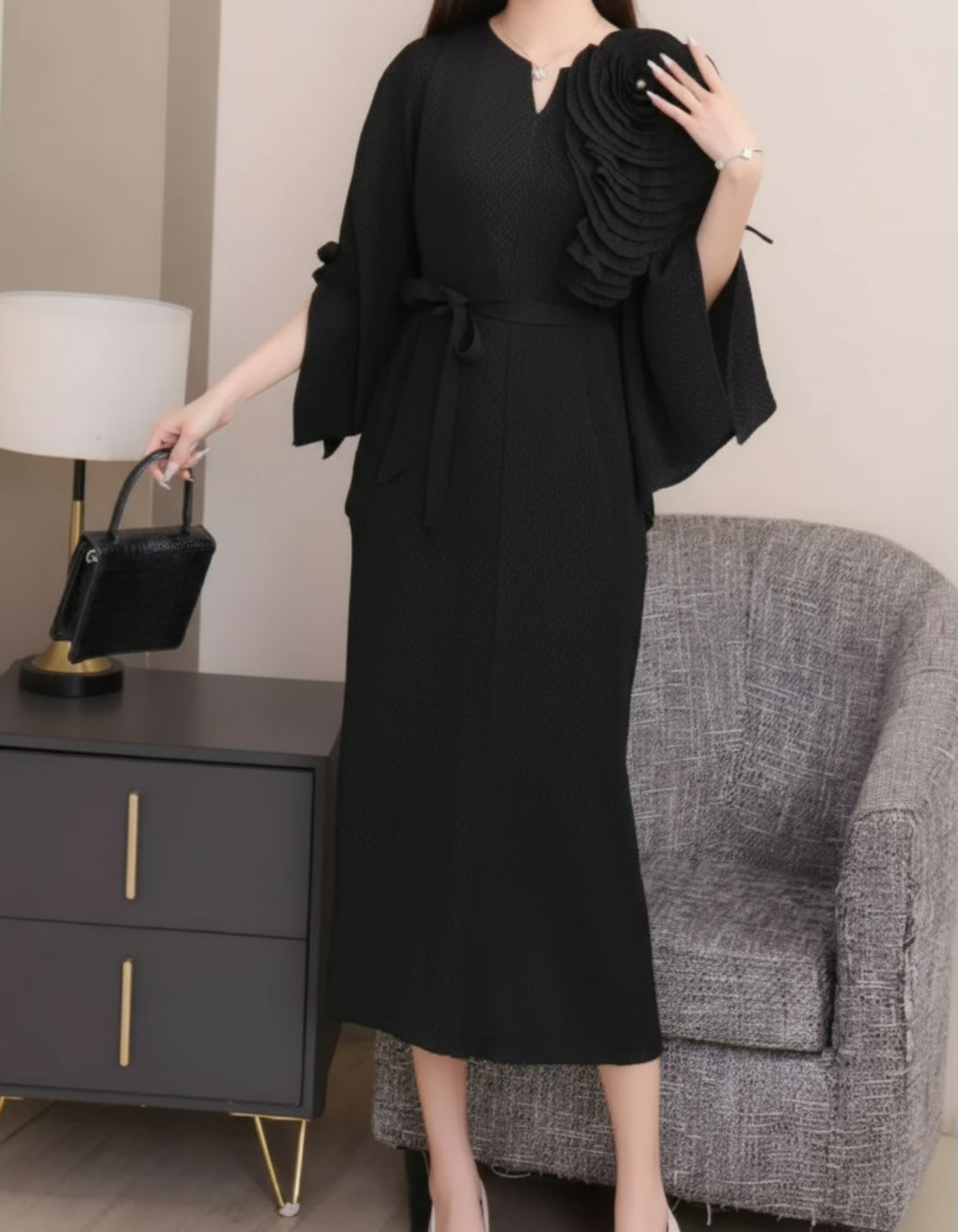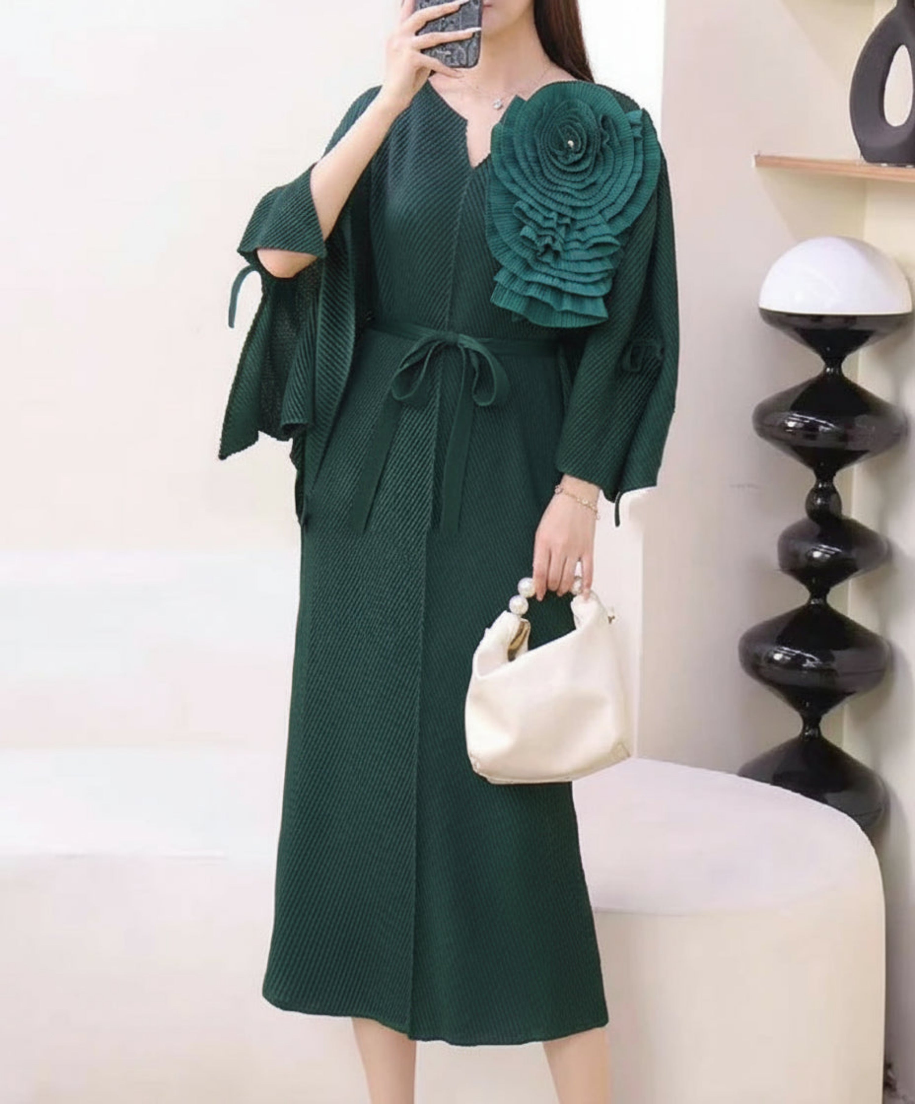 Luxury Plissé Pleats Pleated Midi Dress – Sculptural Floral Shoulder Detail