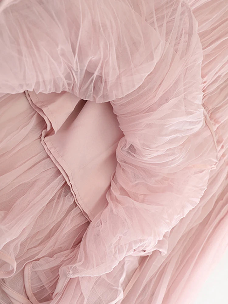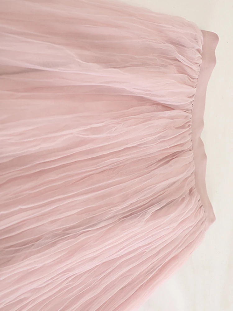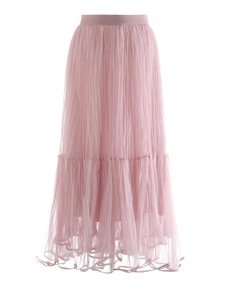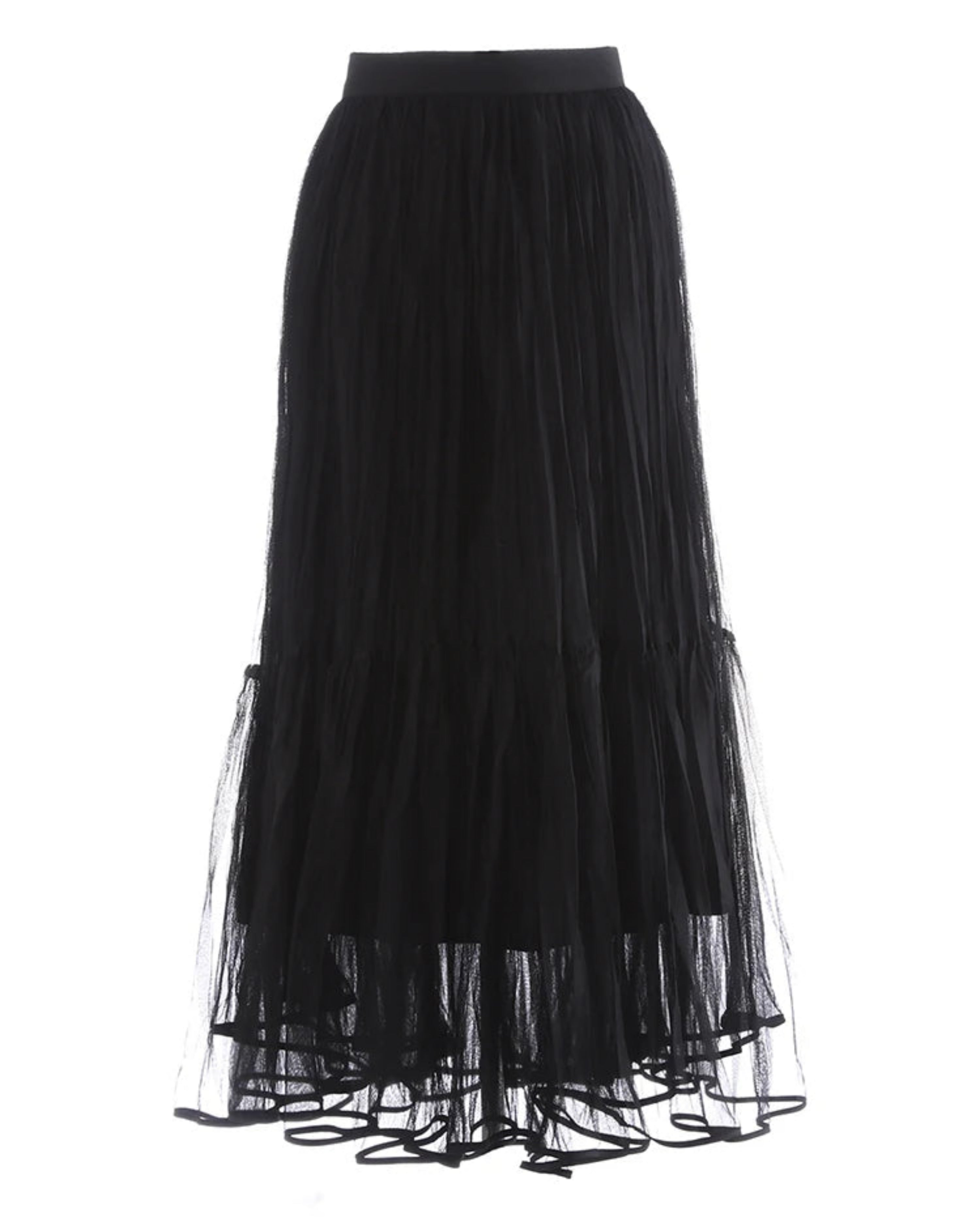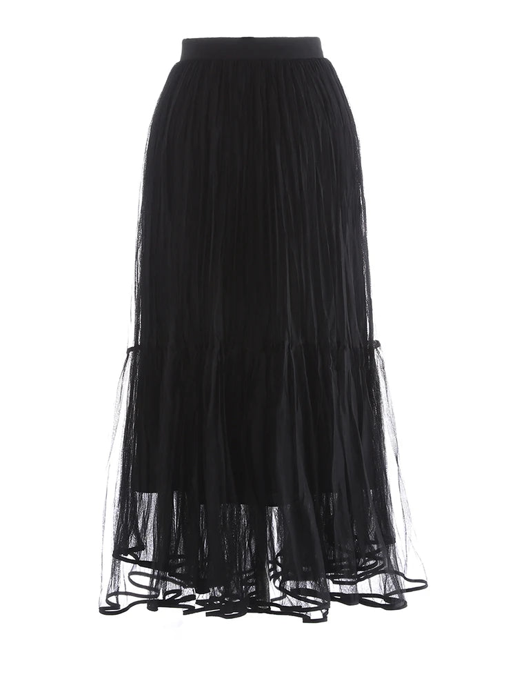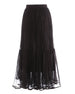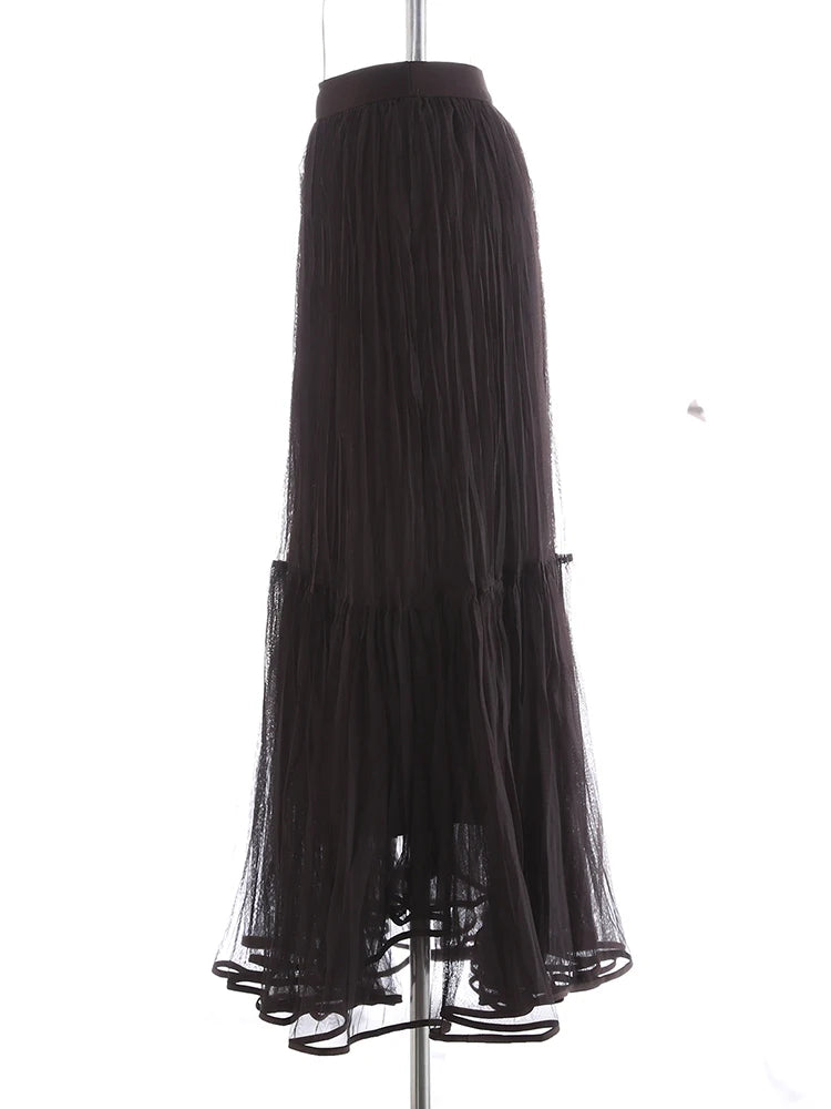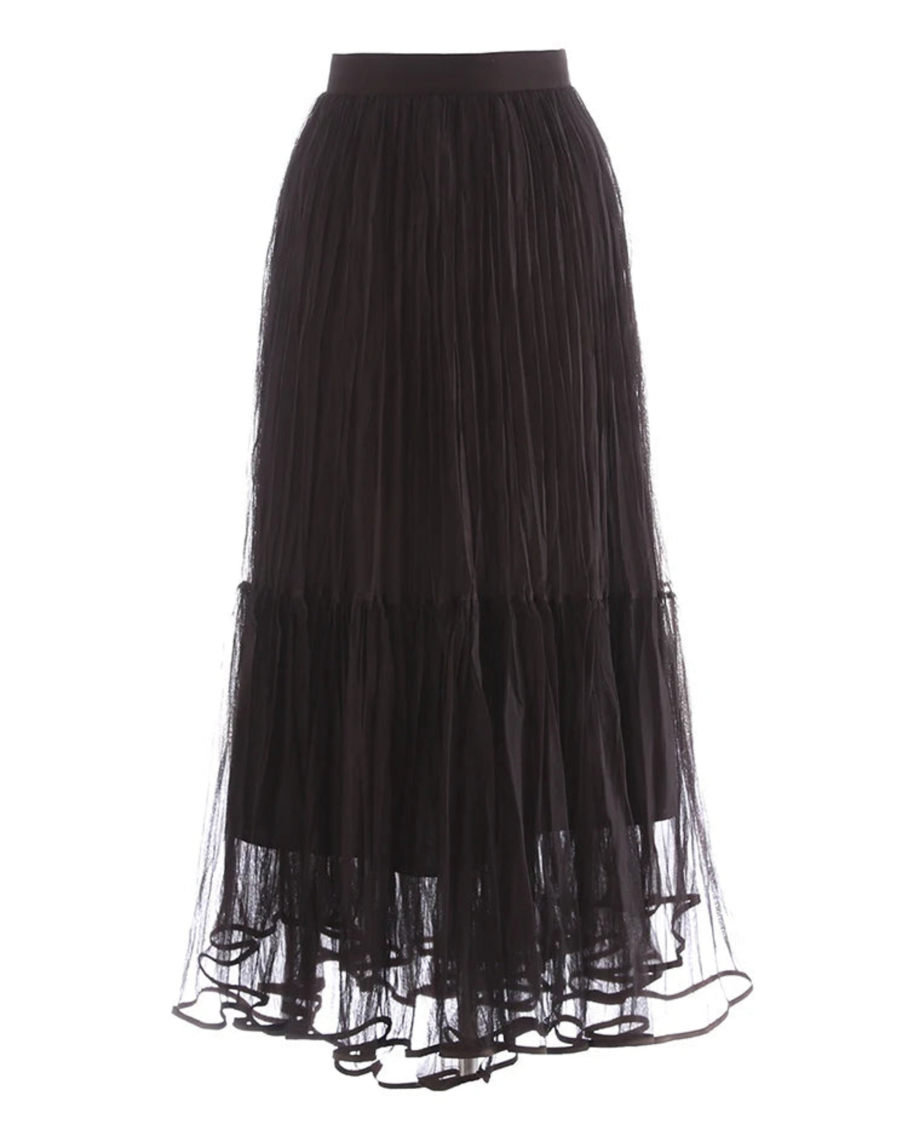 This elegant tiered tulle maxi skirt features a pull-on style with an elastic waistband for comfort and graceful movement.
