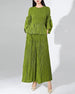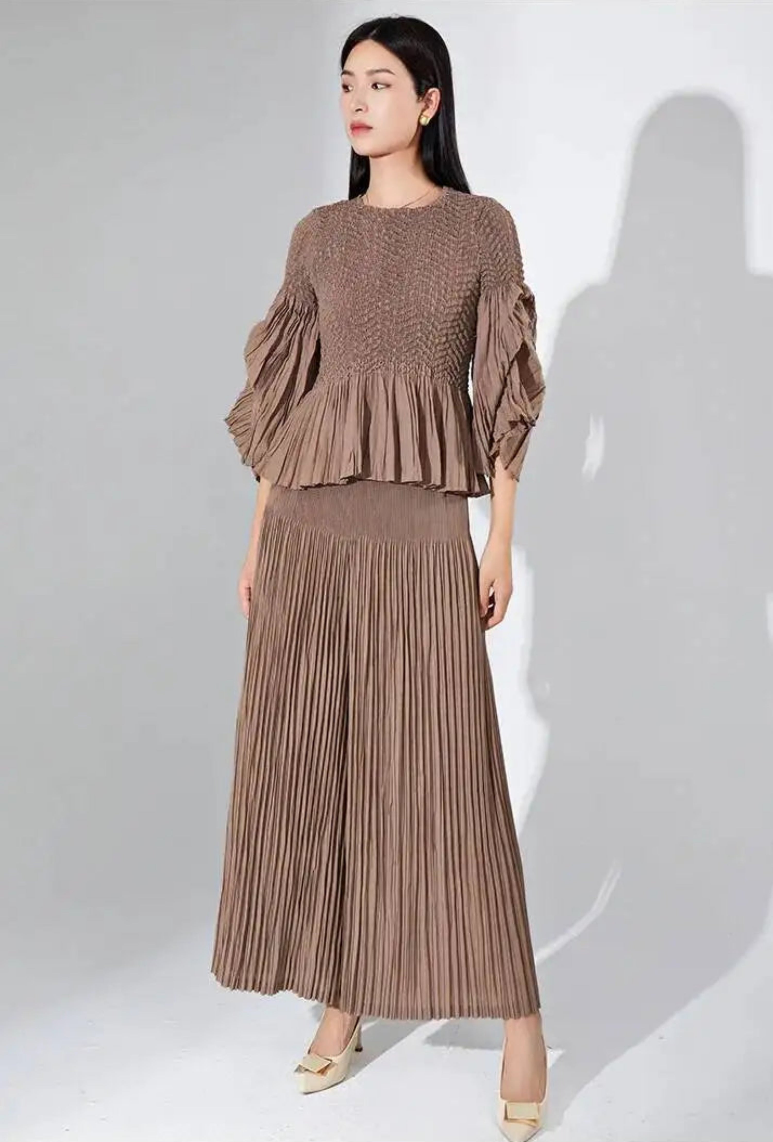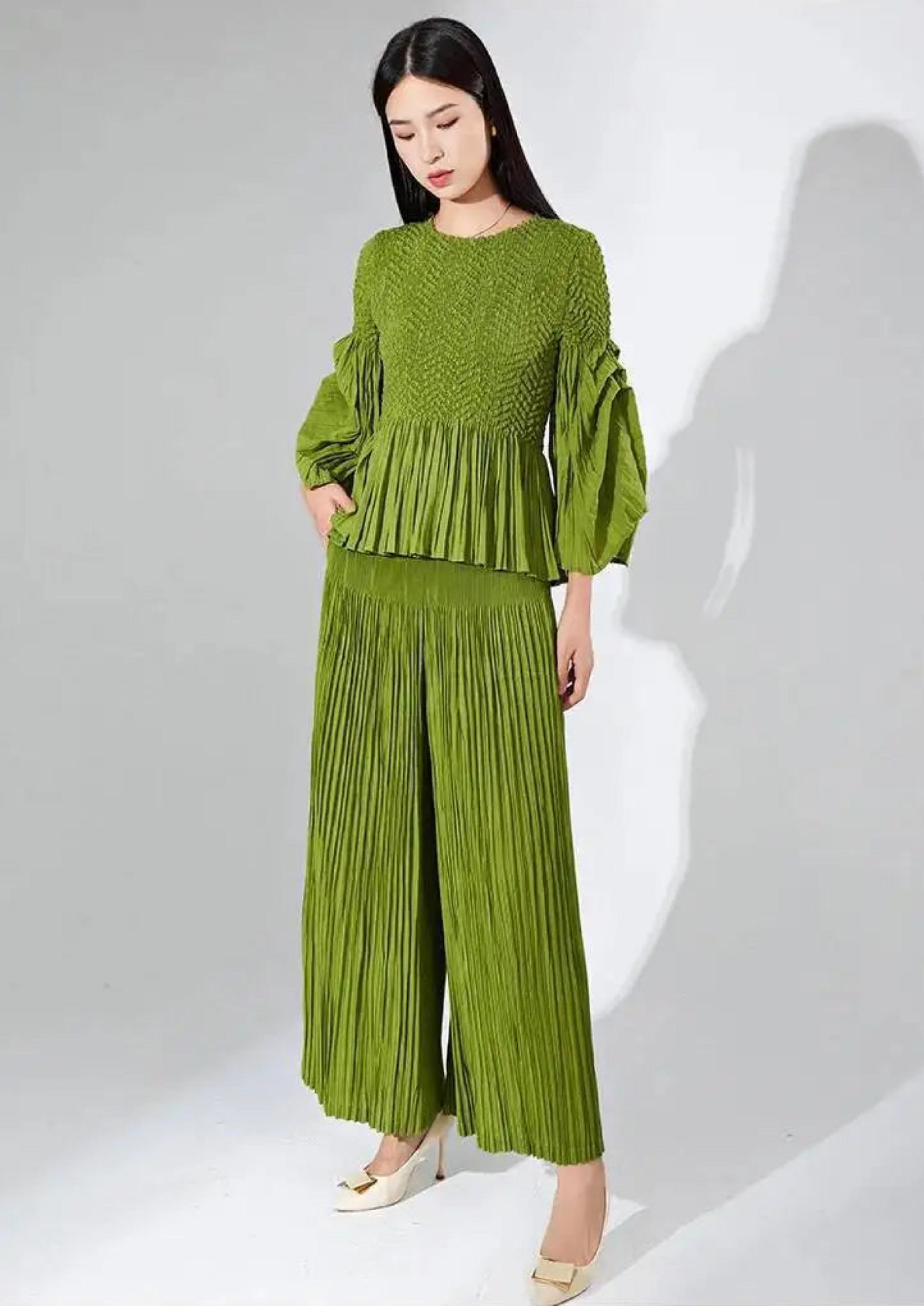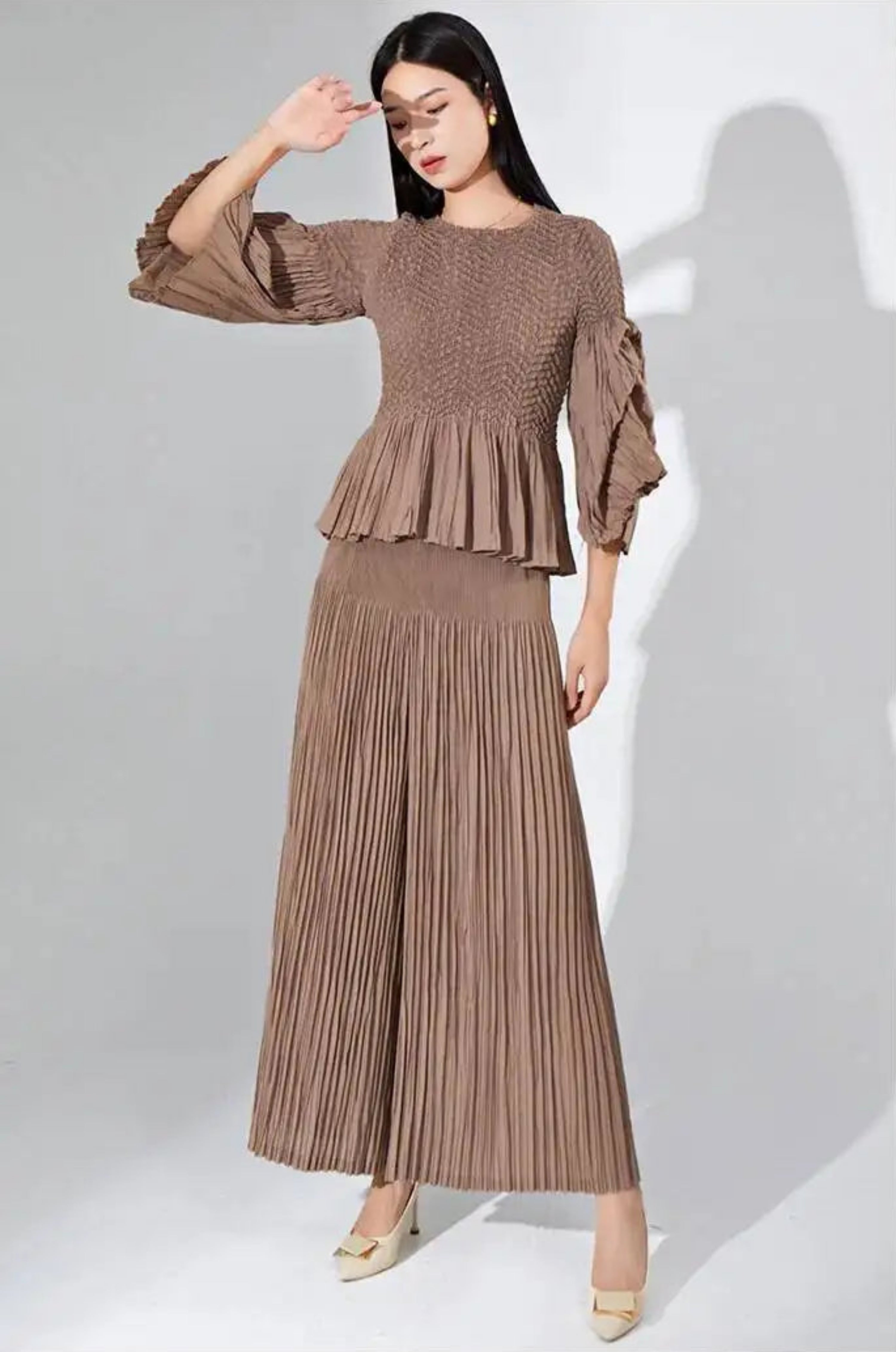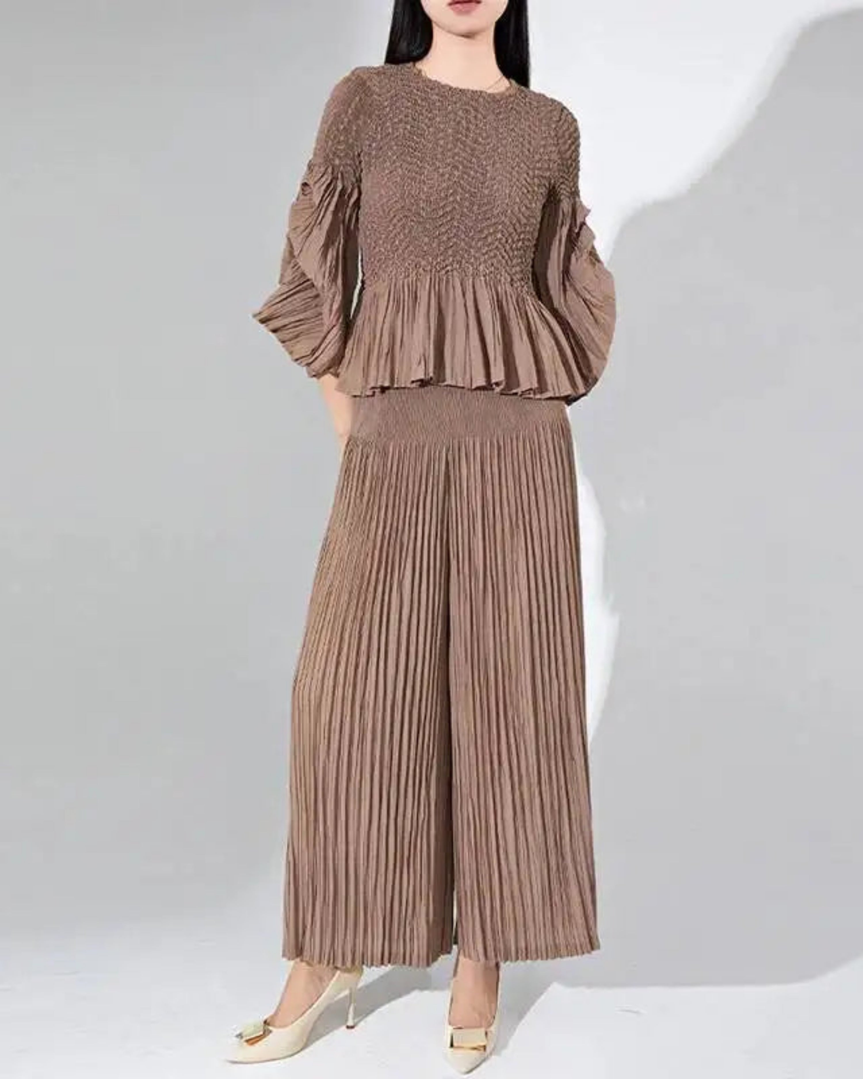 This luxurious two-piece set features premium Japanese pleats with a unique, elegant texture across the ruffle 3/4 sleeve top and wide-leg pants with an elastic waistband.