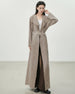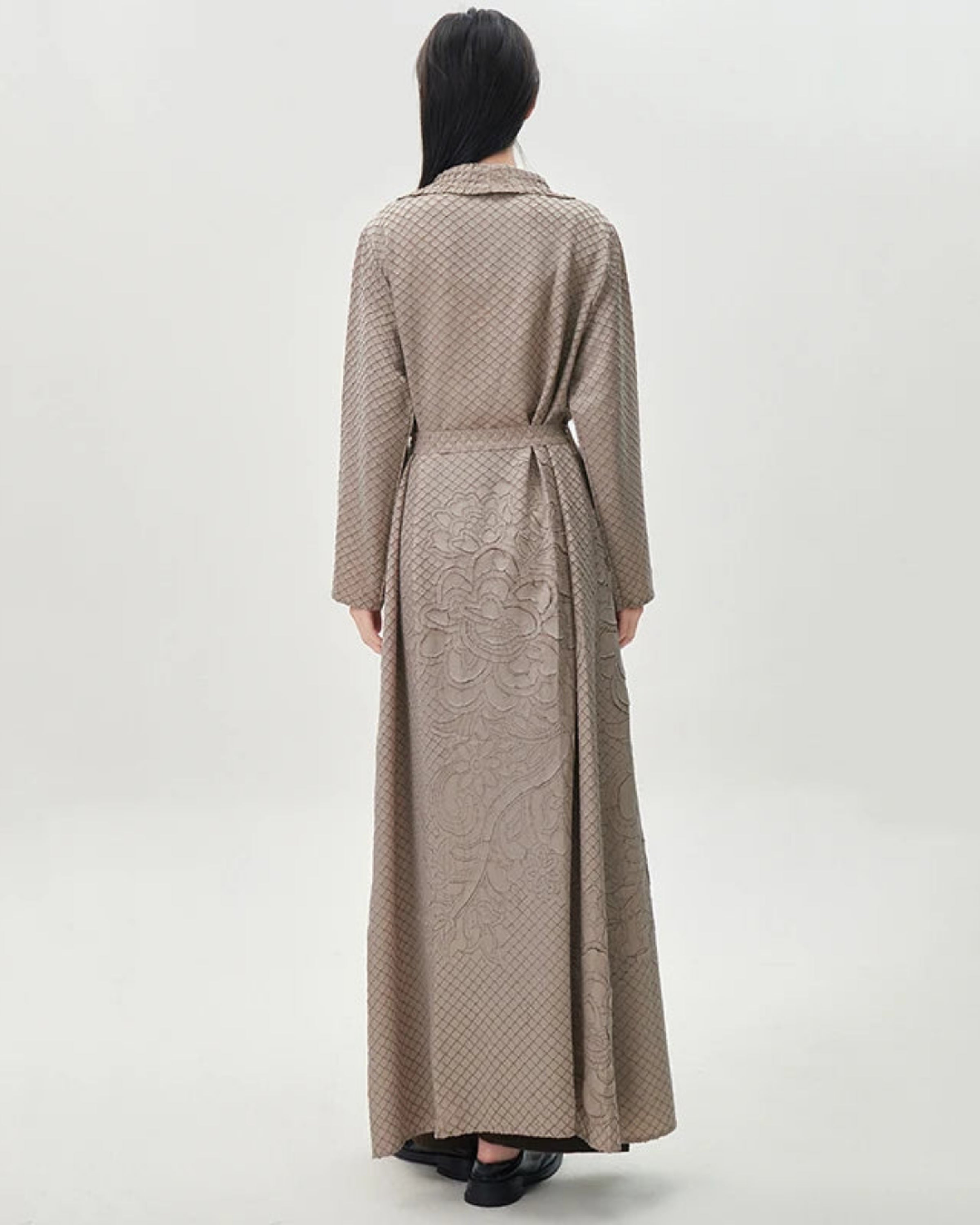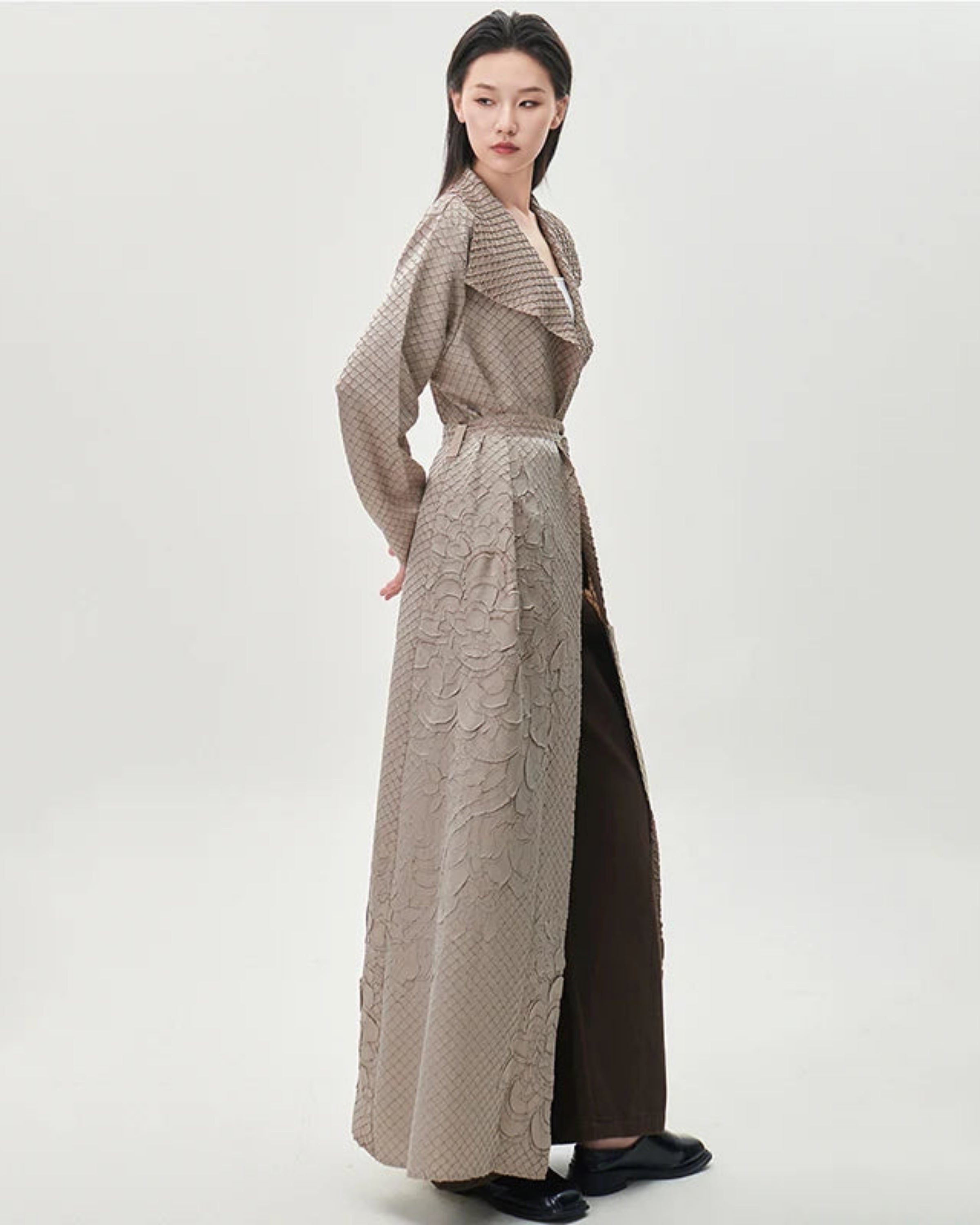 This elegant longline maxi coat features floral pleated texture and a wrap belt for a flattering fit.
