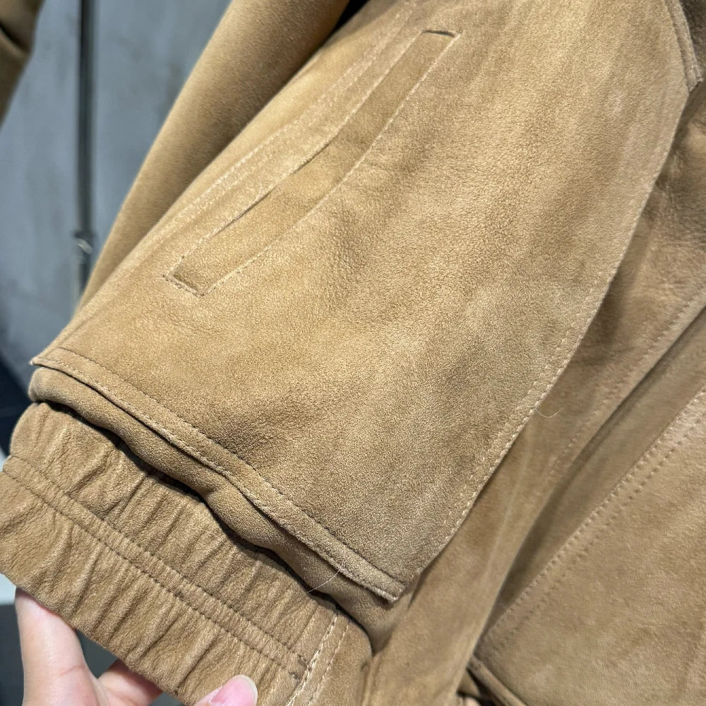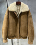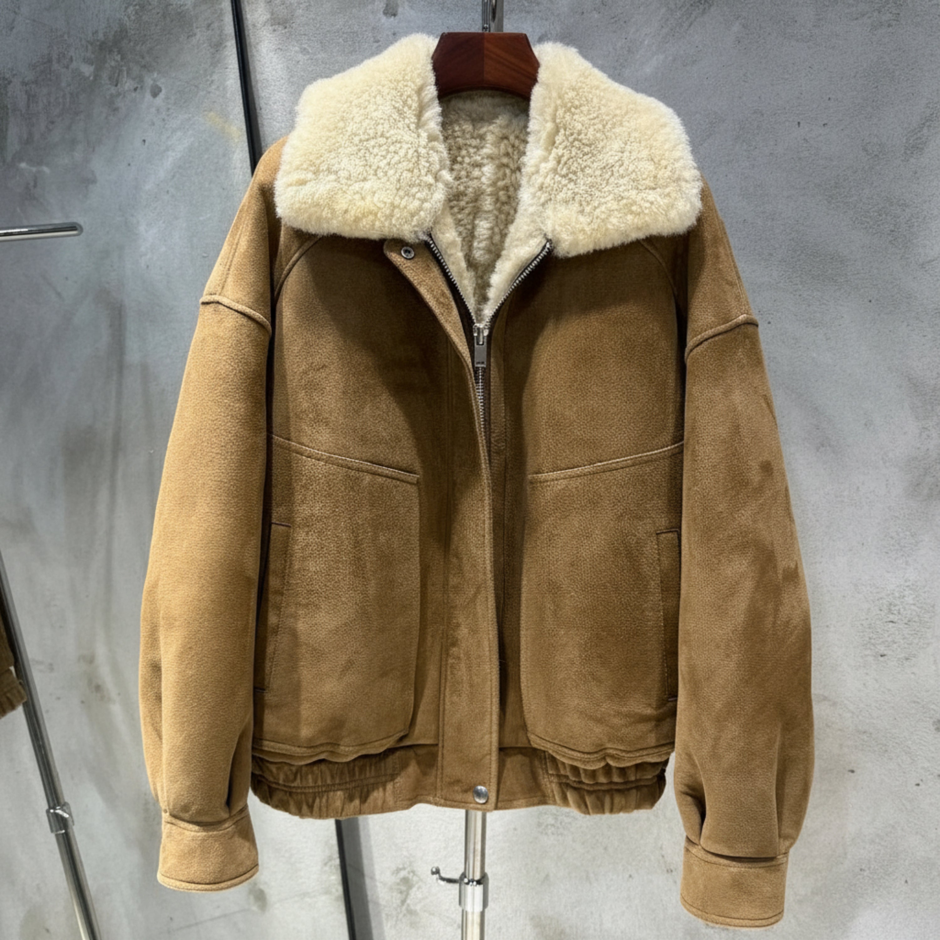 Oversized bomber in genuine lambskin suede, fully lined with plush shearling. Custom-made and handmade, with a full front zip, drop shoulders, and an oversized shearling-lined collar.