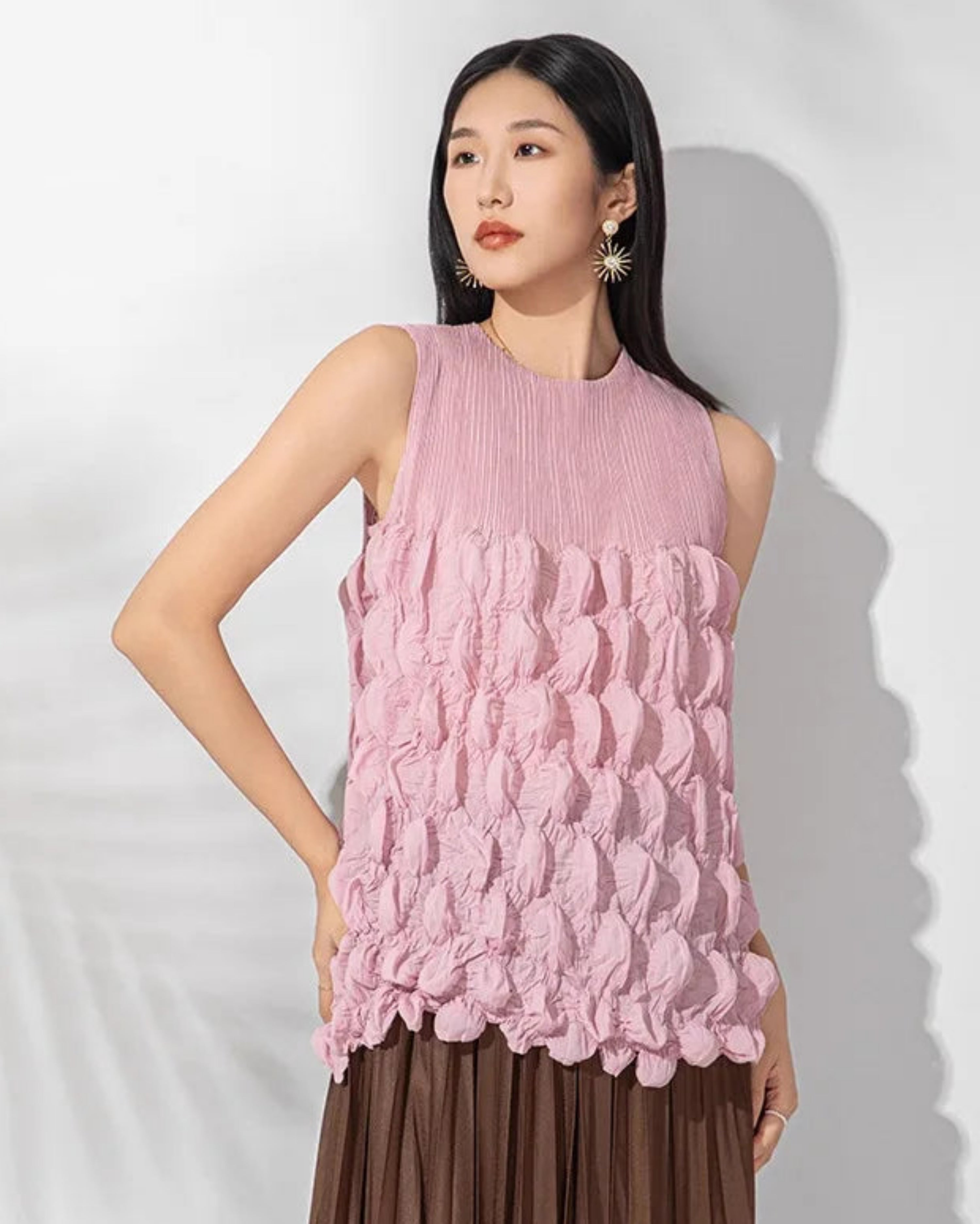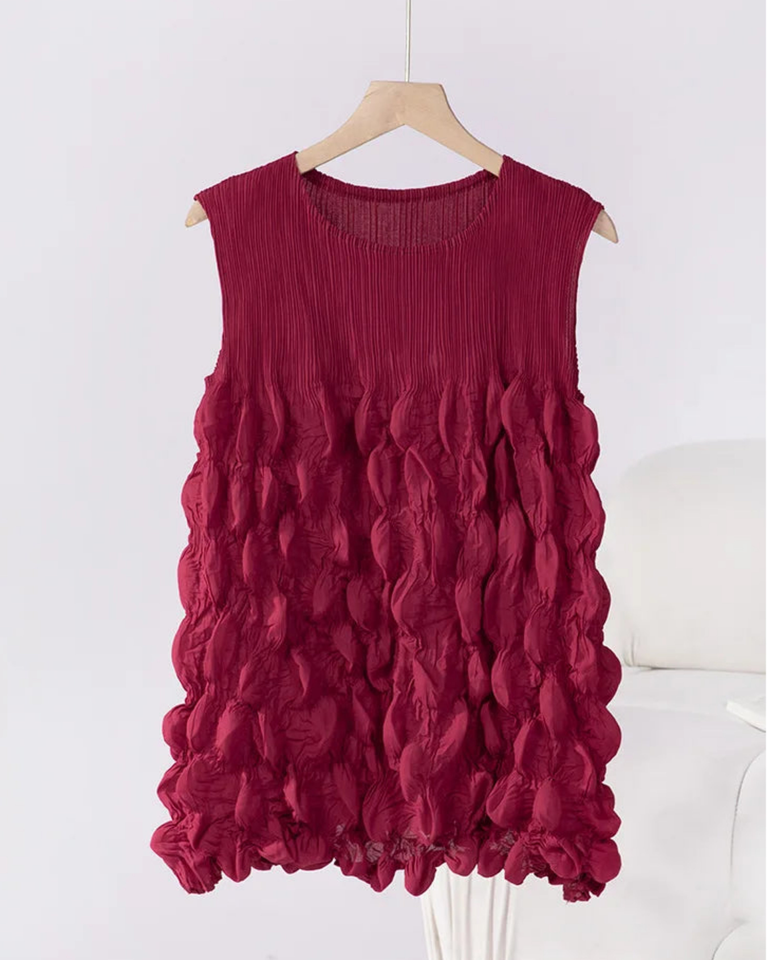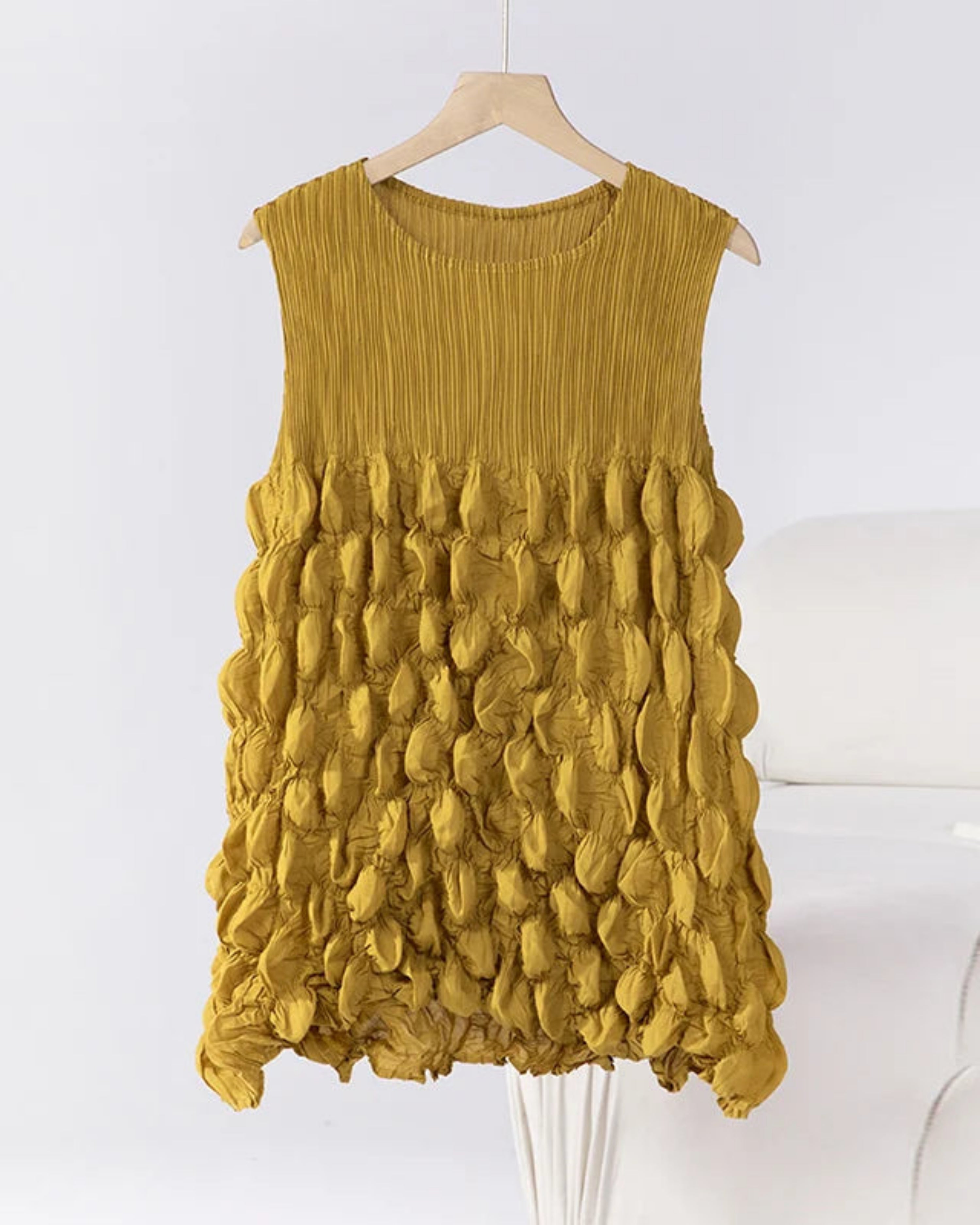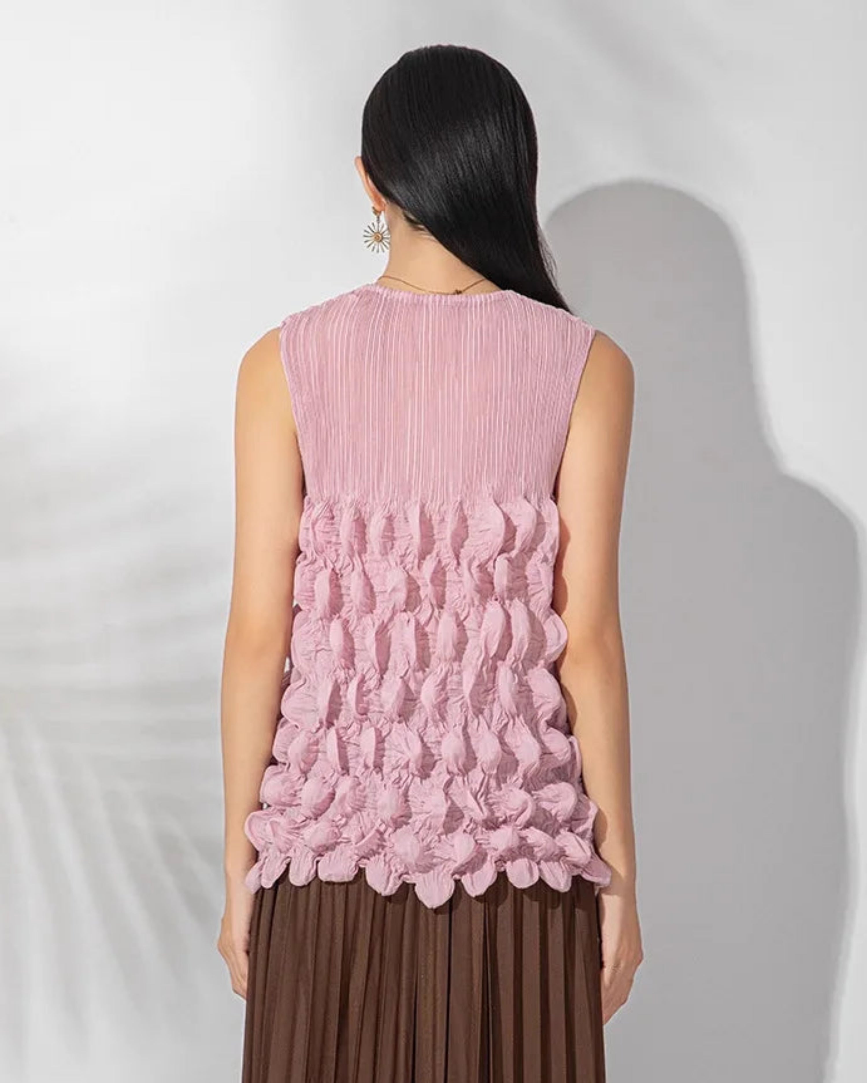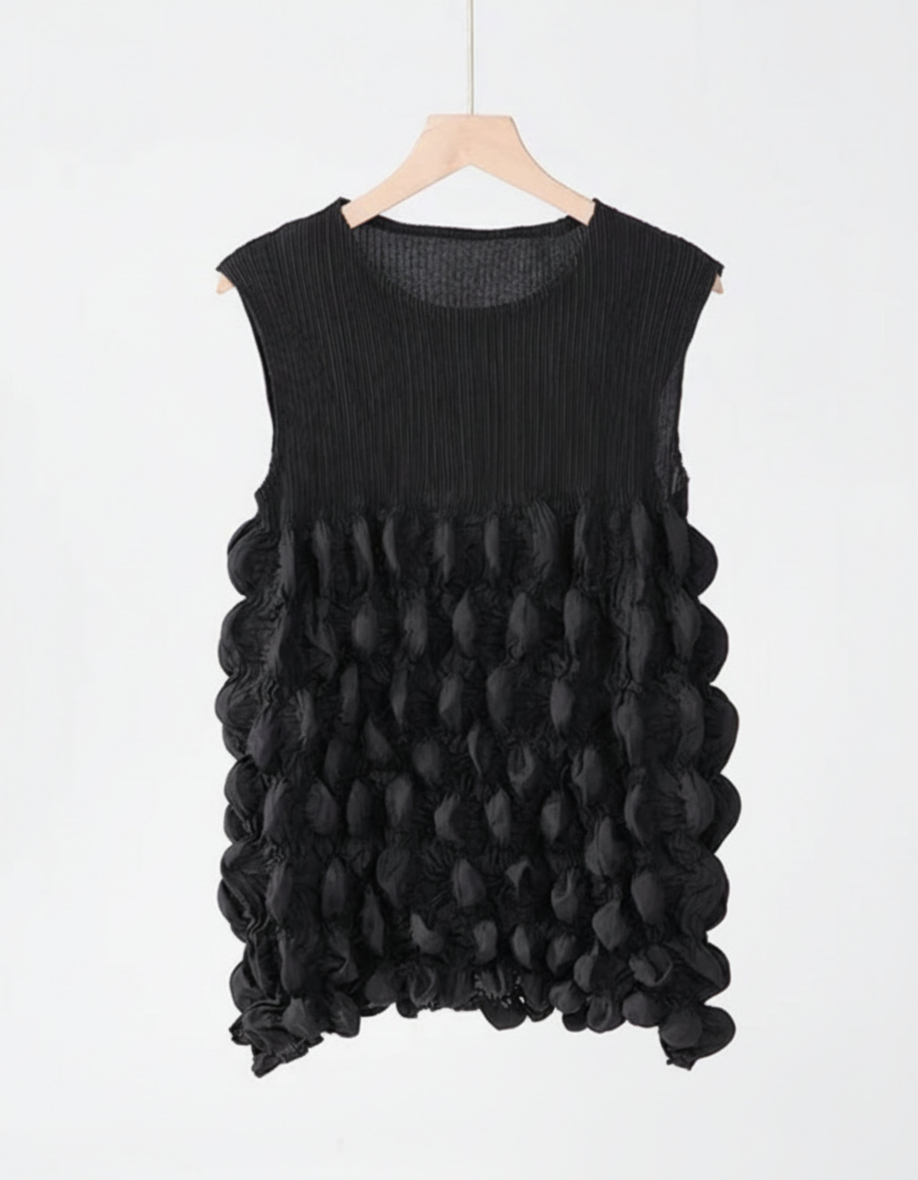 This luxurious sleeveless top features premium Japanese pleats with a unique bubble-textured design that adds depth and dimension.