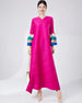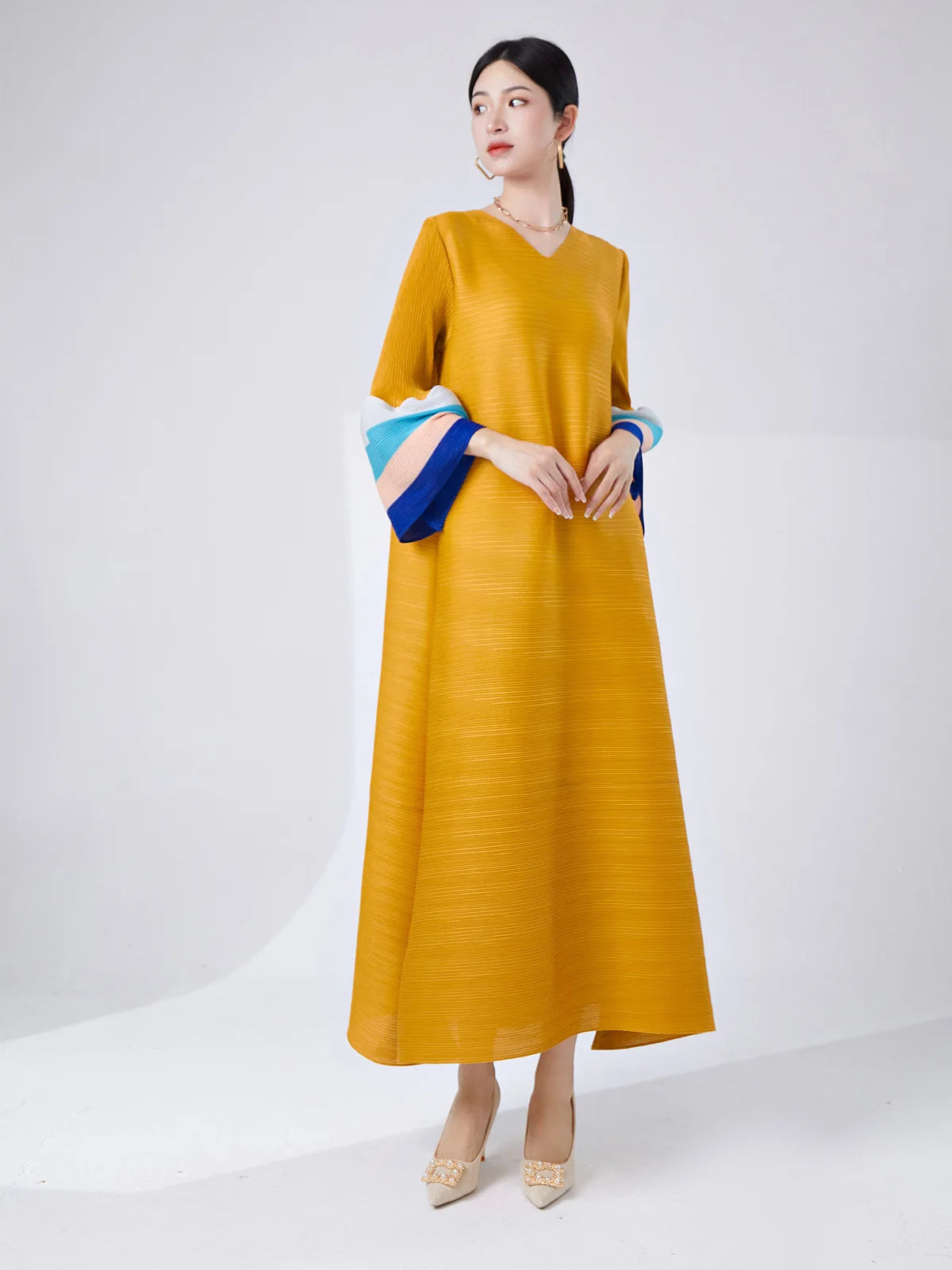 This elegant long dress features full pleating with a relaxed A-line silhouette, V-neckline, and flutter-tiered sleeves.