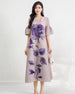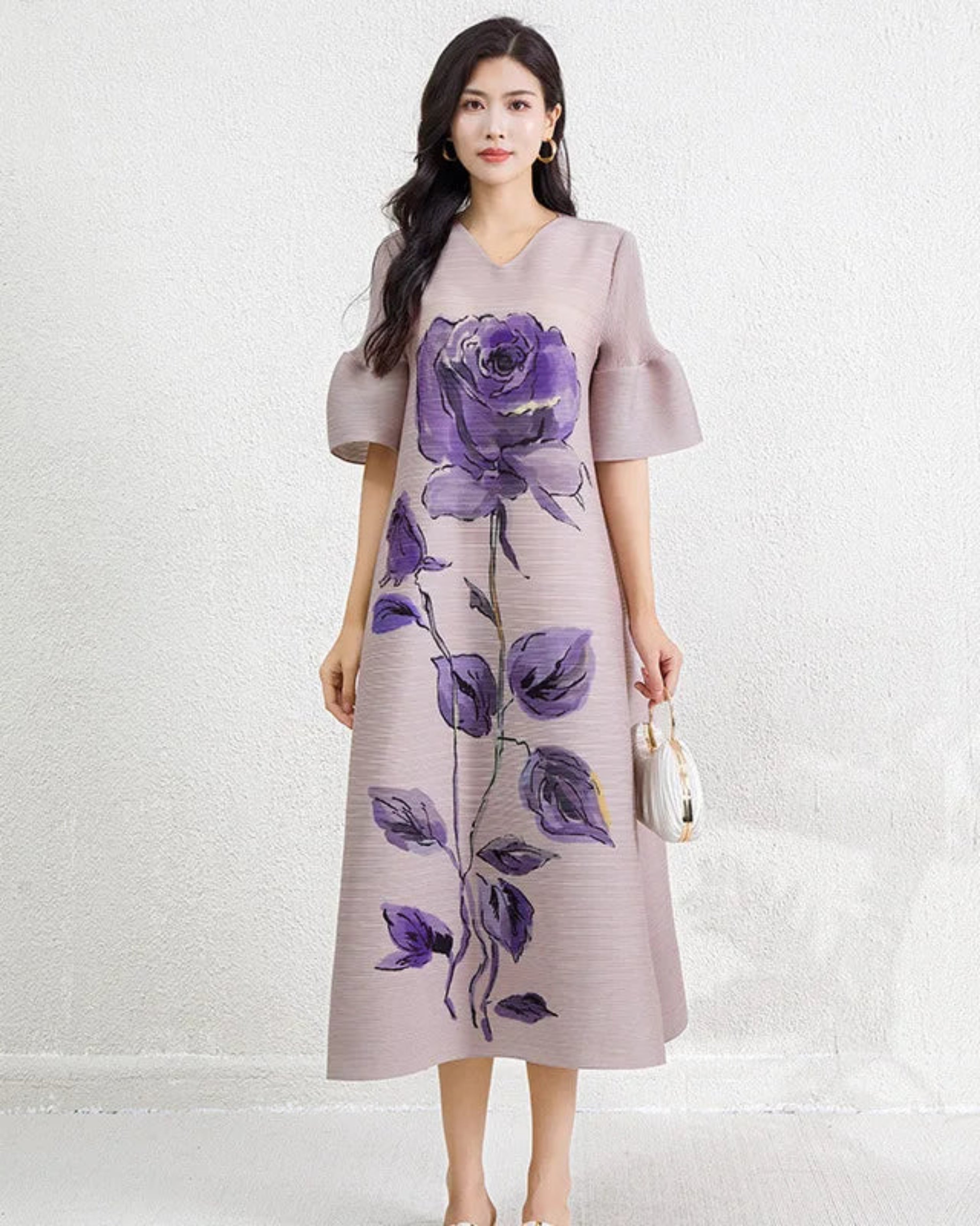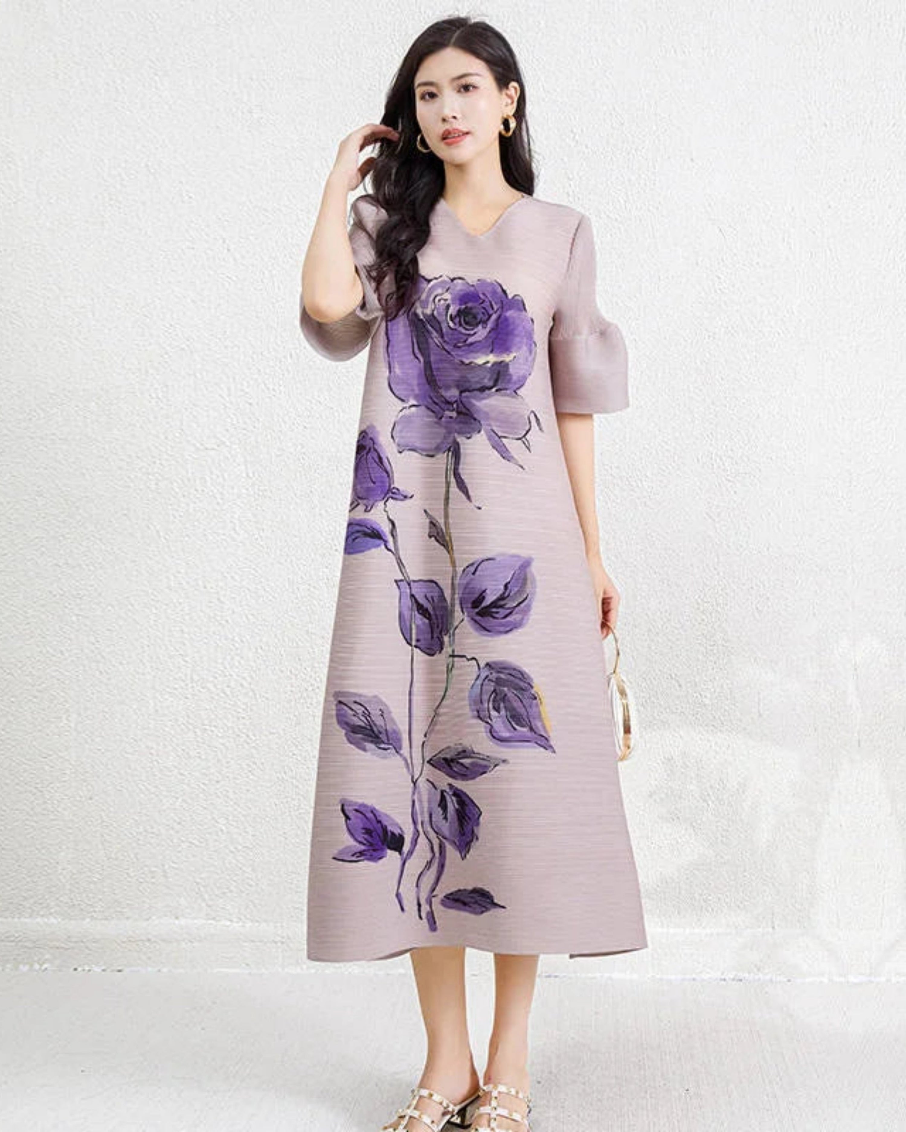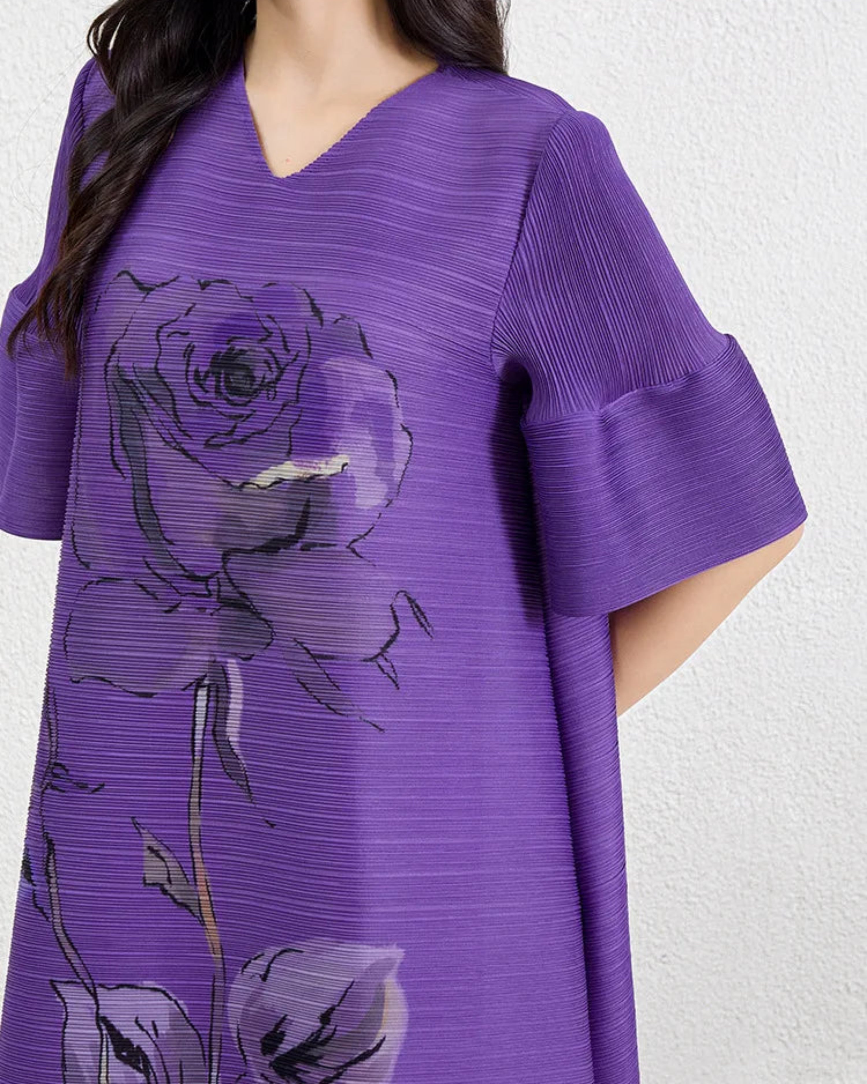 This dress features all-over pleating with a relaxed midi silhouette, V-neckline, and soft lantern sleeves.