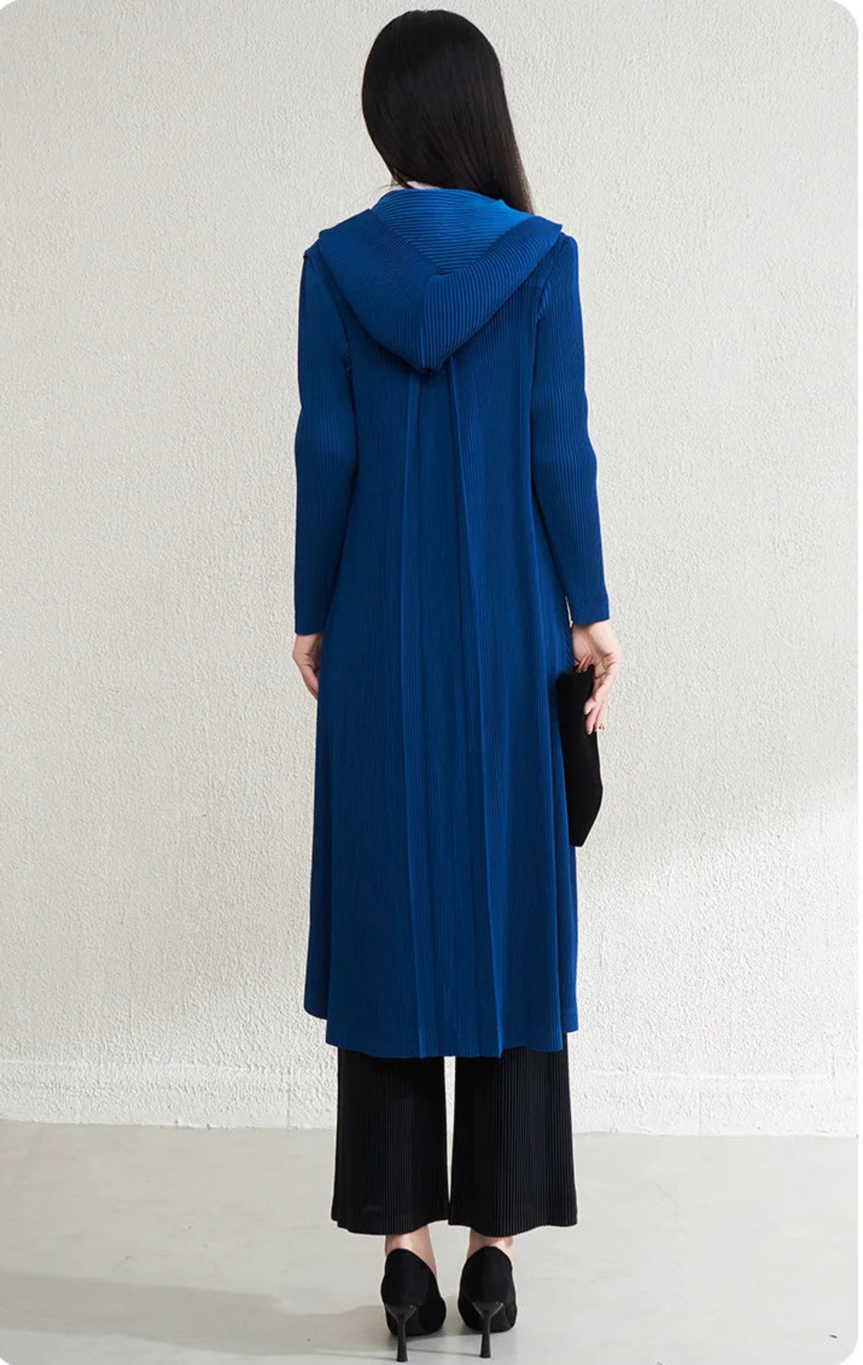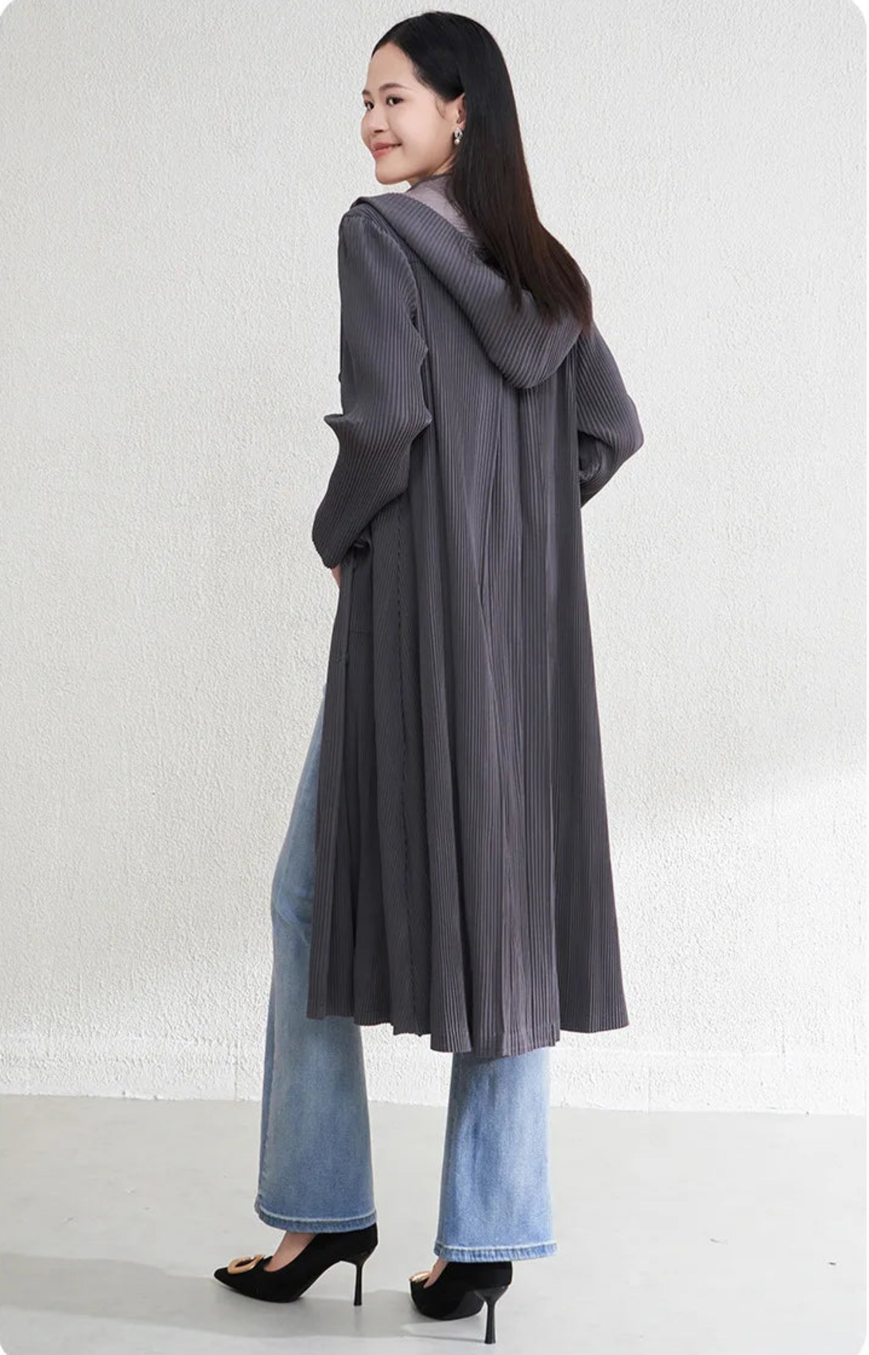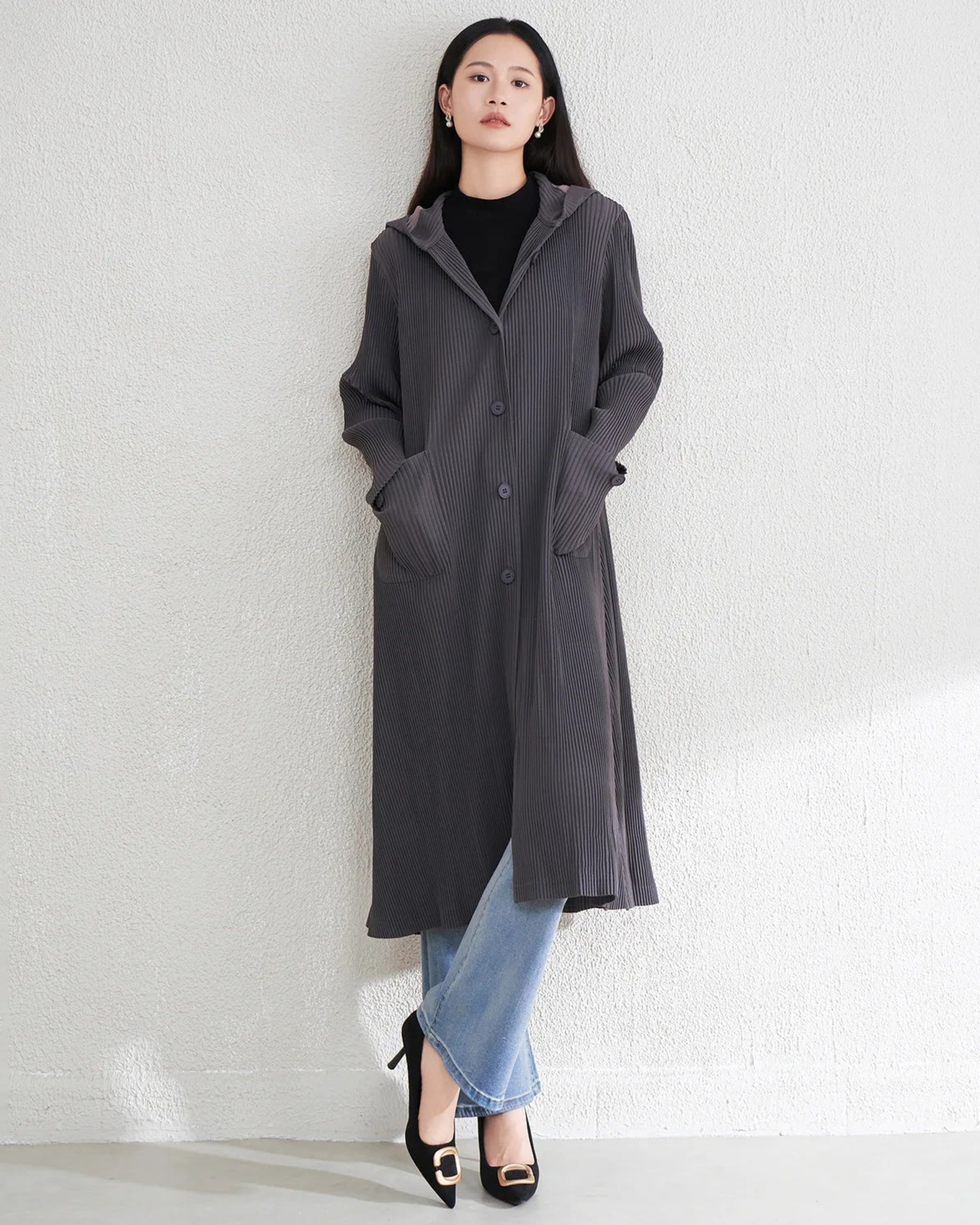 With structured pleats and flowing lines that exude luxury, this hooded coat moves beautifully and stands out wherever you go.
