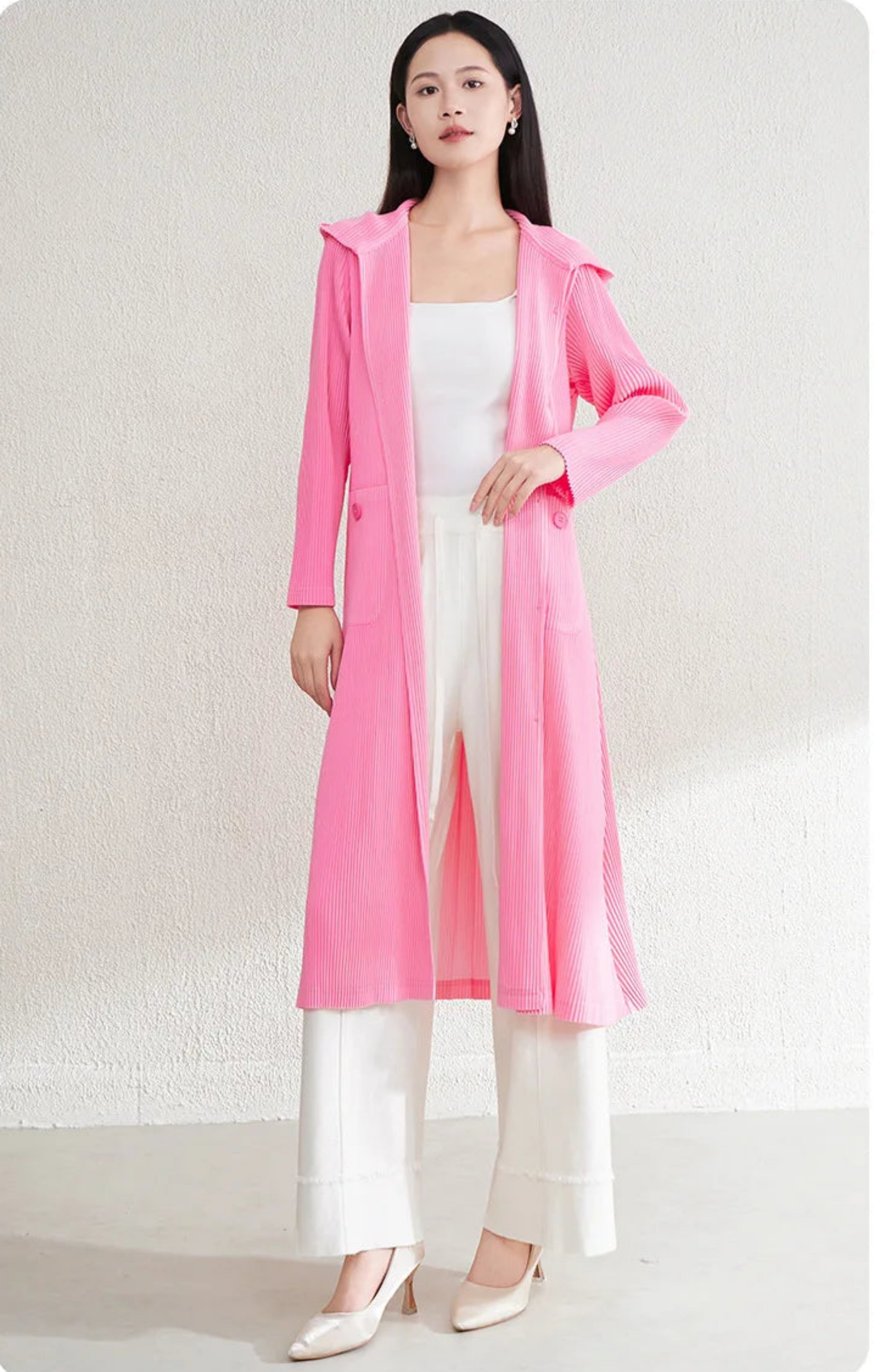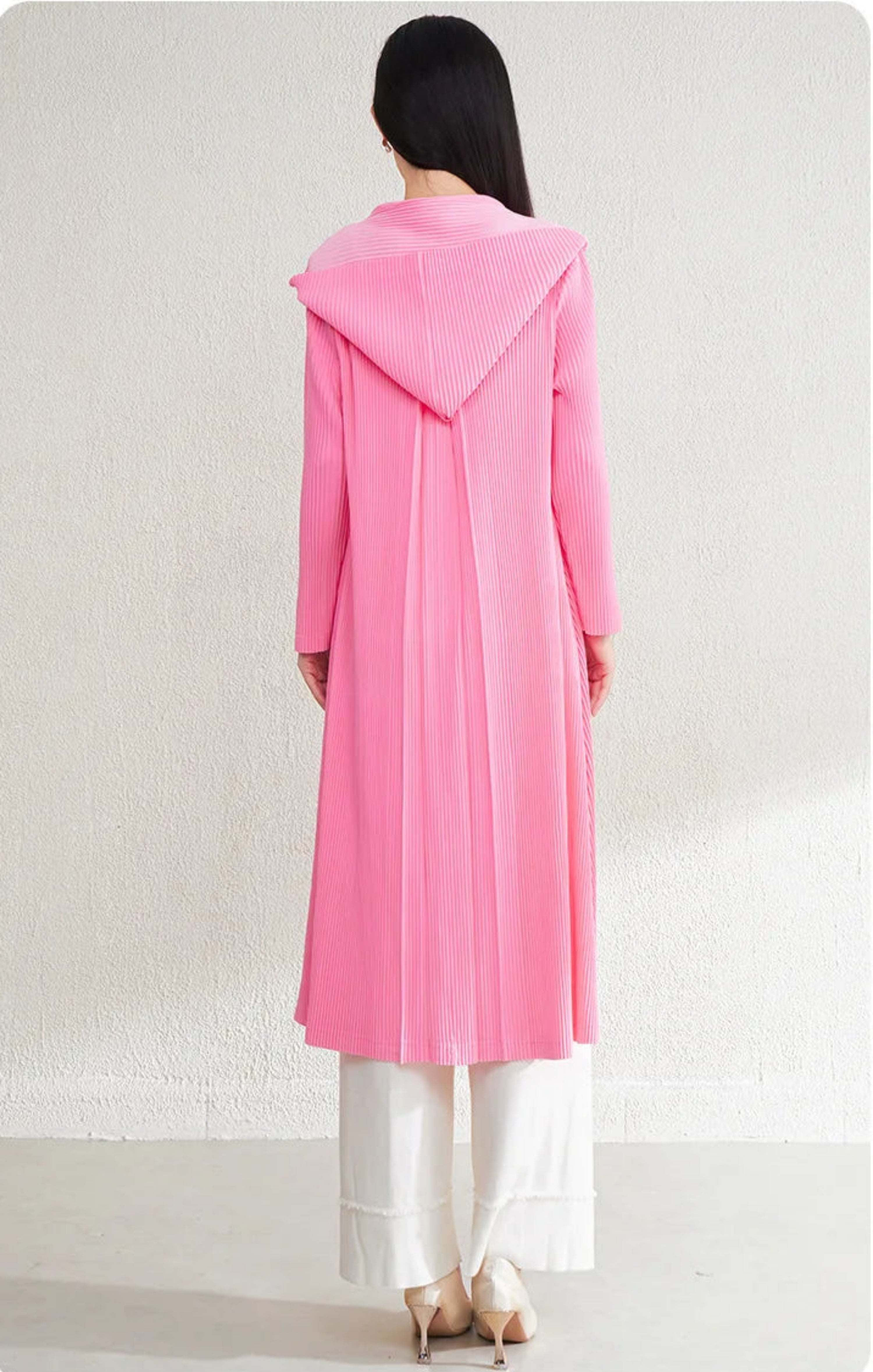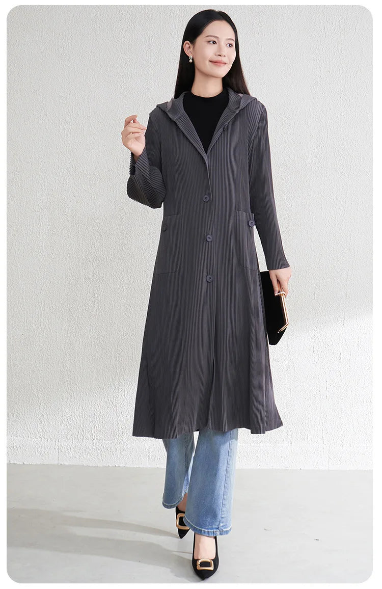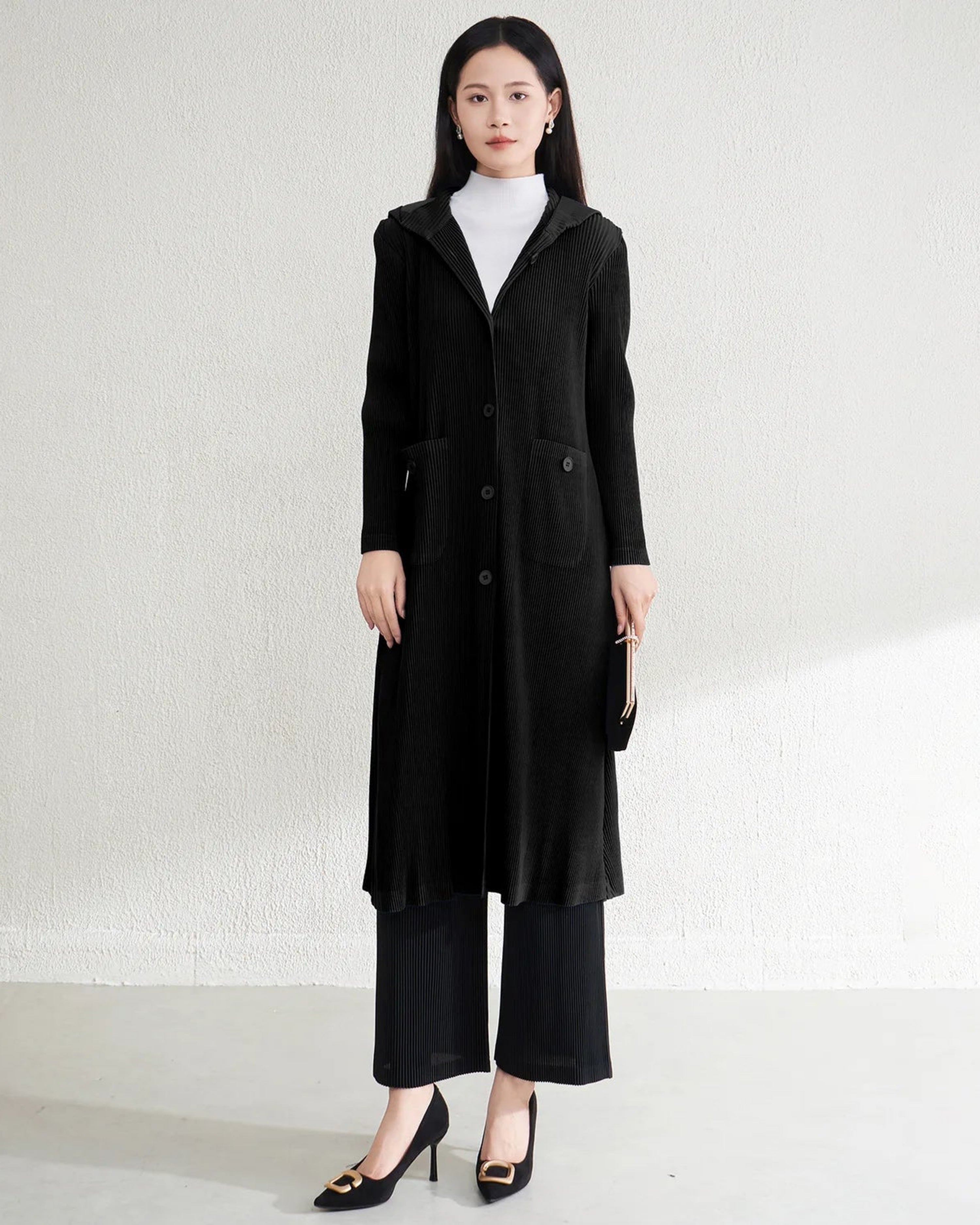With structured pleats and flowing lines that exude luxury, this hooded coat moves beautifully and stands out wherever you go.