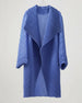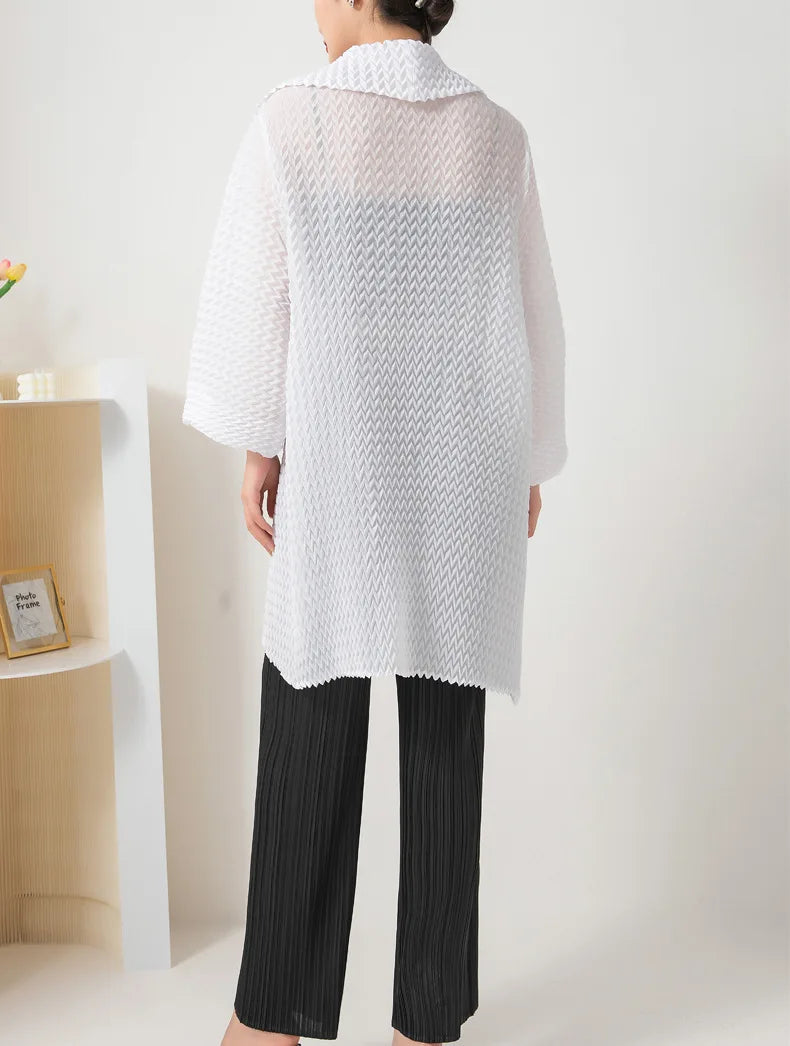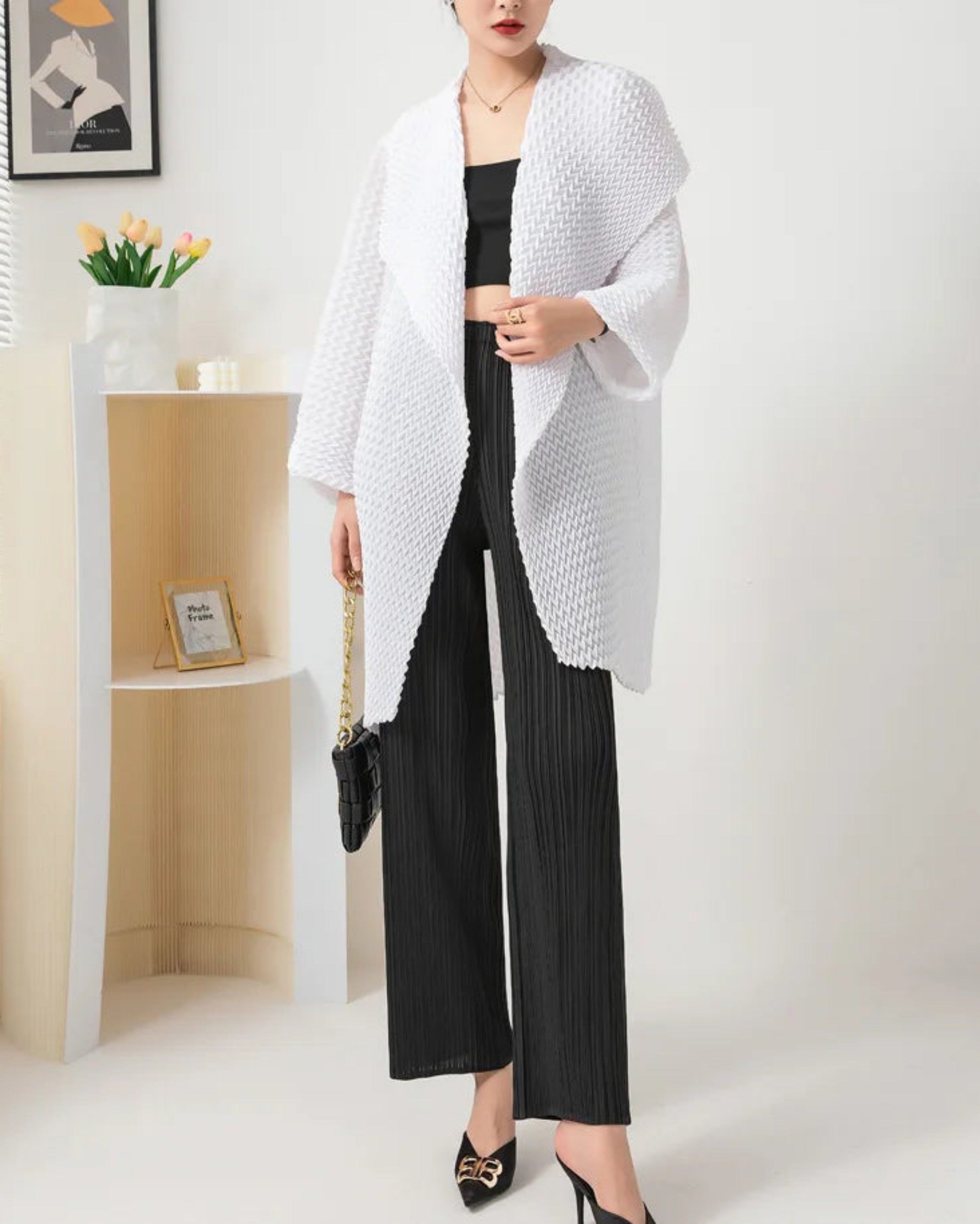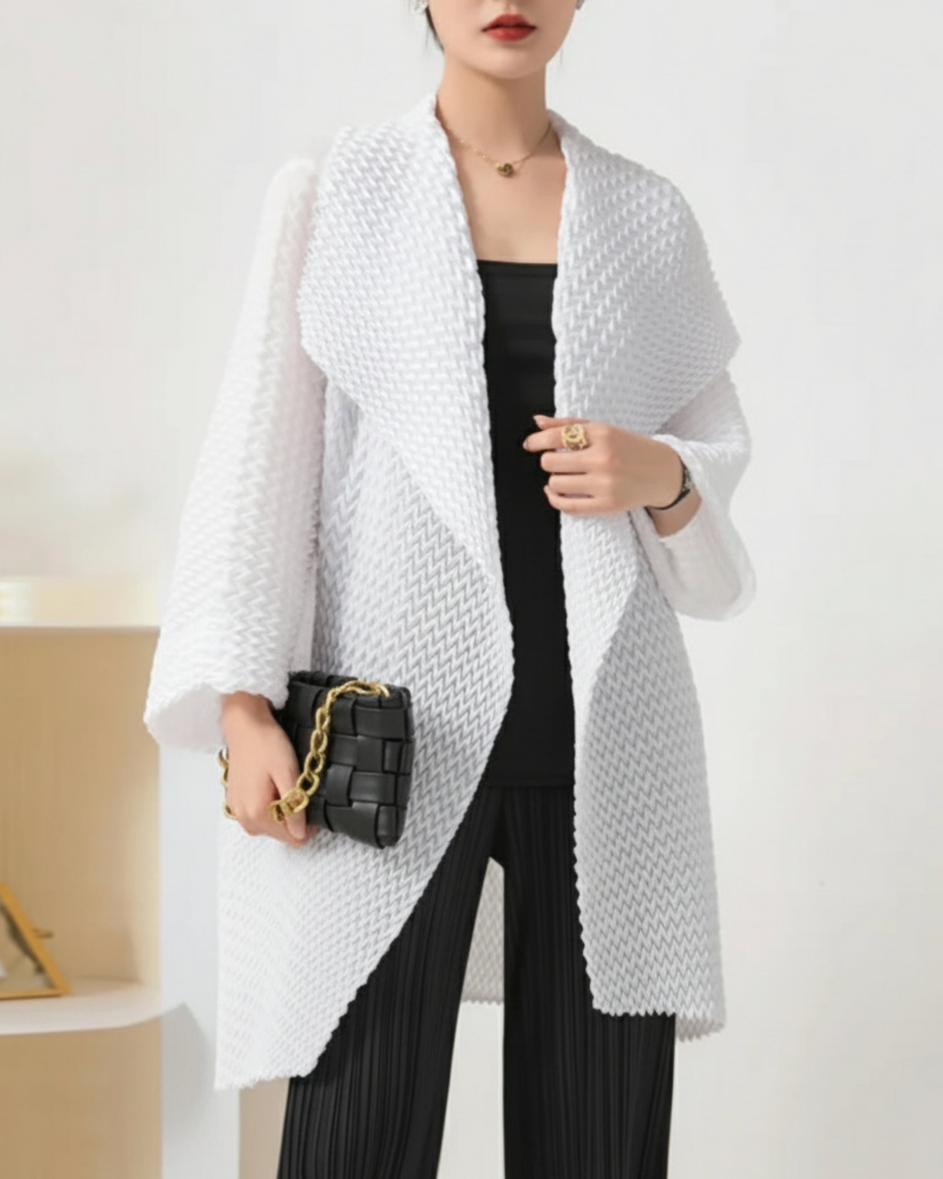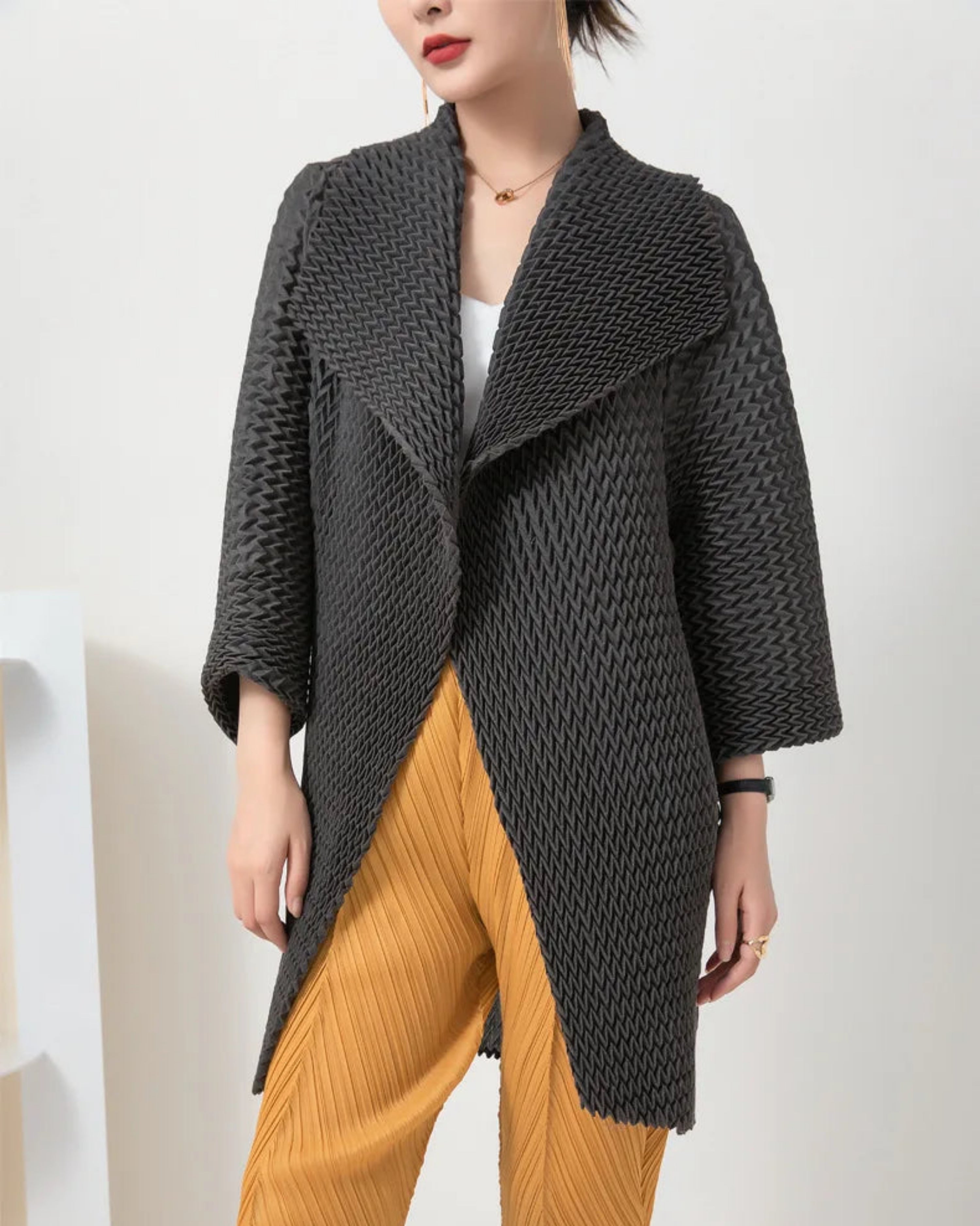 This jacket features a bold geometric pleat pattern with a smooth, fluid drape. The waterfall front forms an elegant asymmetric shape, paired with a wide shawl collar and three-quarter sleeves.
