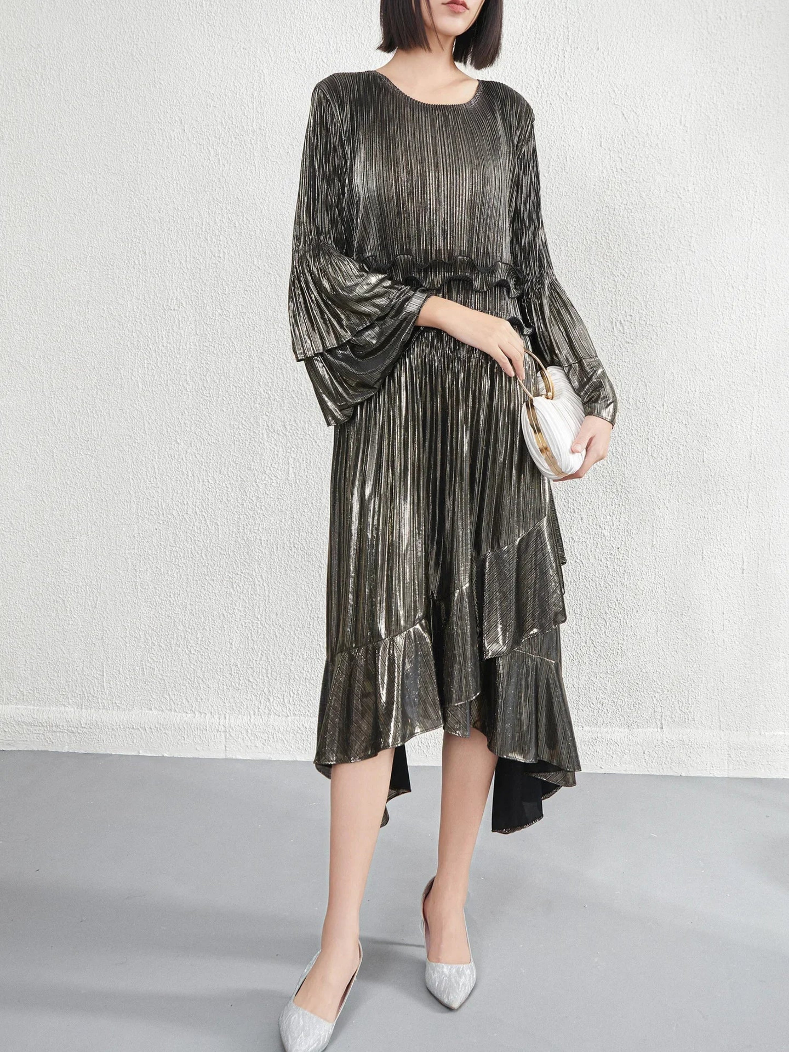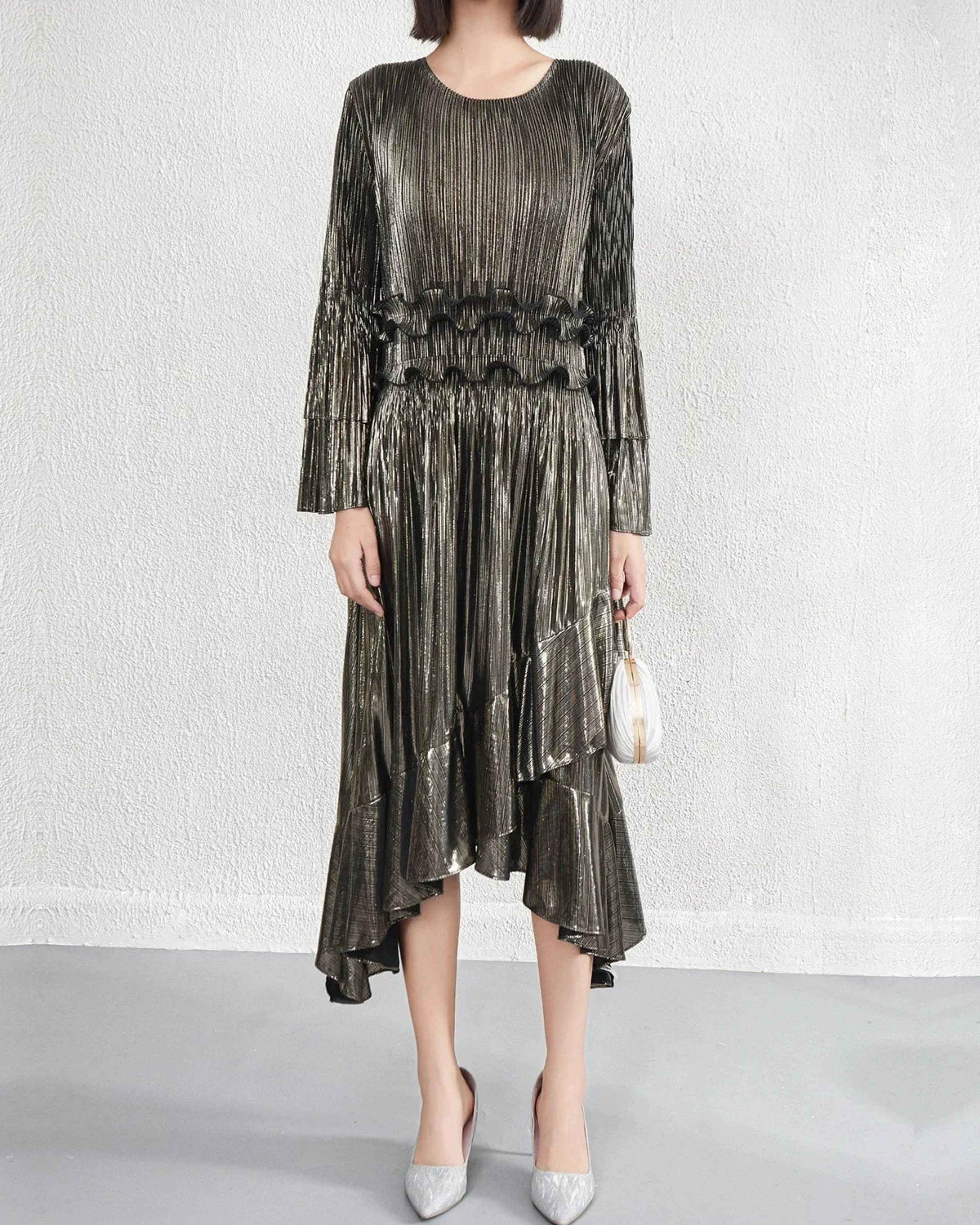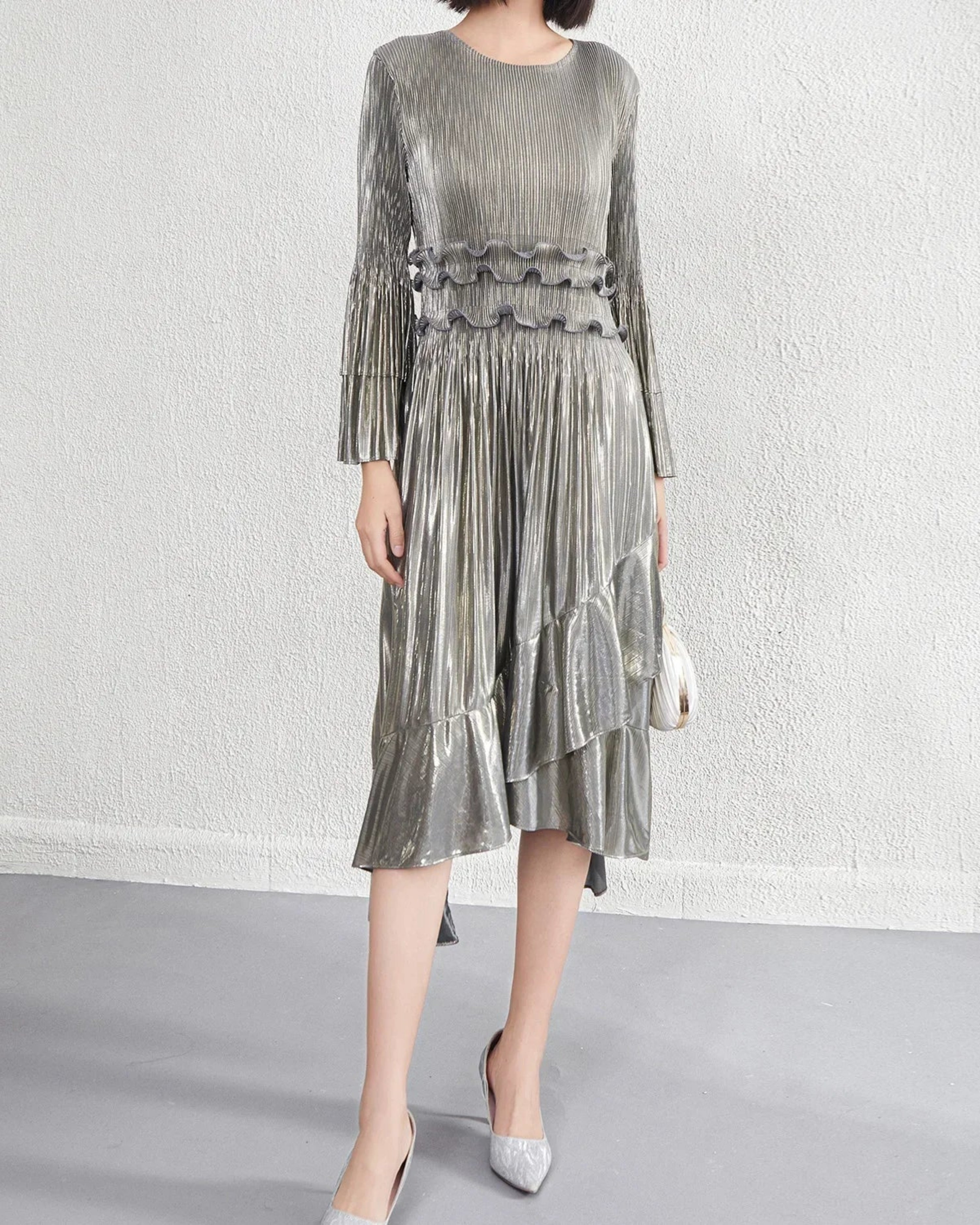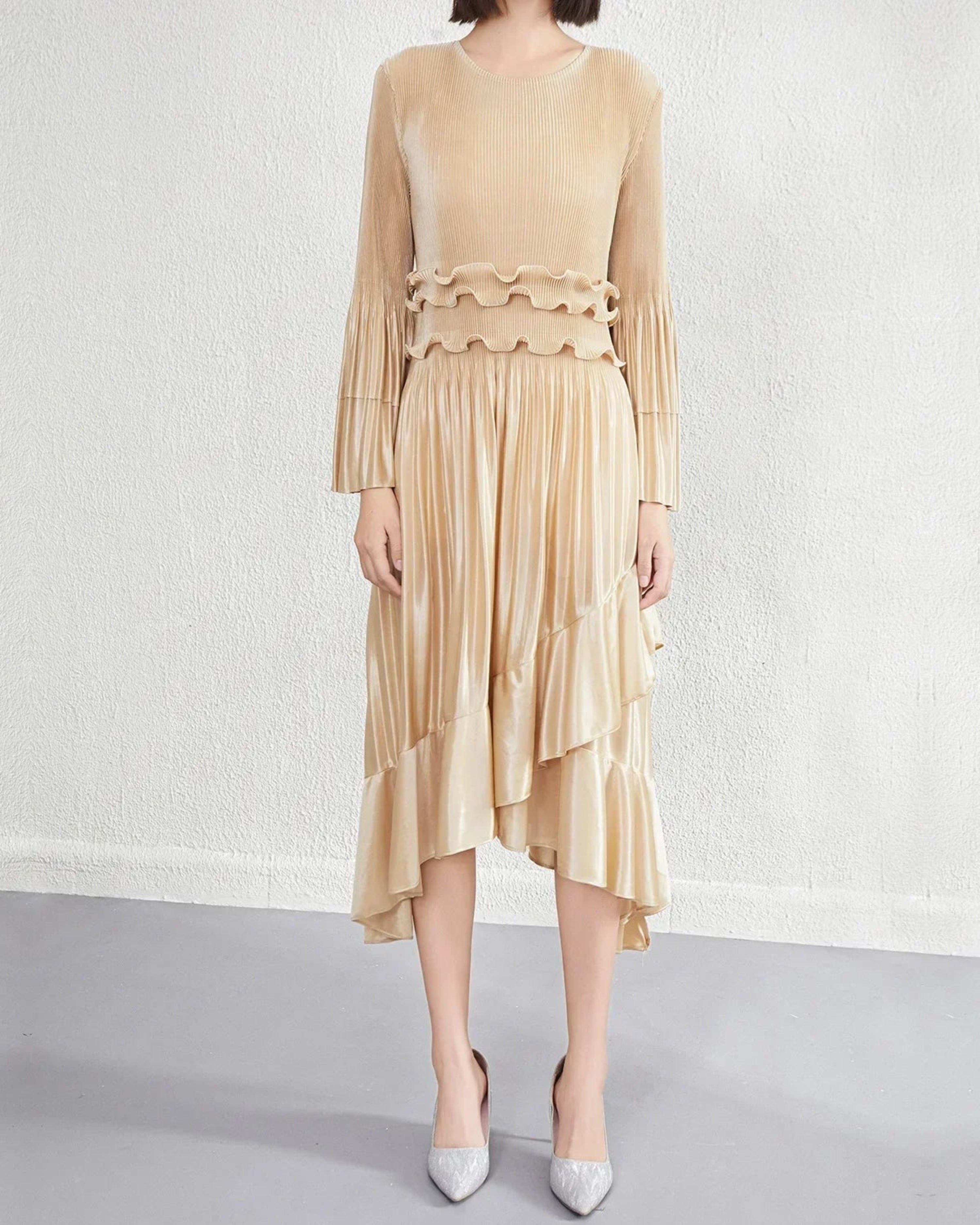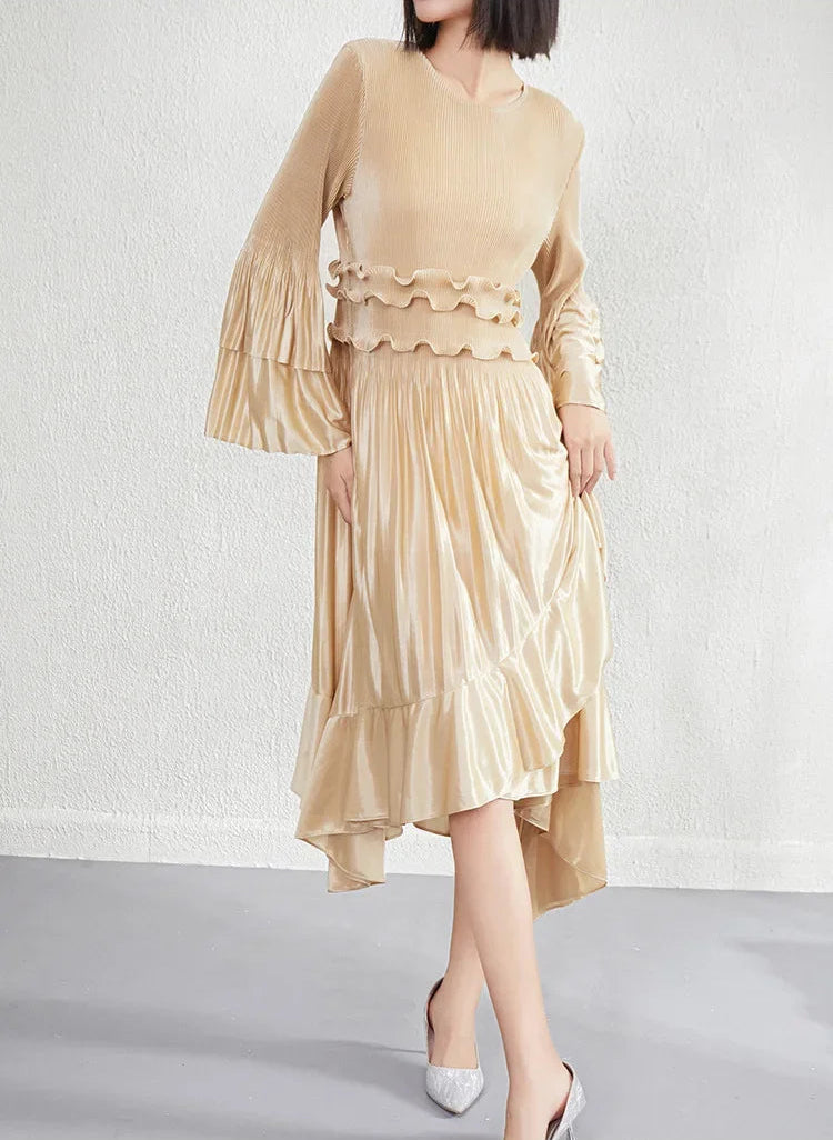 This elegant midi dress features premium Japanese pleats, a flowing silhouette, and a refined asymmetrical hemline enhanced by cascading ruffles that create graceful movement.
