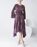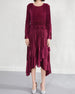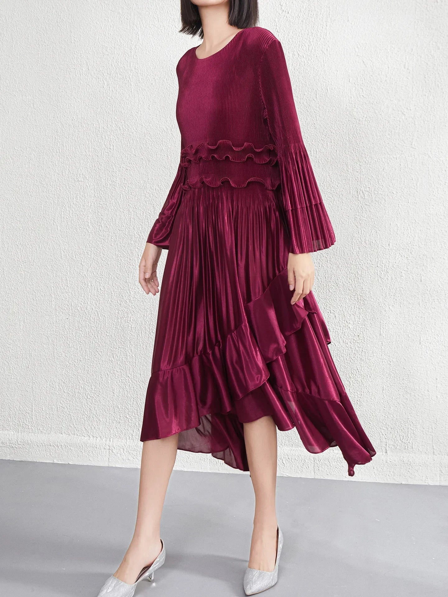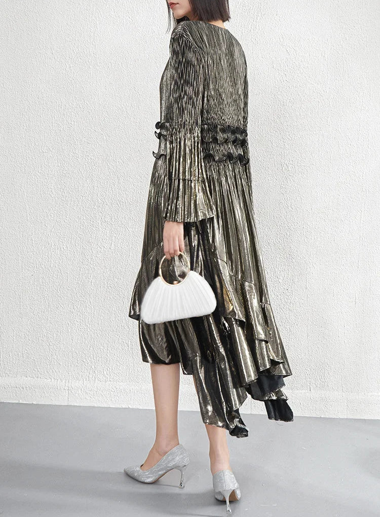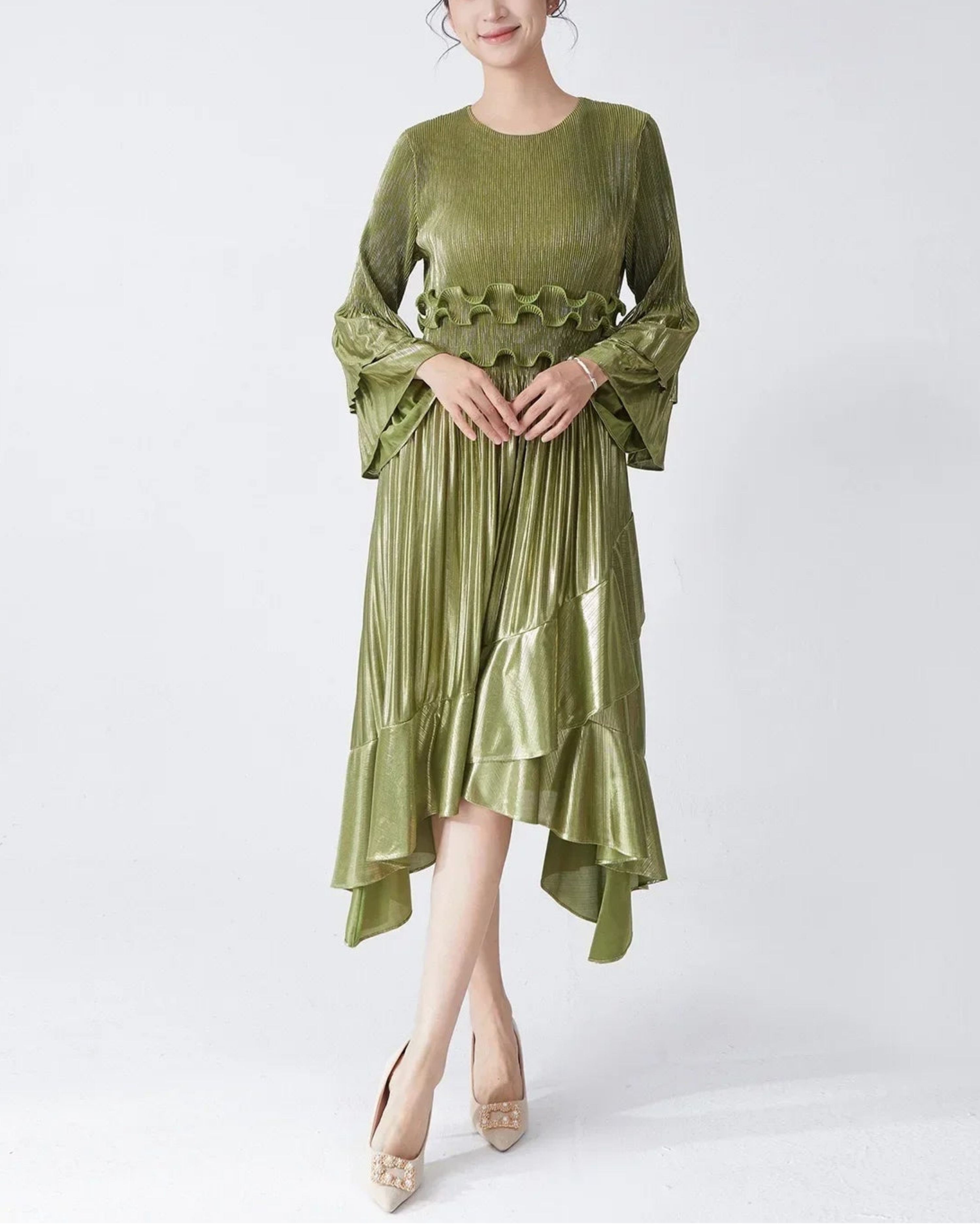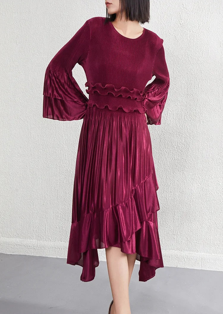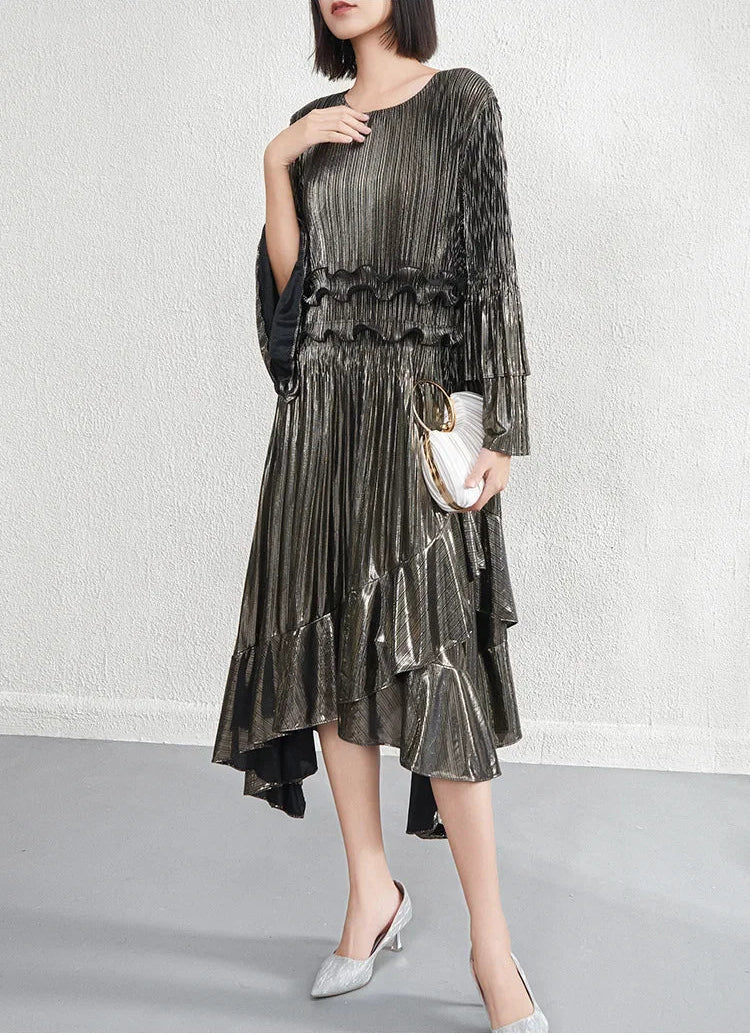 This elegant midi dress features premium Japanese pleats, a flowing silhouette, and a refined asymmetrical hemline enhanced by cascading ruffles that create graceful movement.