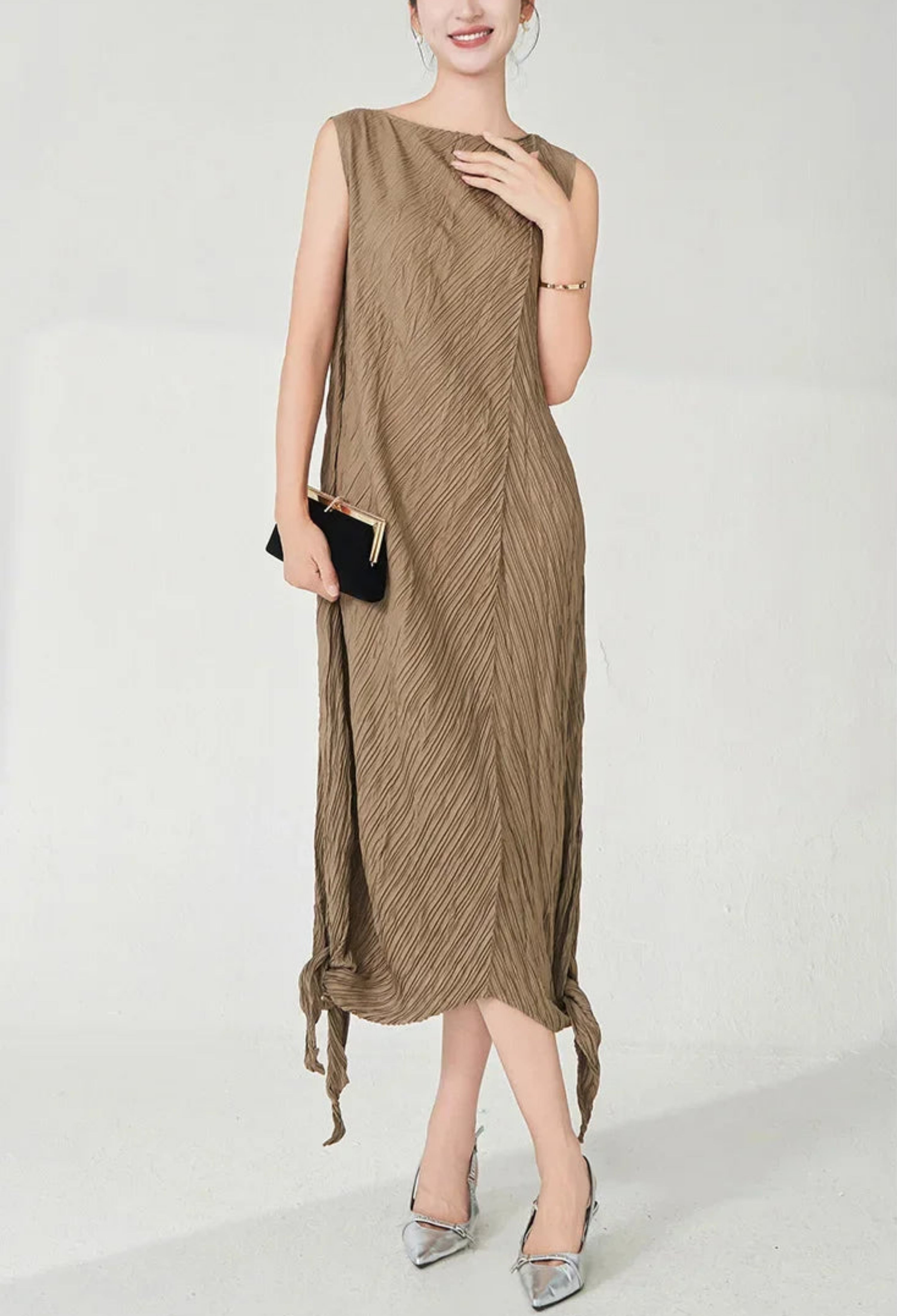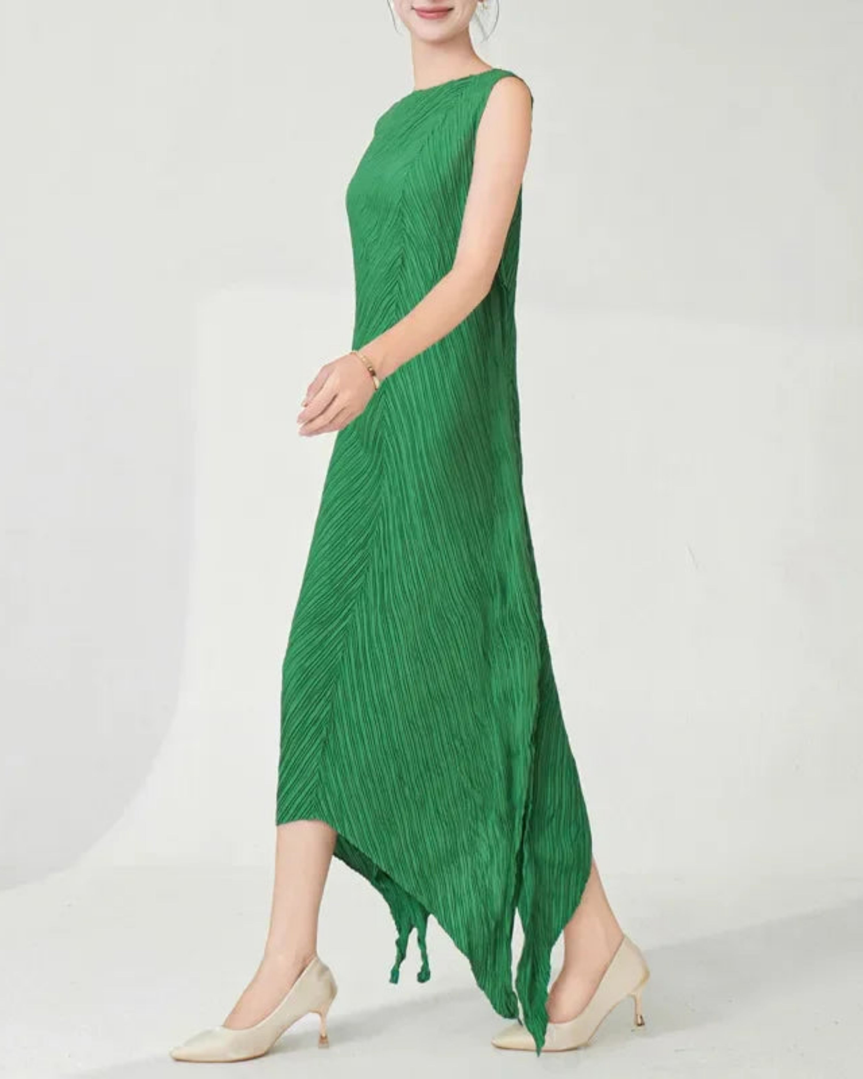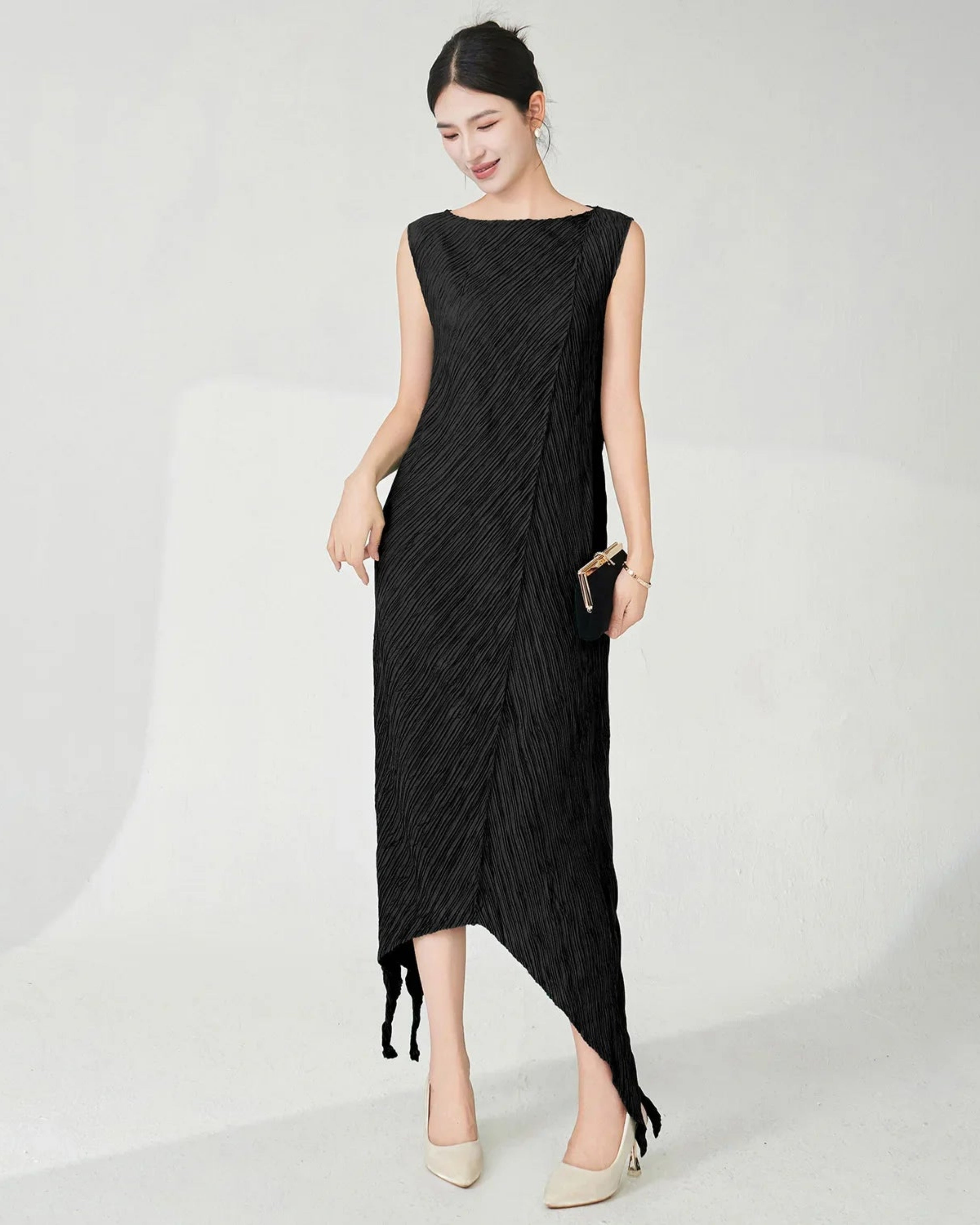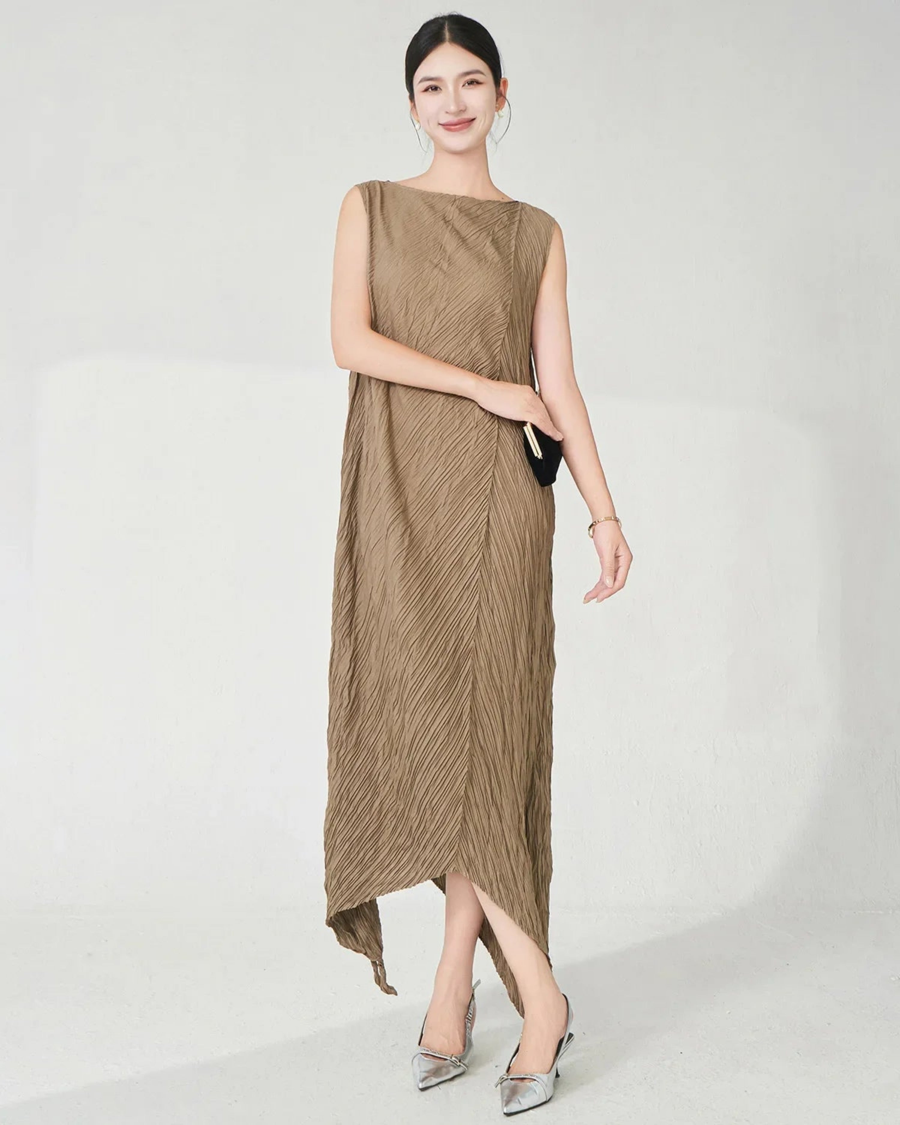 Elegant sleeveless midi dress in premium Japanese pleated fabric with stretch and wrinkle-resistant finish — no ironing needed.