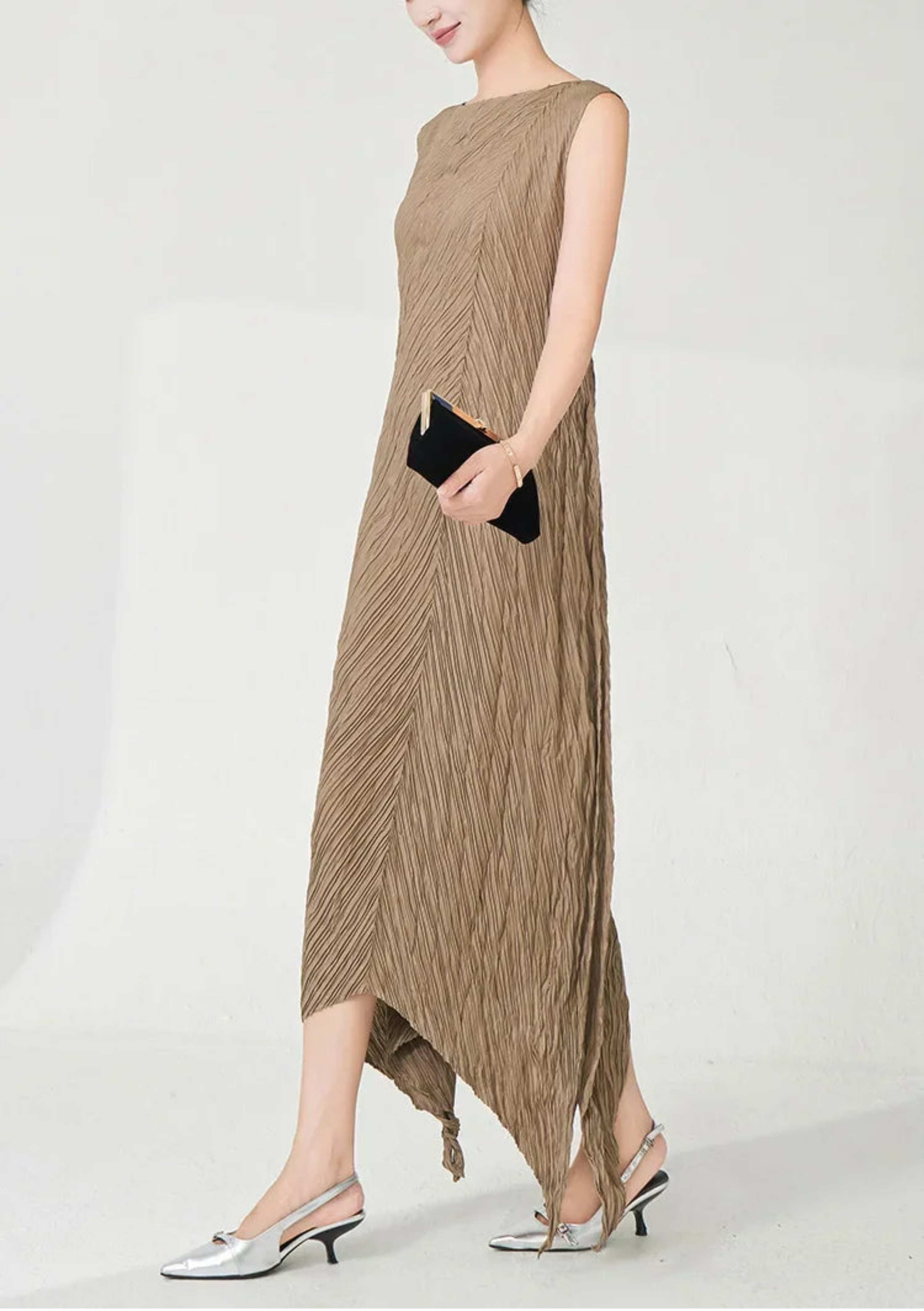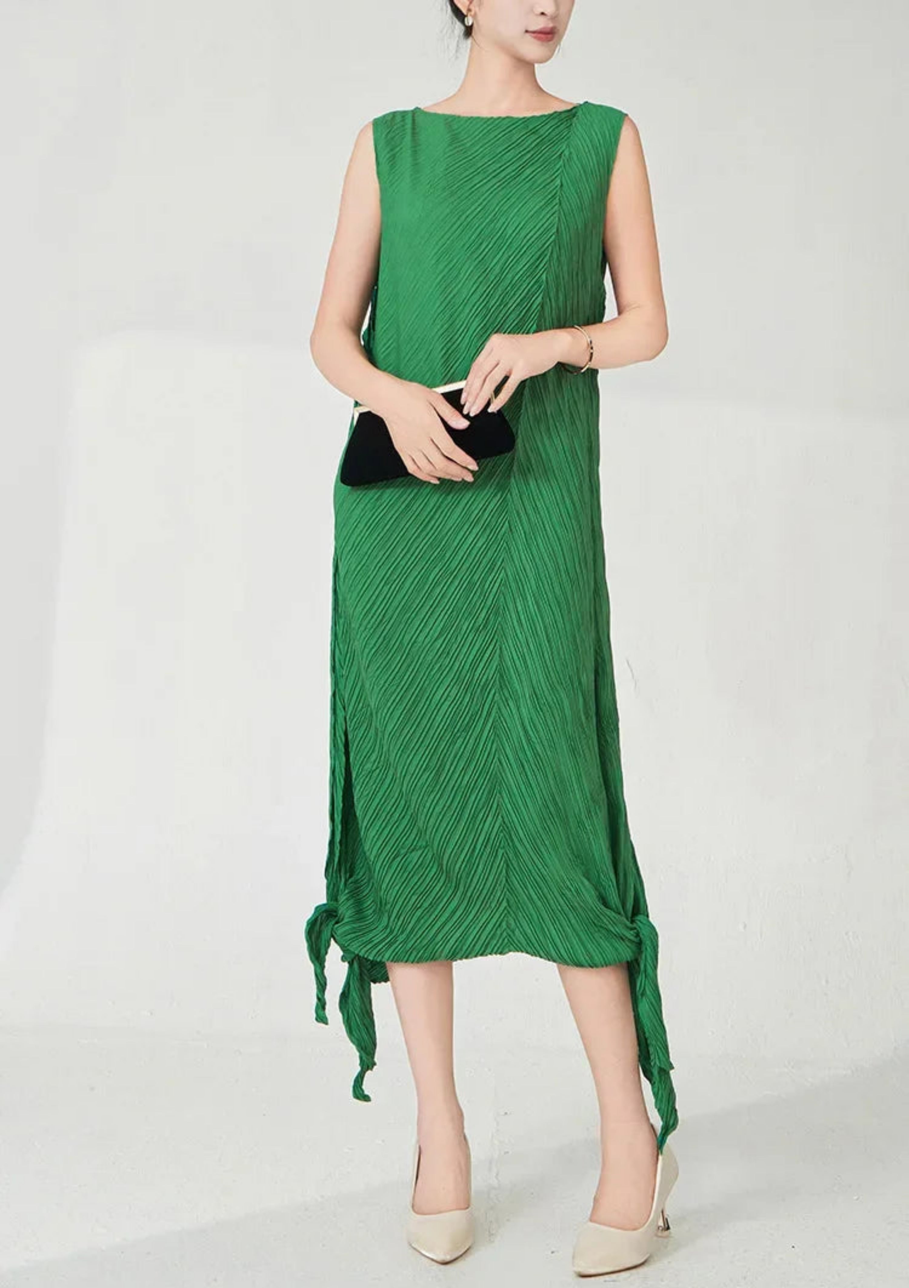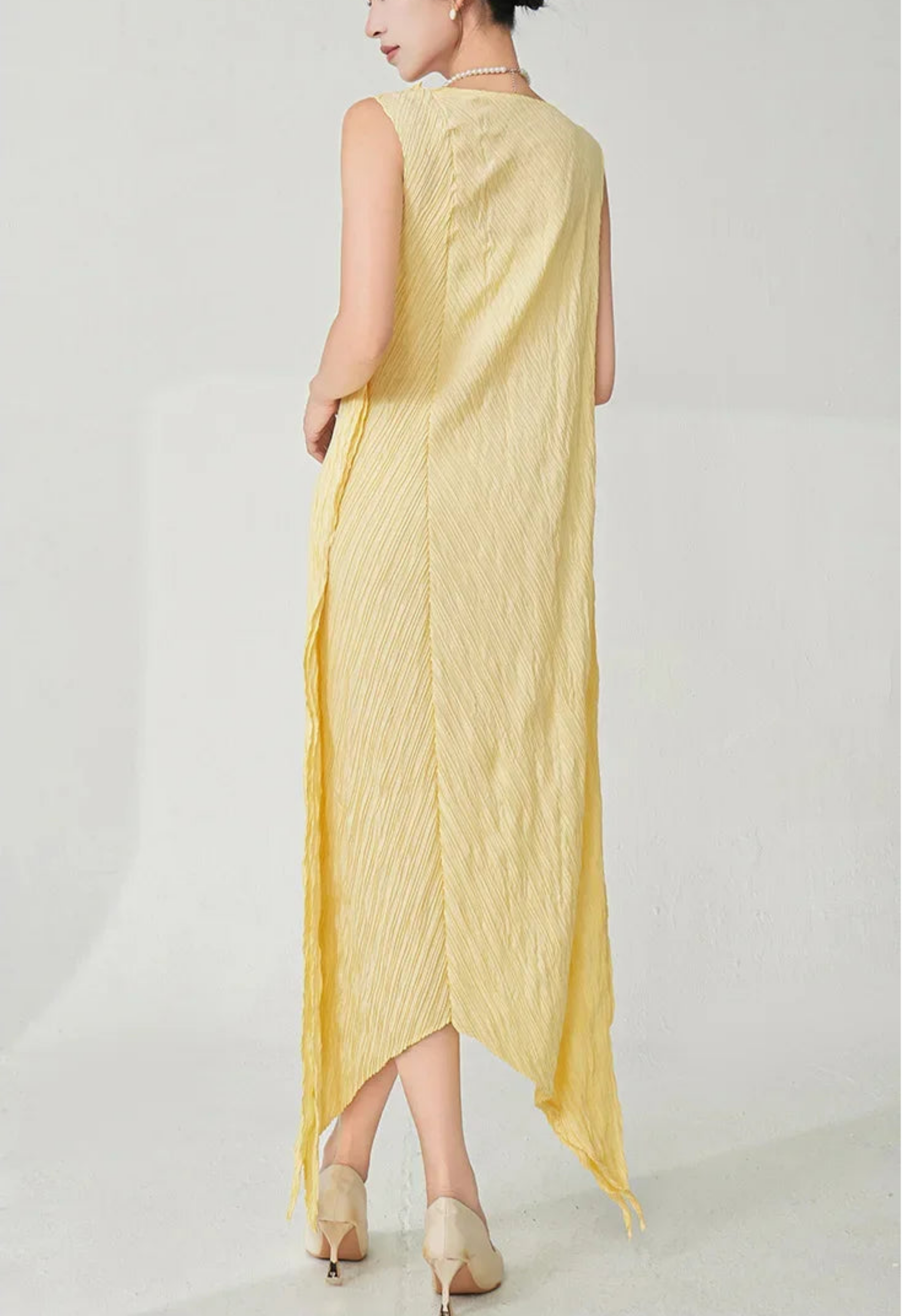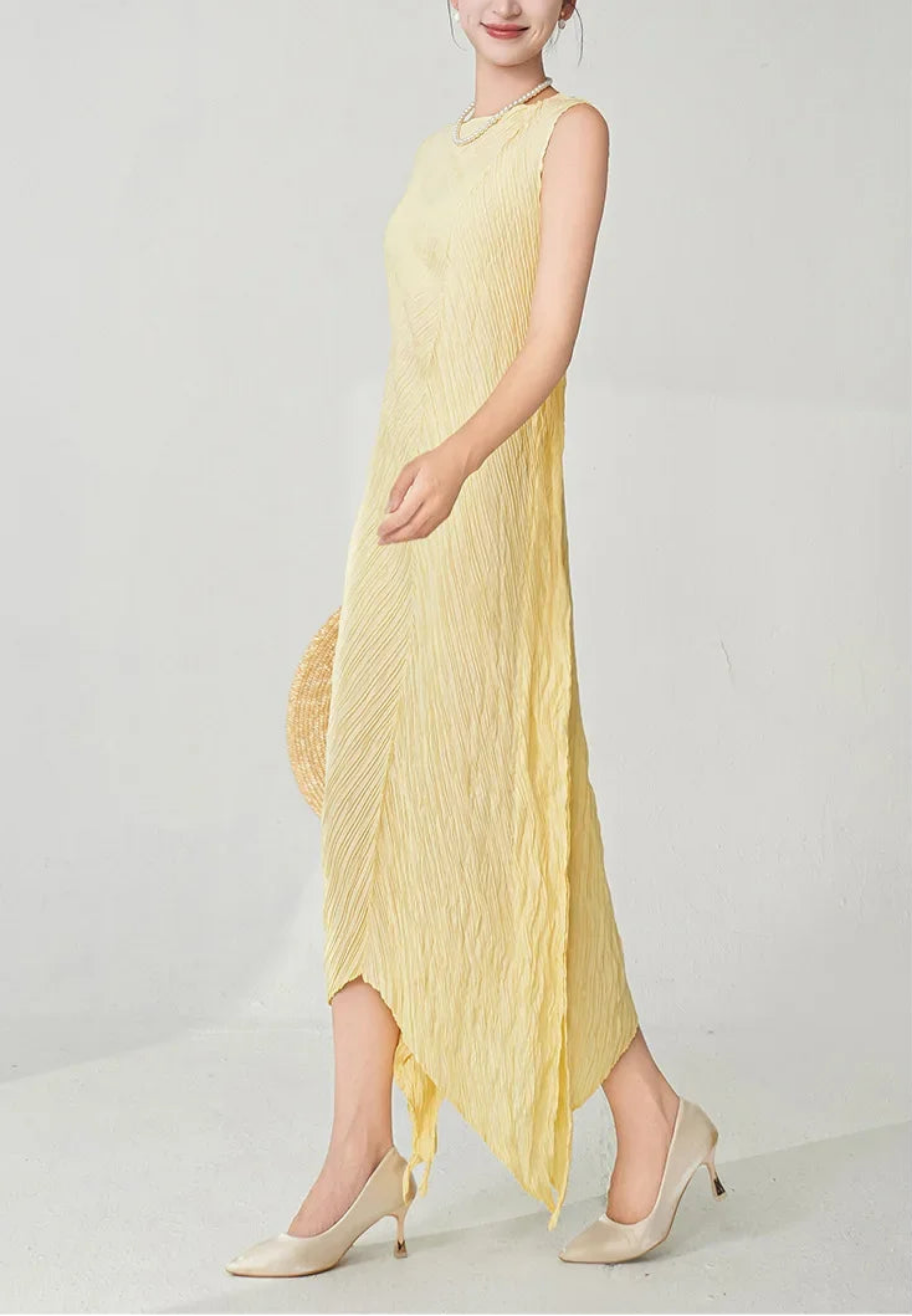 Elegant sleeveless midi dress in premium Japanese pleated fabric with stretch and wrinkle-resistant finish — no ironing needed.
