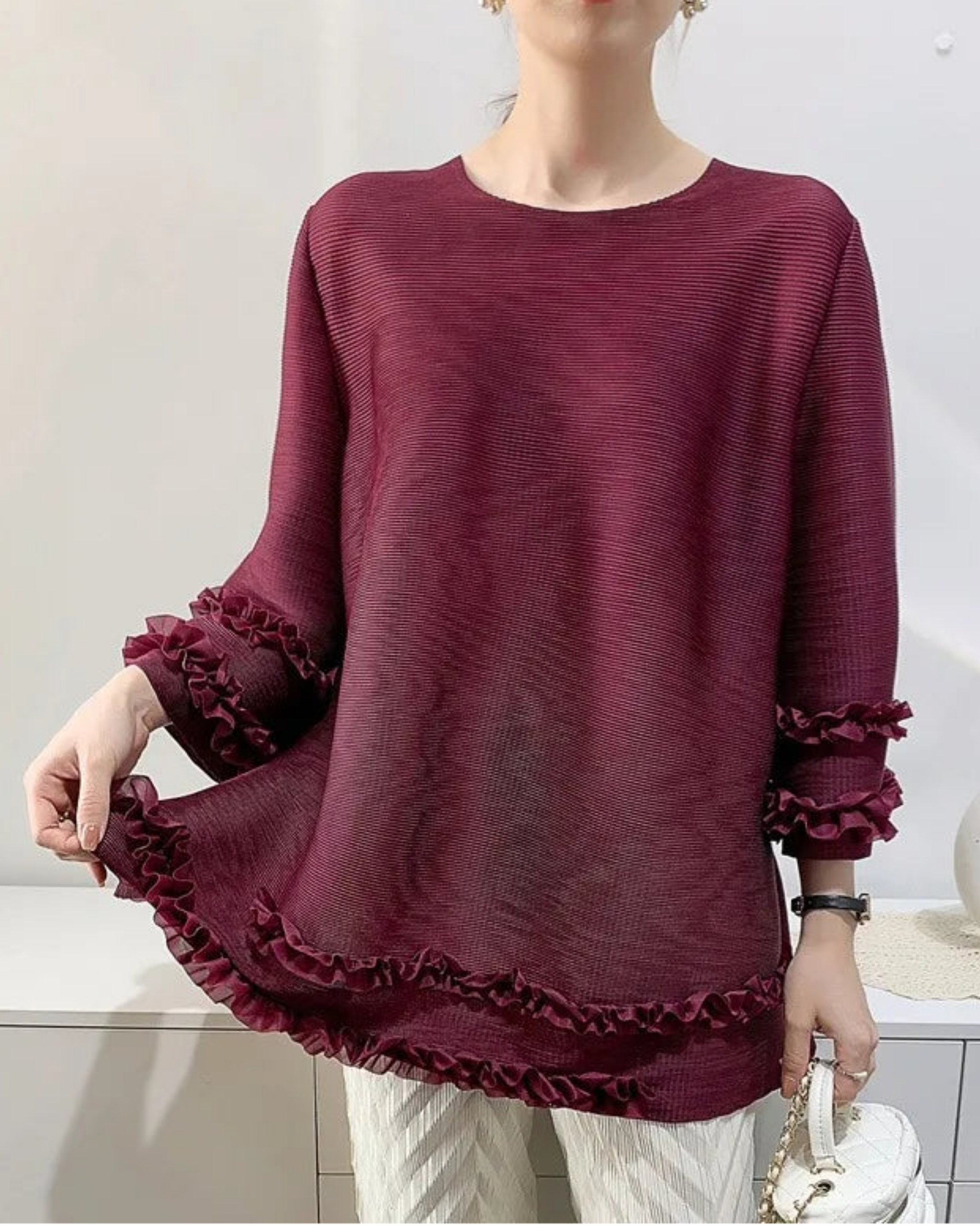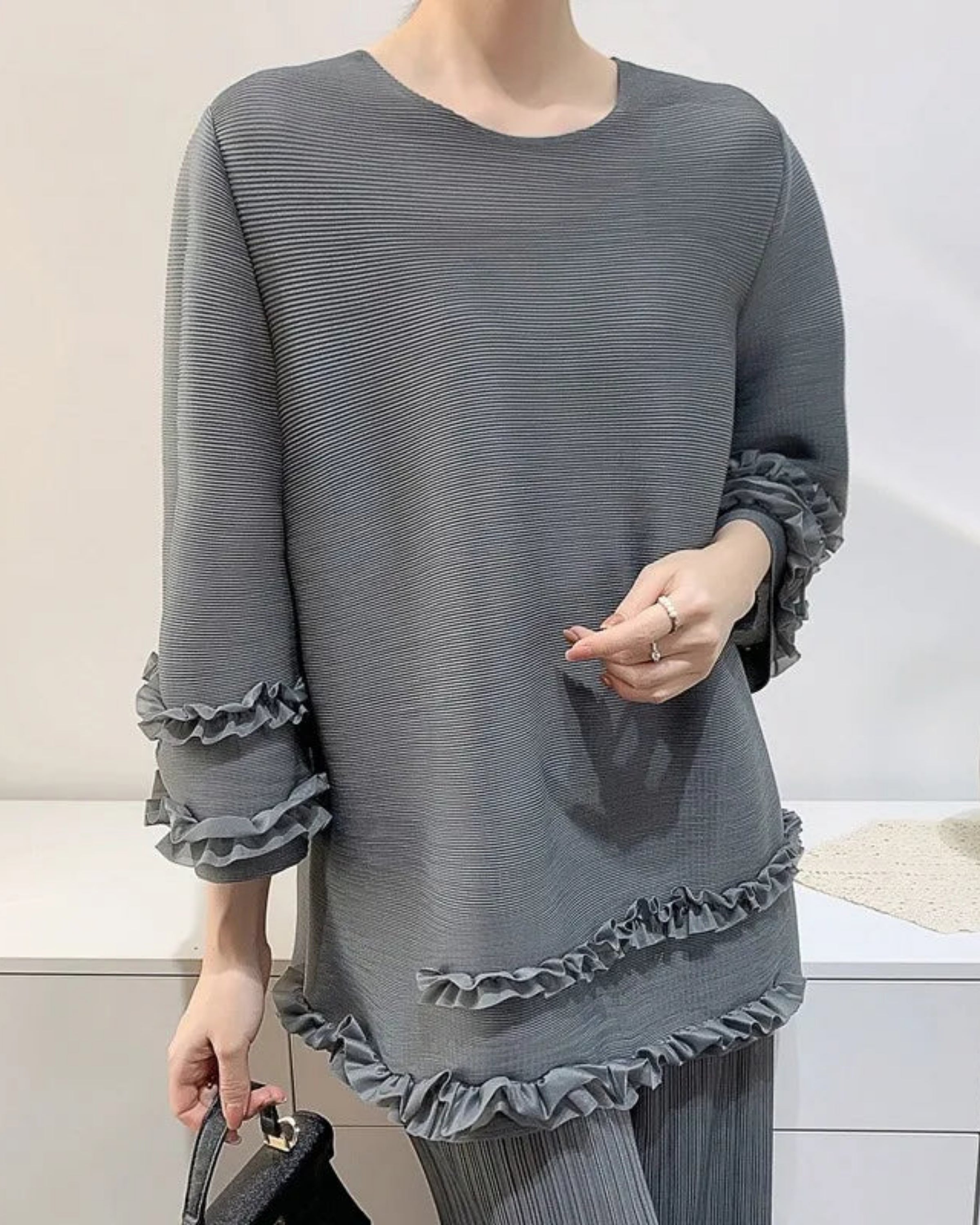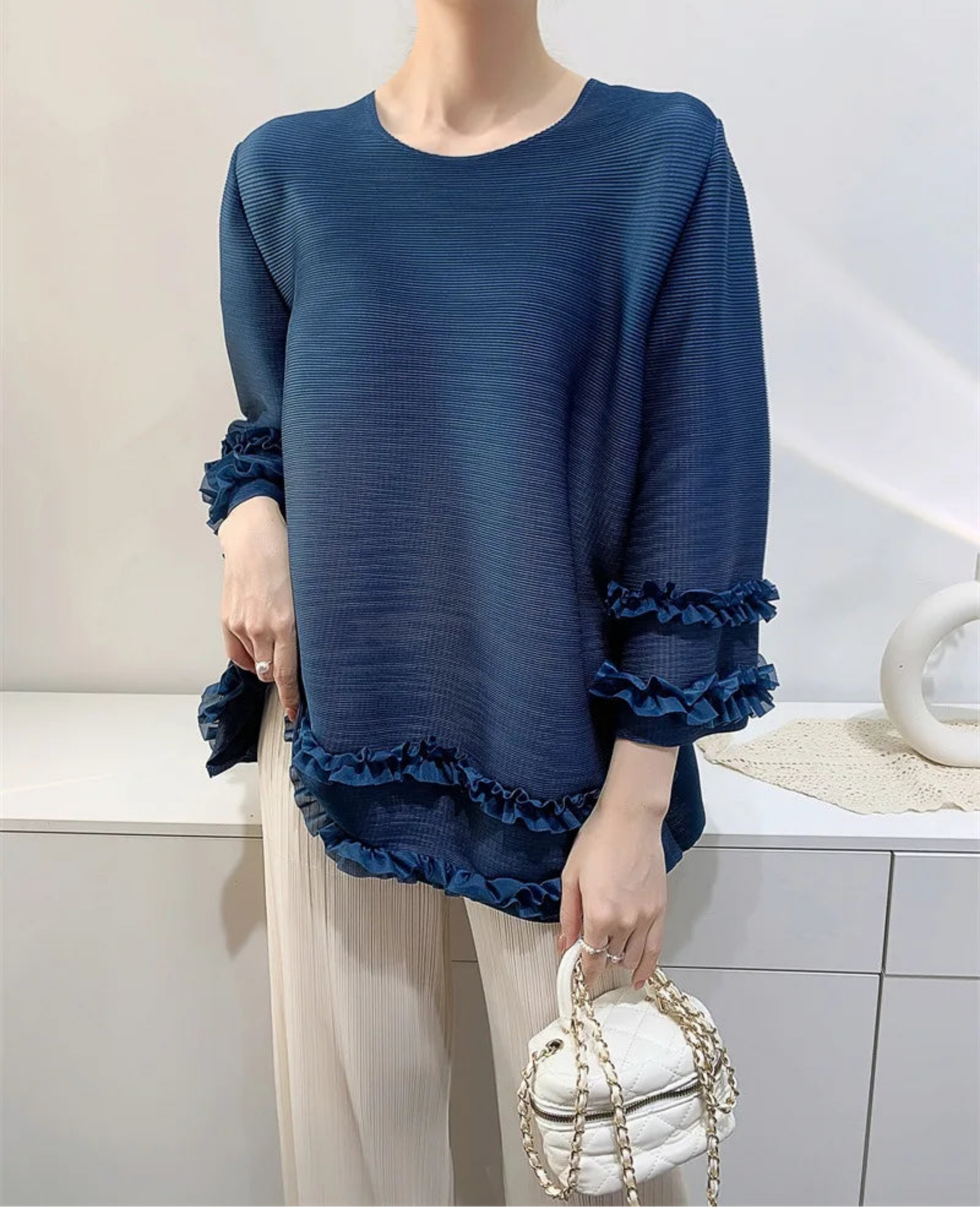 Elegant plissé top in premium Japanese pleated fabric with stretch and wrinkle-resistant finish — no ironing needed. Round neckline and three-quarter sleeves feature ruffled trim, while cascading ruffles along the hem add flow.