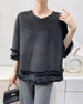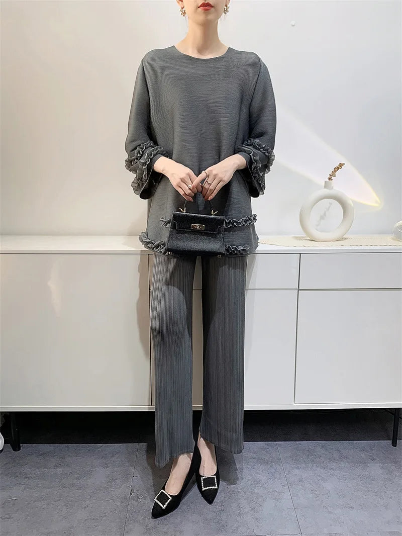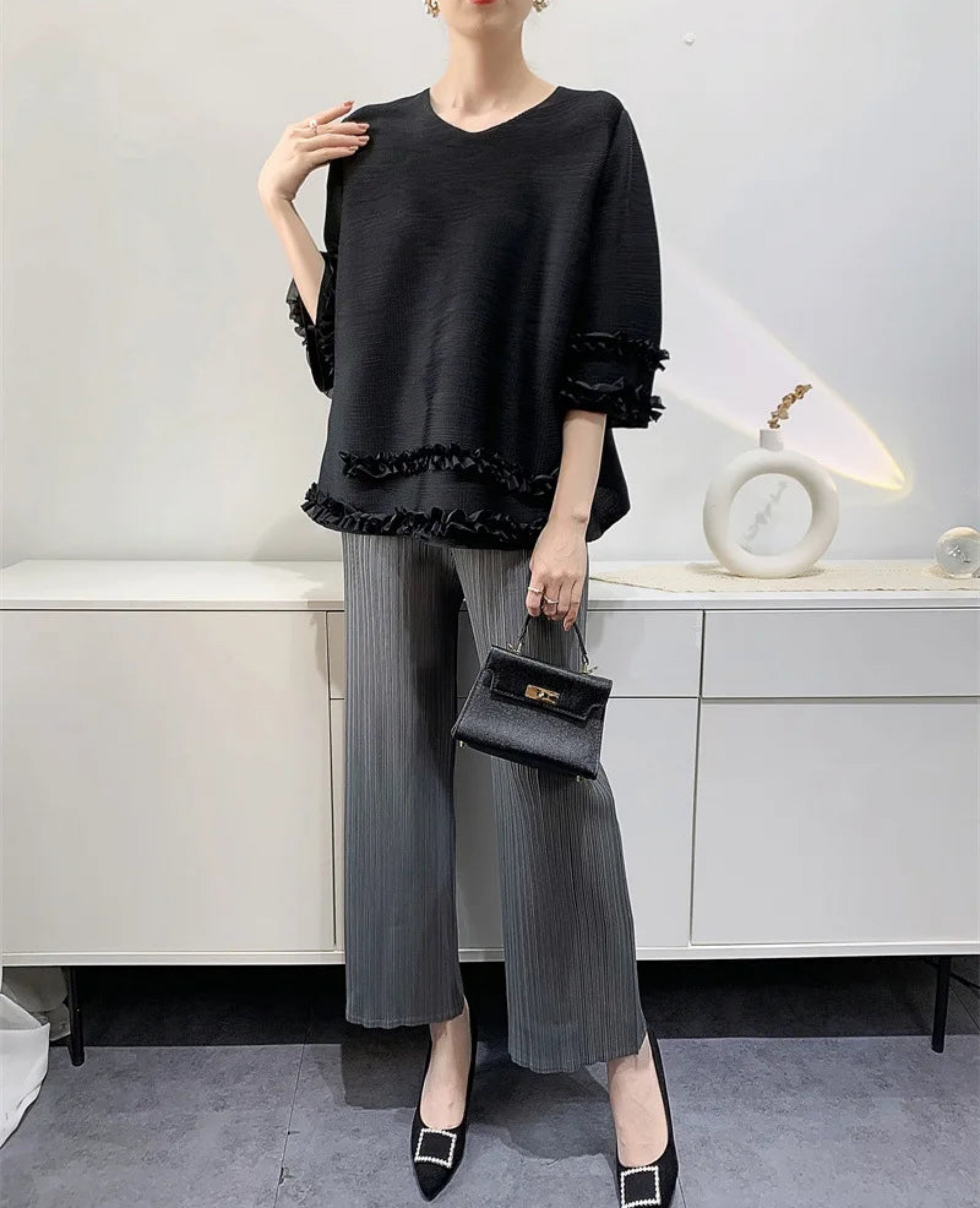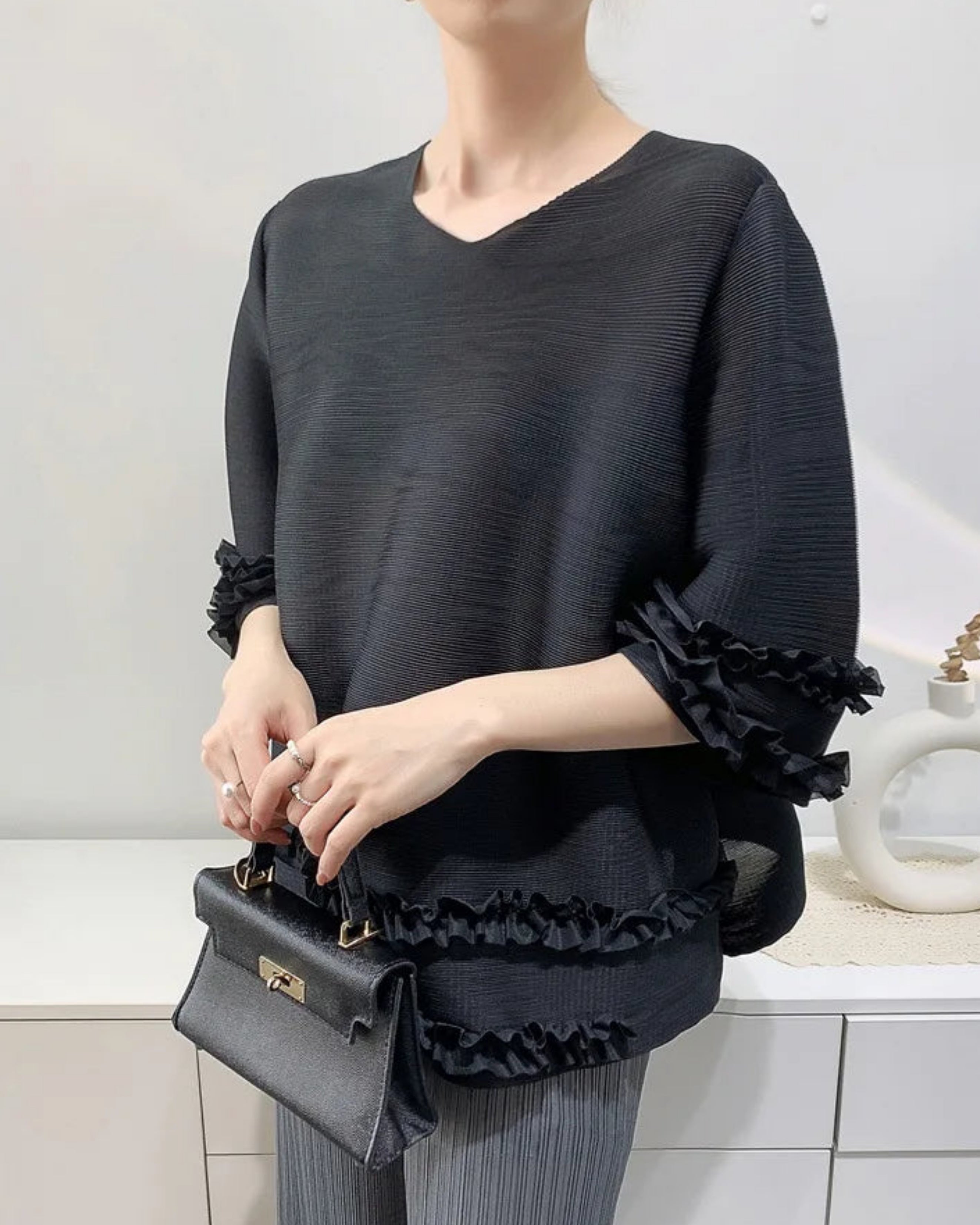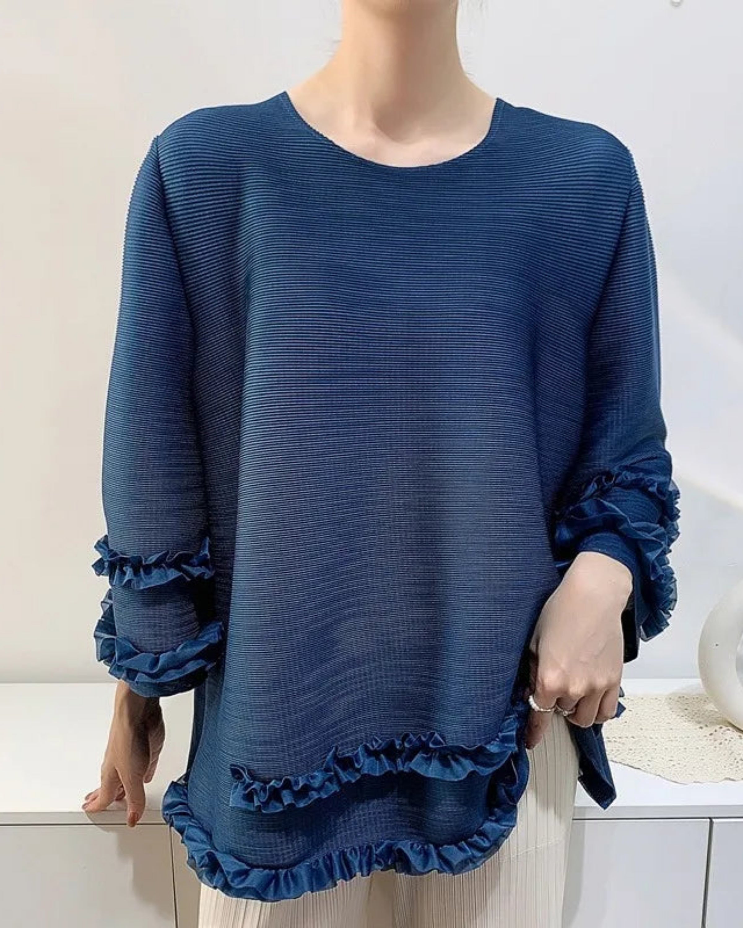Elegant plissé top in premium Japanese pleated fabric with stretch and wrinkle-resistant finish — no ironing needed. Round neckline and three-quarter sleeves feature ruffled trim, while cascading ruffles along the hem add flow.