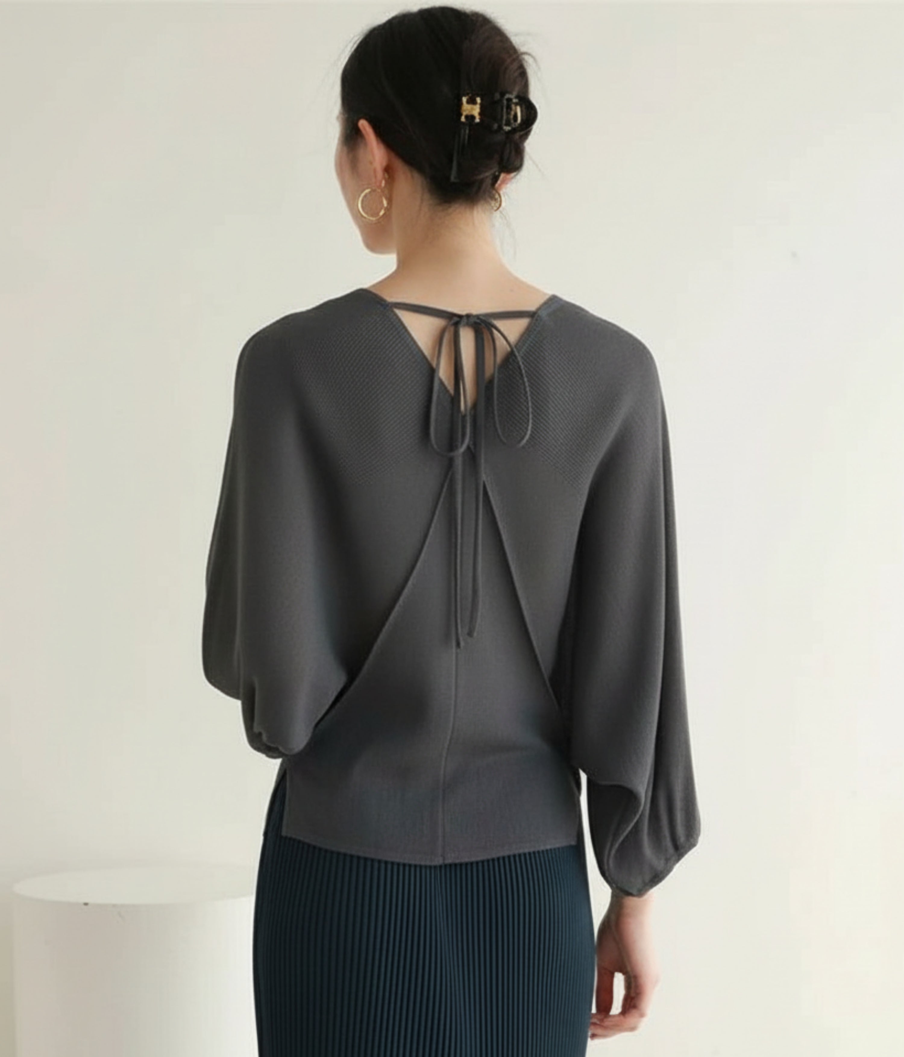 Features a V-neckline, diagonal pleats, and wrap-style front that defines the waist. Relaxed dolman sleeves gather at the cuffs with a back tie detail. Perfect for travel, resorts, formal events, or luxurious daily wear.