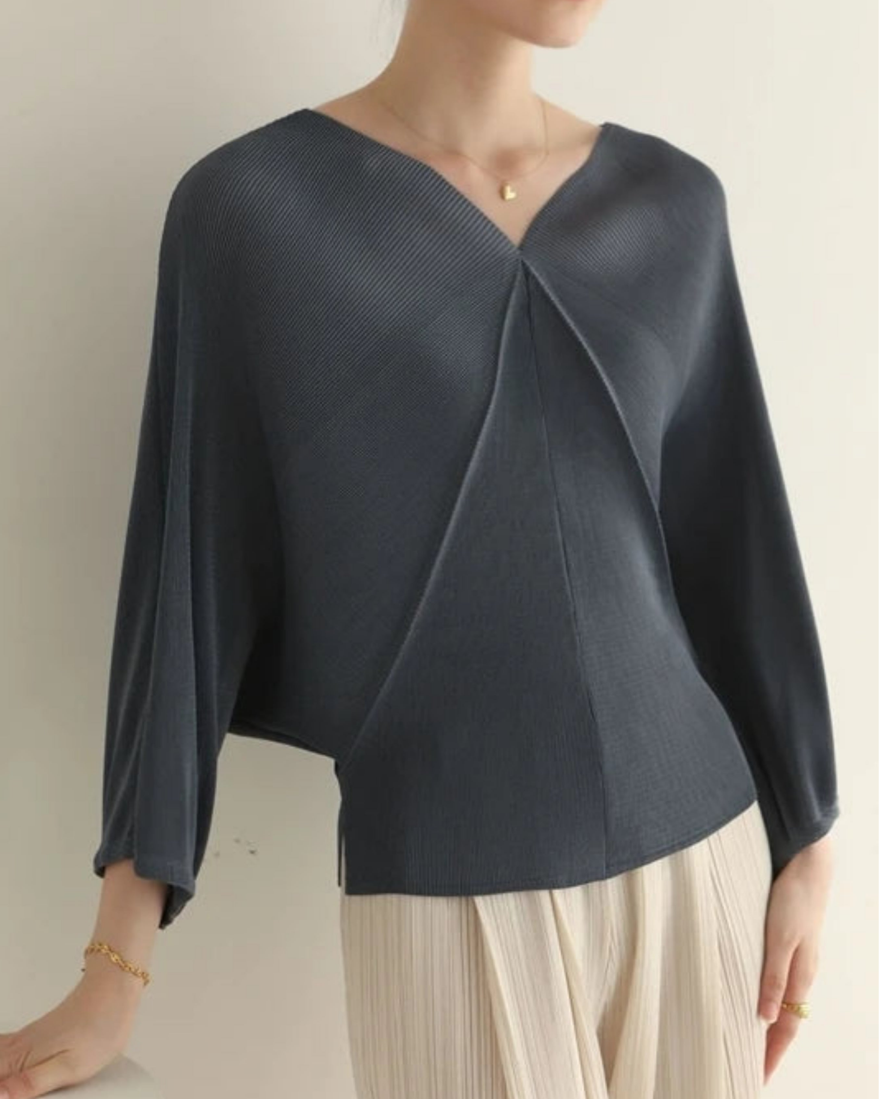 Elegant plissé wrap top in premium Japanese pleated fabric with stretch and wrinkle-resistant finish — no ironing needed.