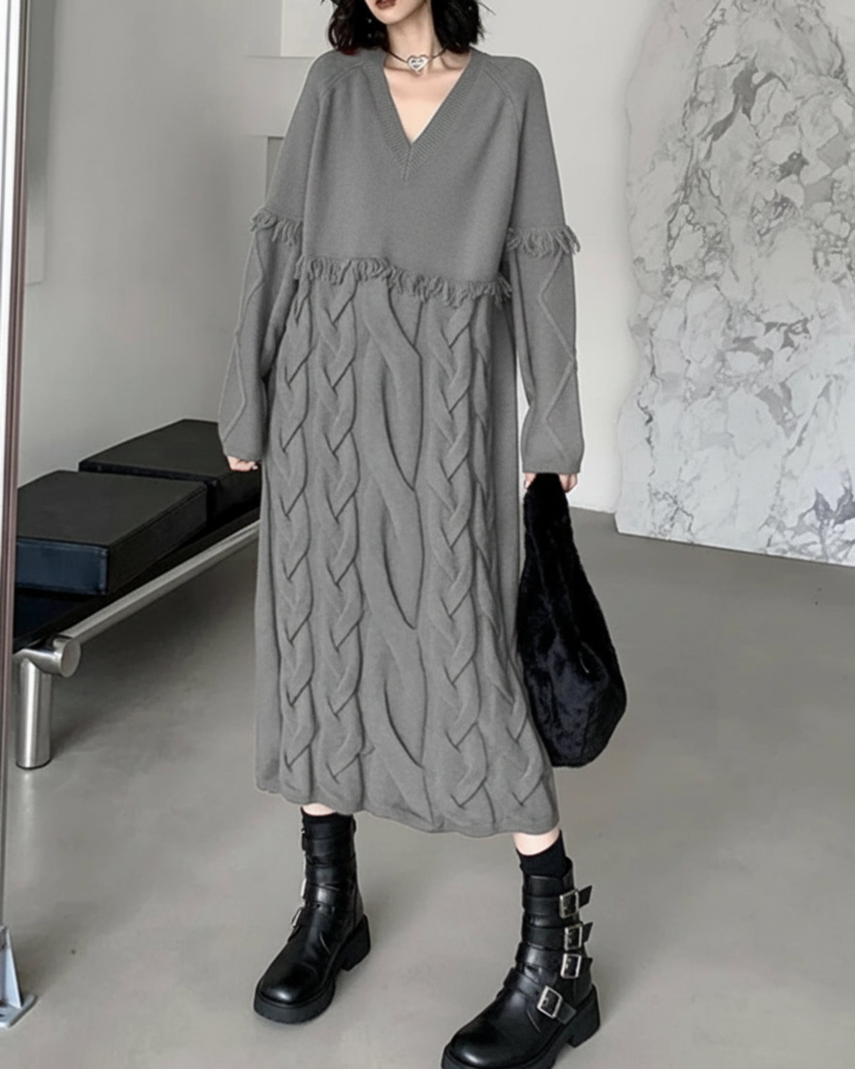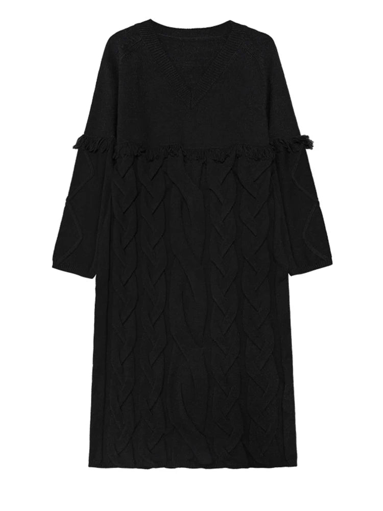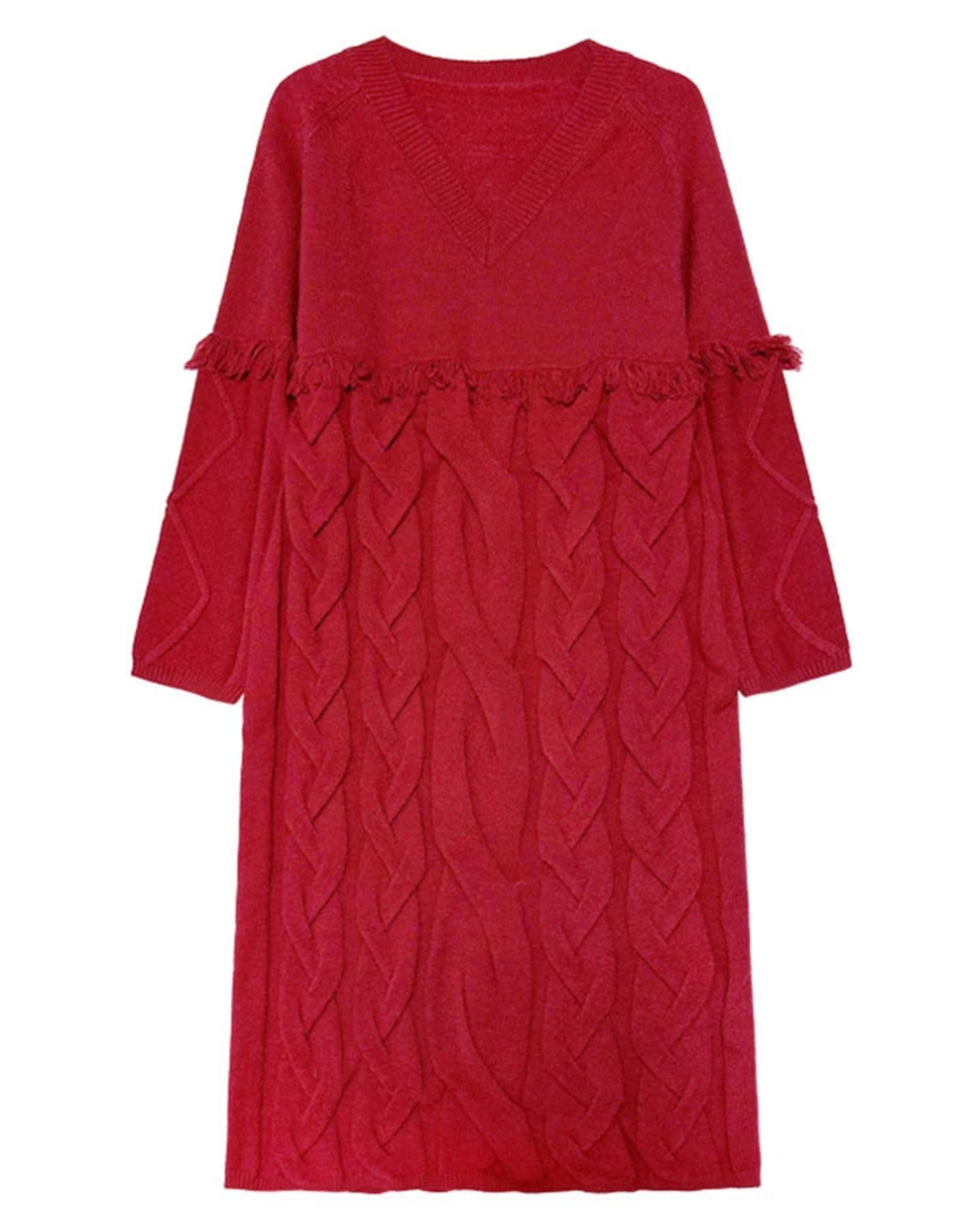 This luxurious A-line midi dress features a high-end V-neck and raglan sleeves, with intricate 3D cable knit and fringe details adding texture and depth.
