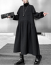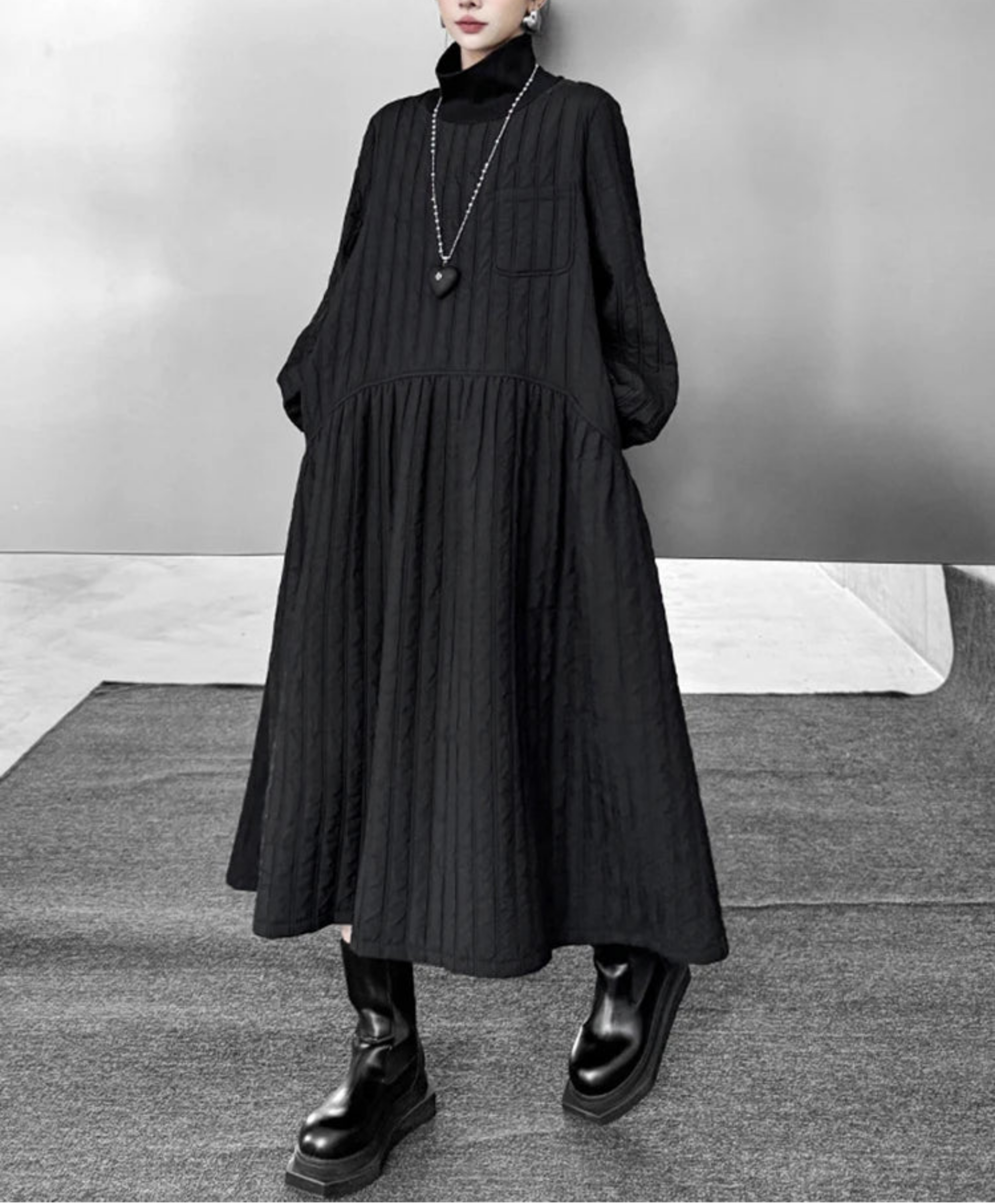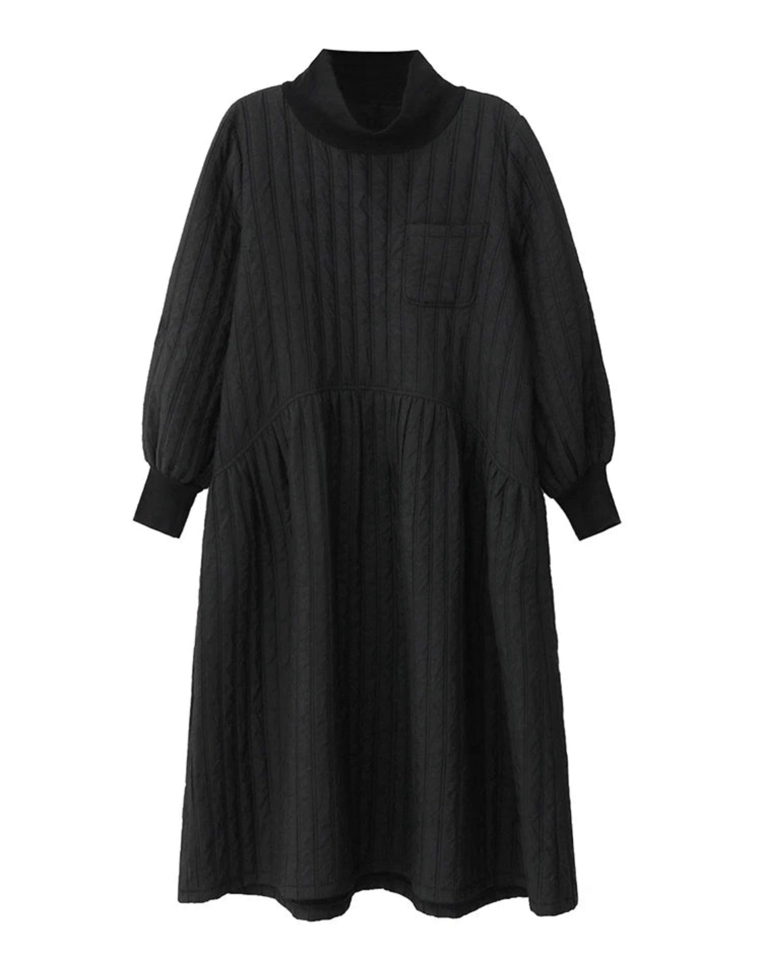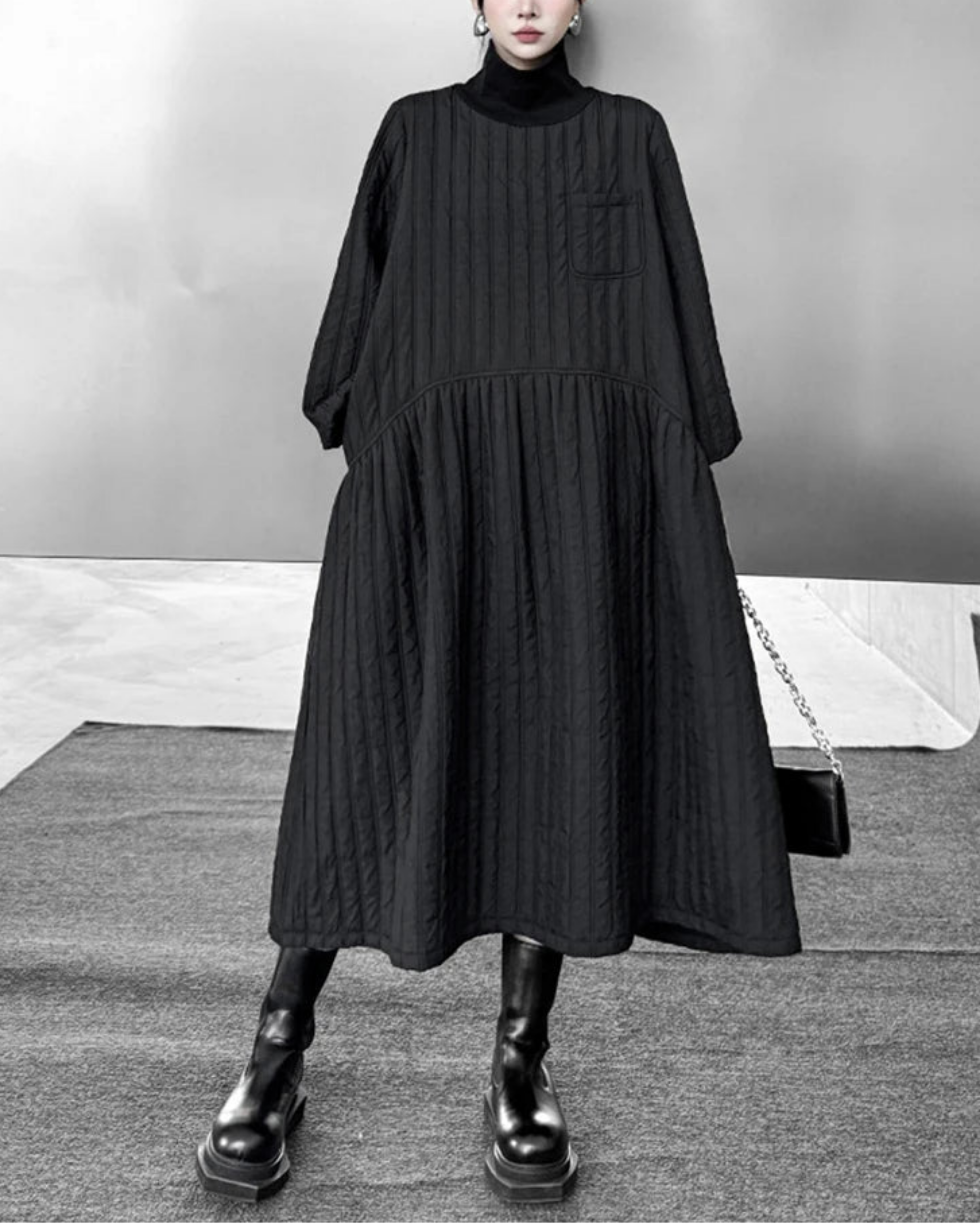 This luxurious avant-garde cotton quilted midi dress features an oversized silhouette with a statement turtleneck patchwork pullover design.