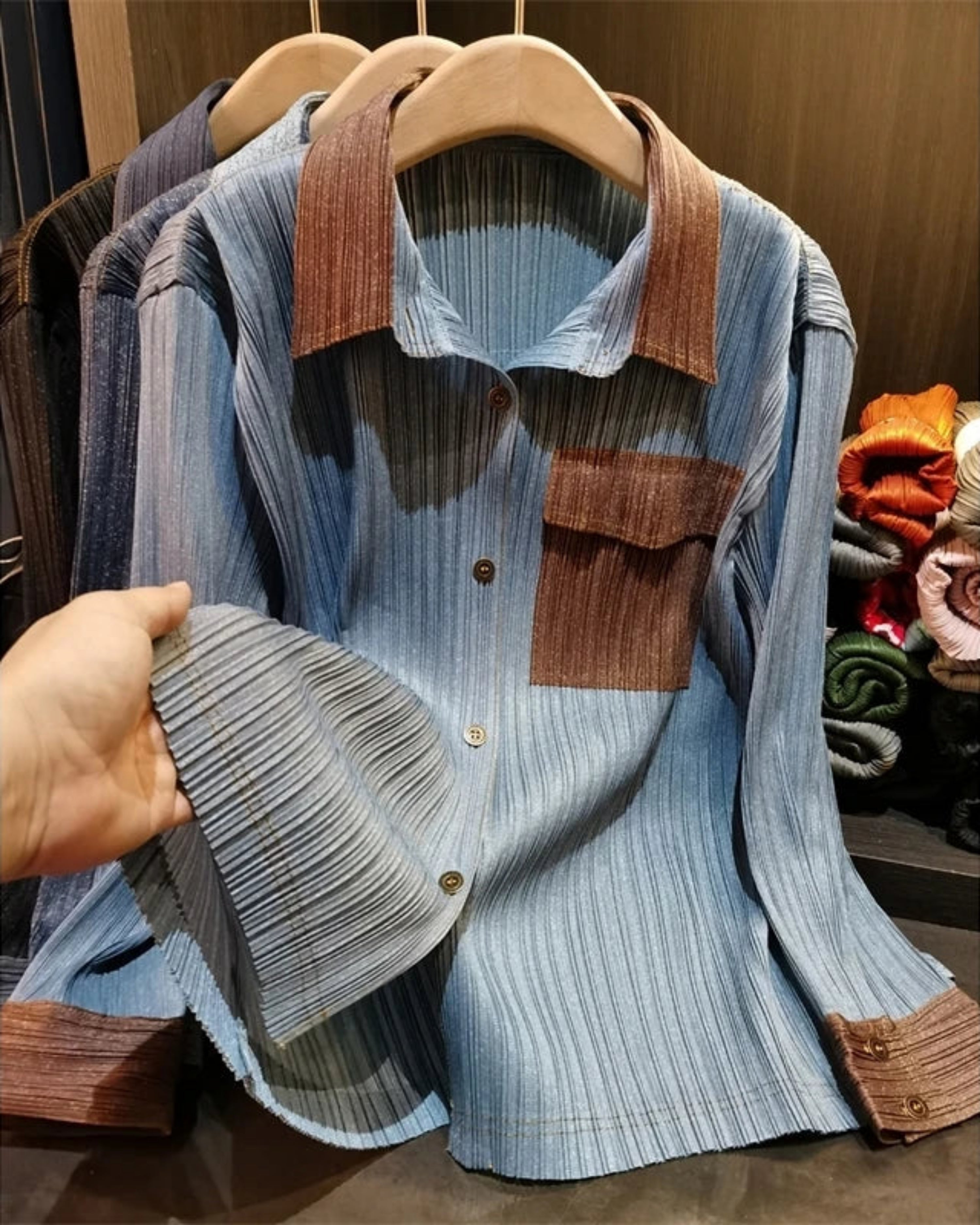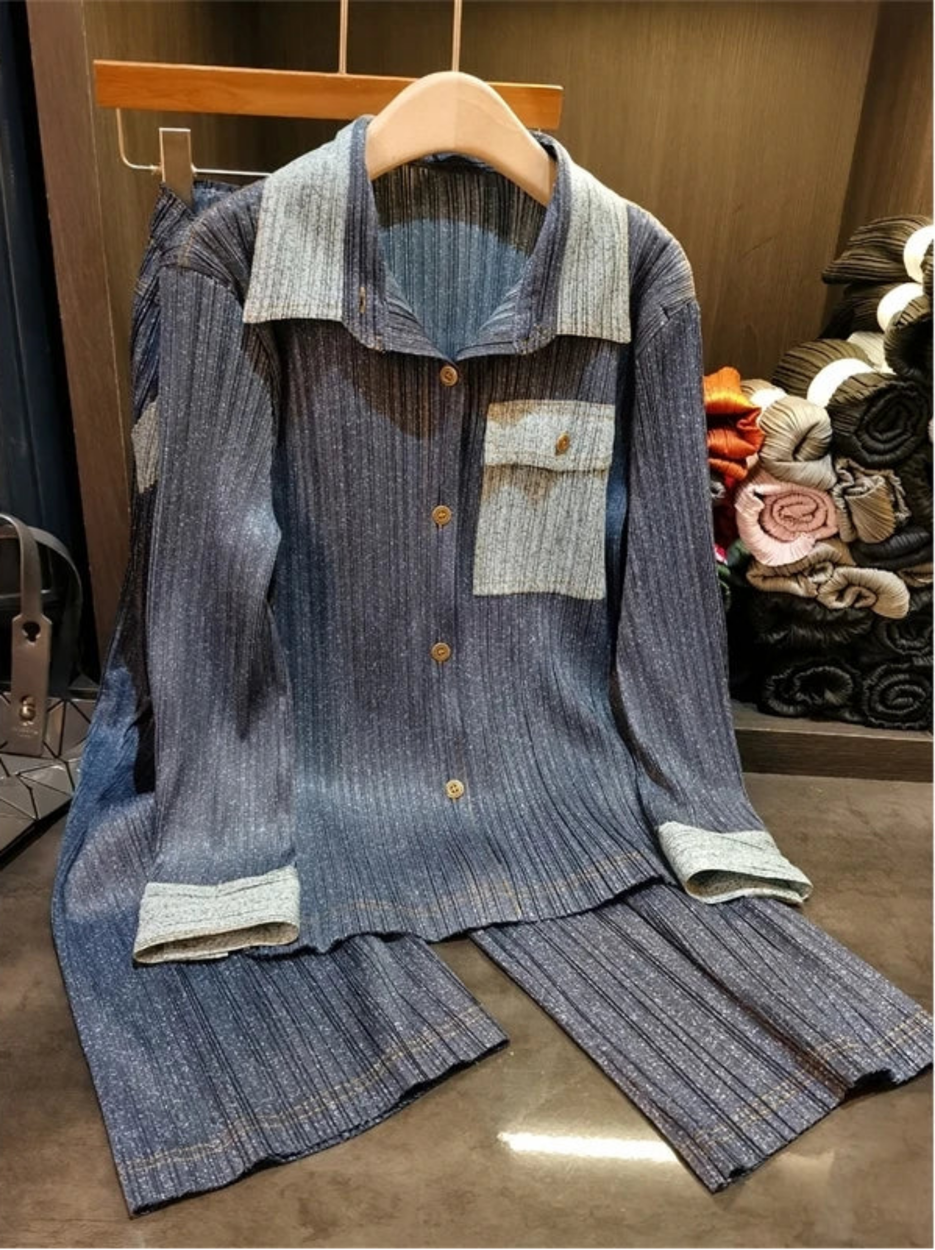 This luxurious two-piece denim pleated set features a top and matching bottom with premium Japanese-inspired pleats.