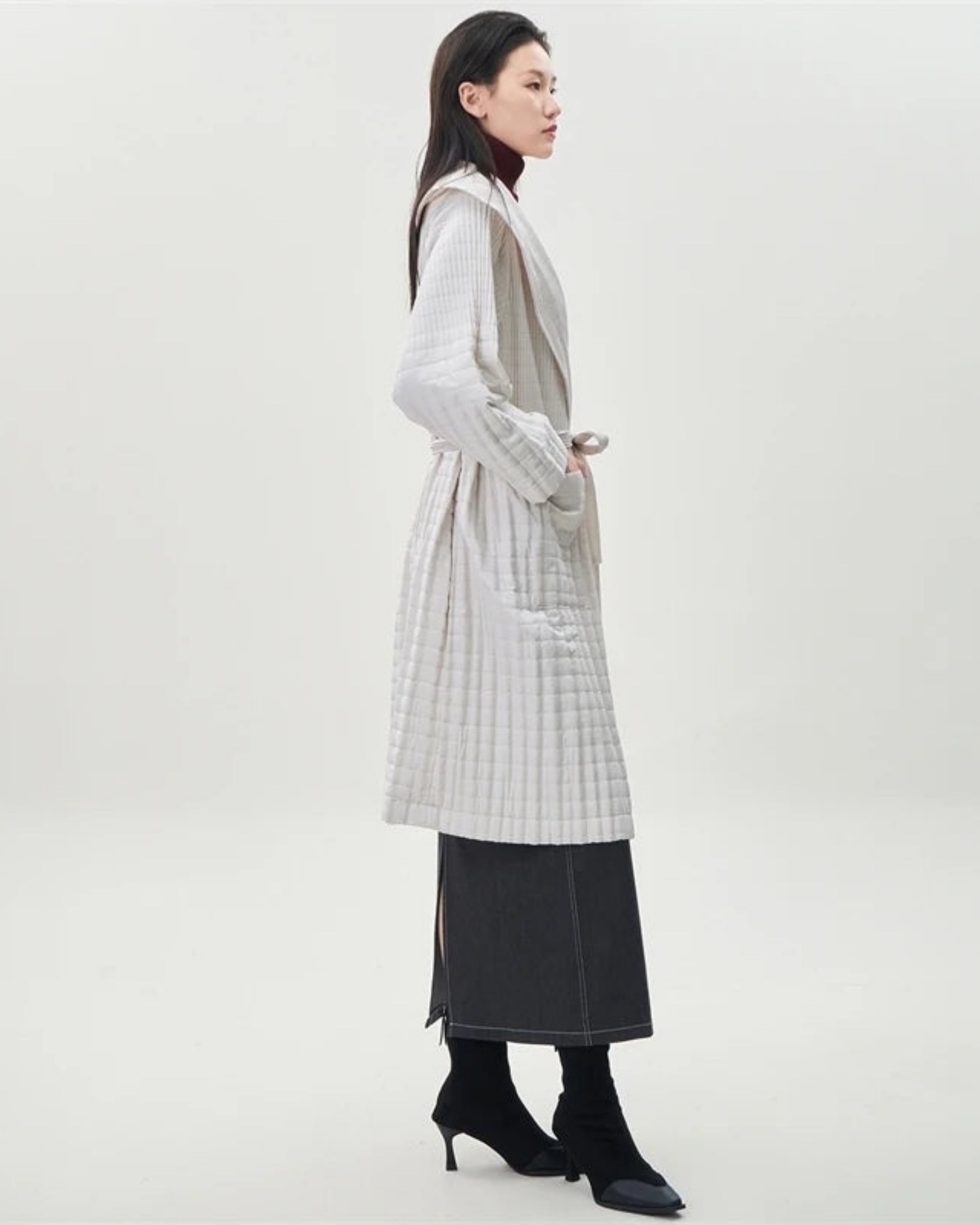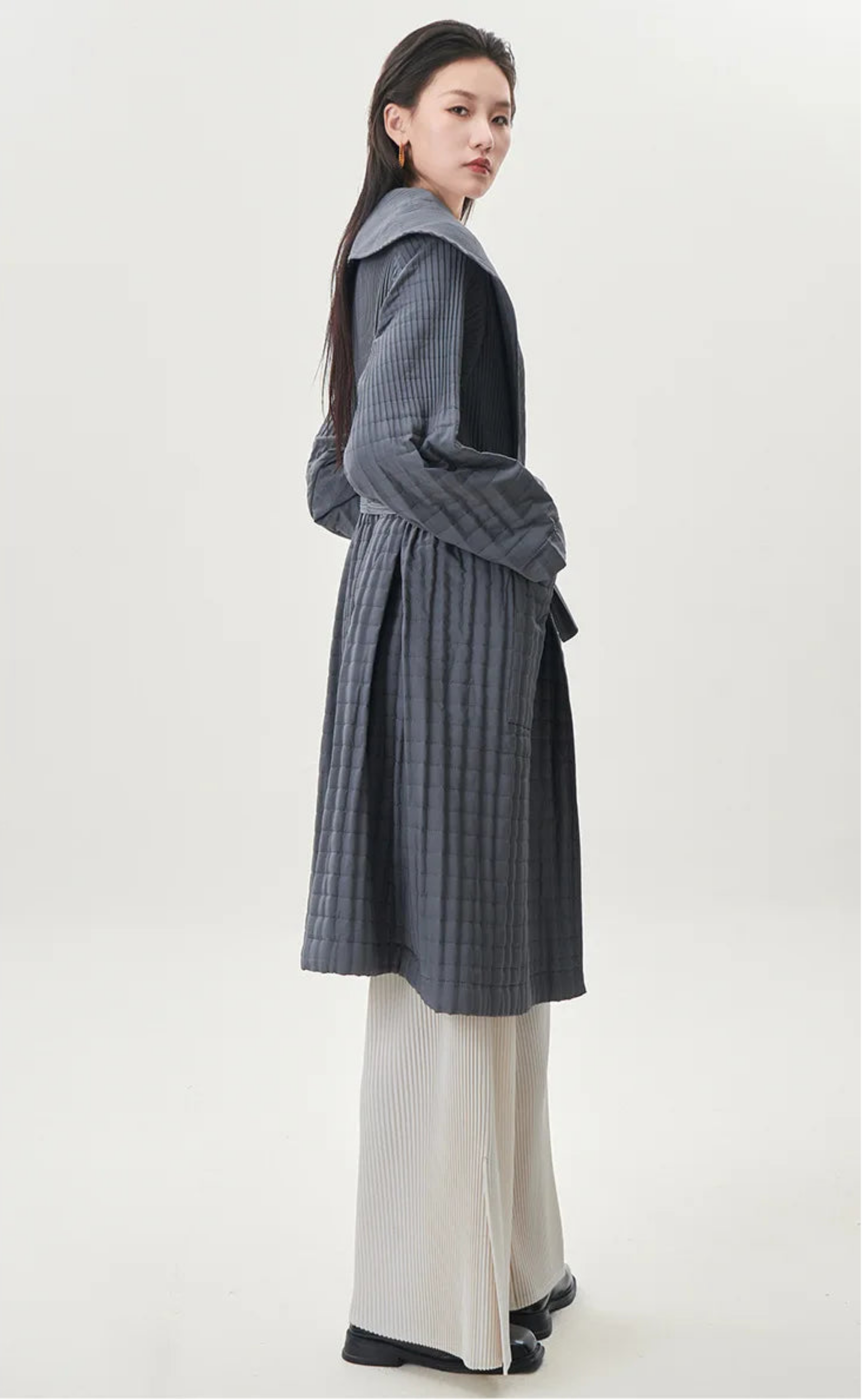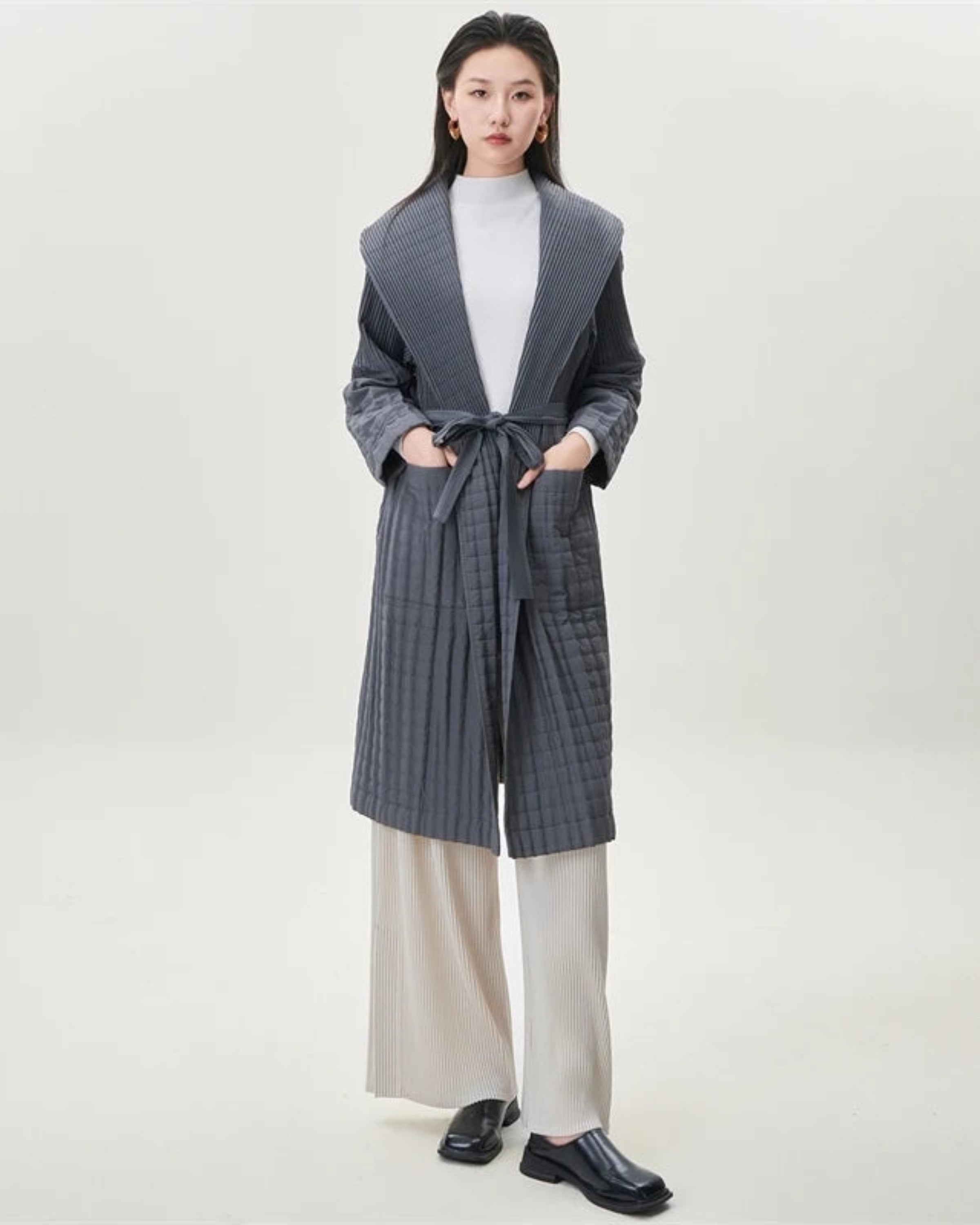 This longline coat features thick Japanese pleats with quilted cotton for a warm, cozy, and sophisticated silhouette.