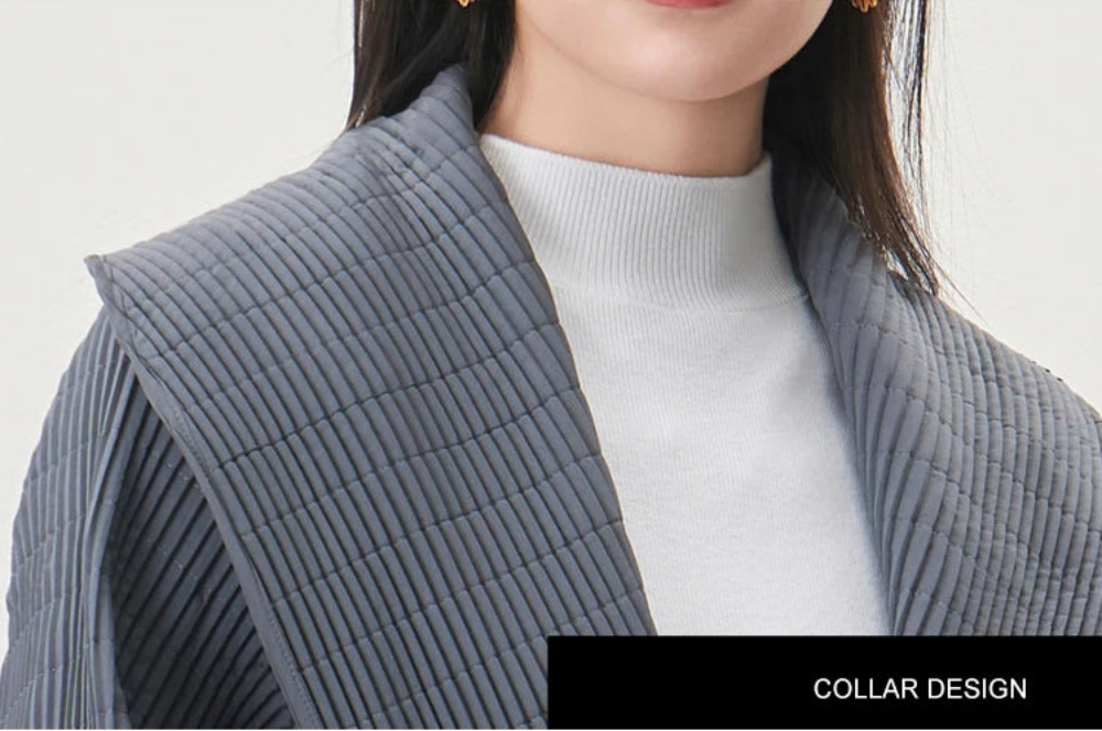 Pleated panels on the front and back add dimension, while quilted sleeves and lower body provide structure. Designed for busy women on the go, it’s wrinkle-resistant, quick-drying, and non-bulky—perfect for work, evening events, or travel.
