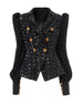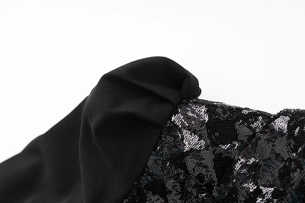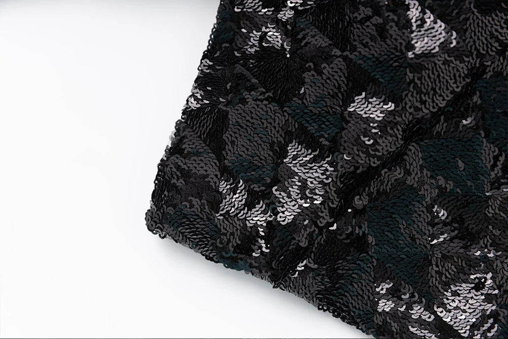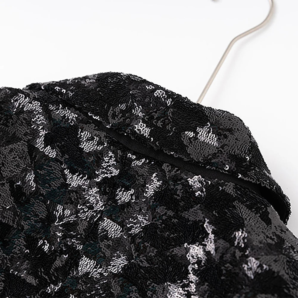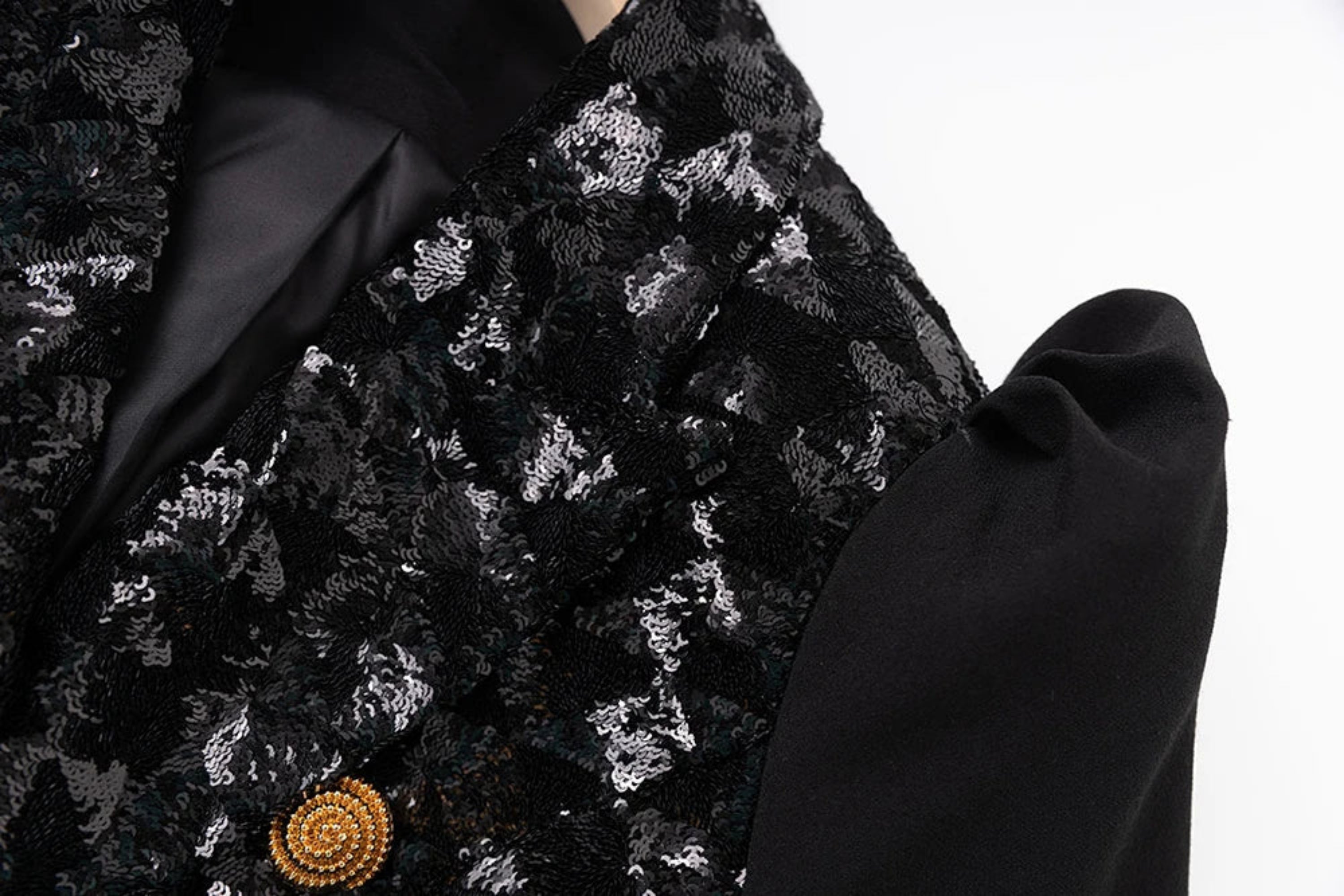 This luxurious double-breasted blazer is adorned with full-body sequins and gold buttons.