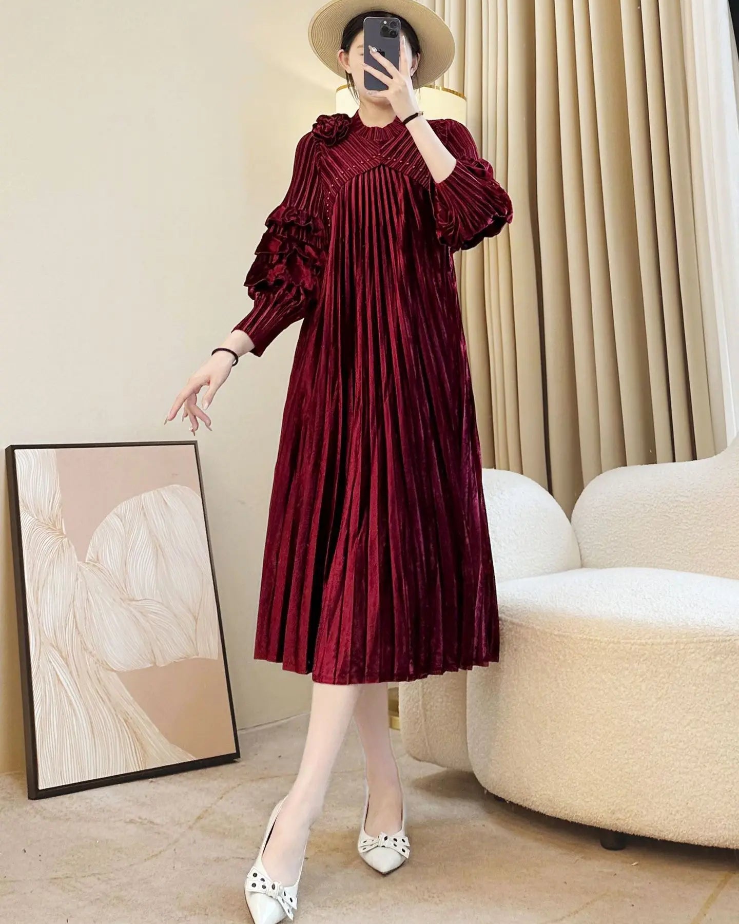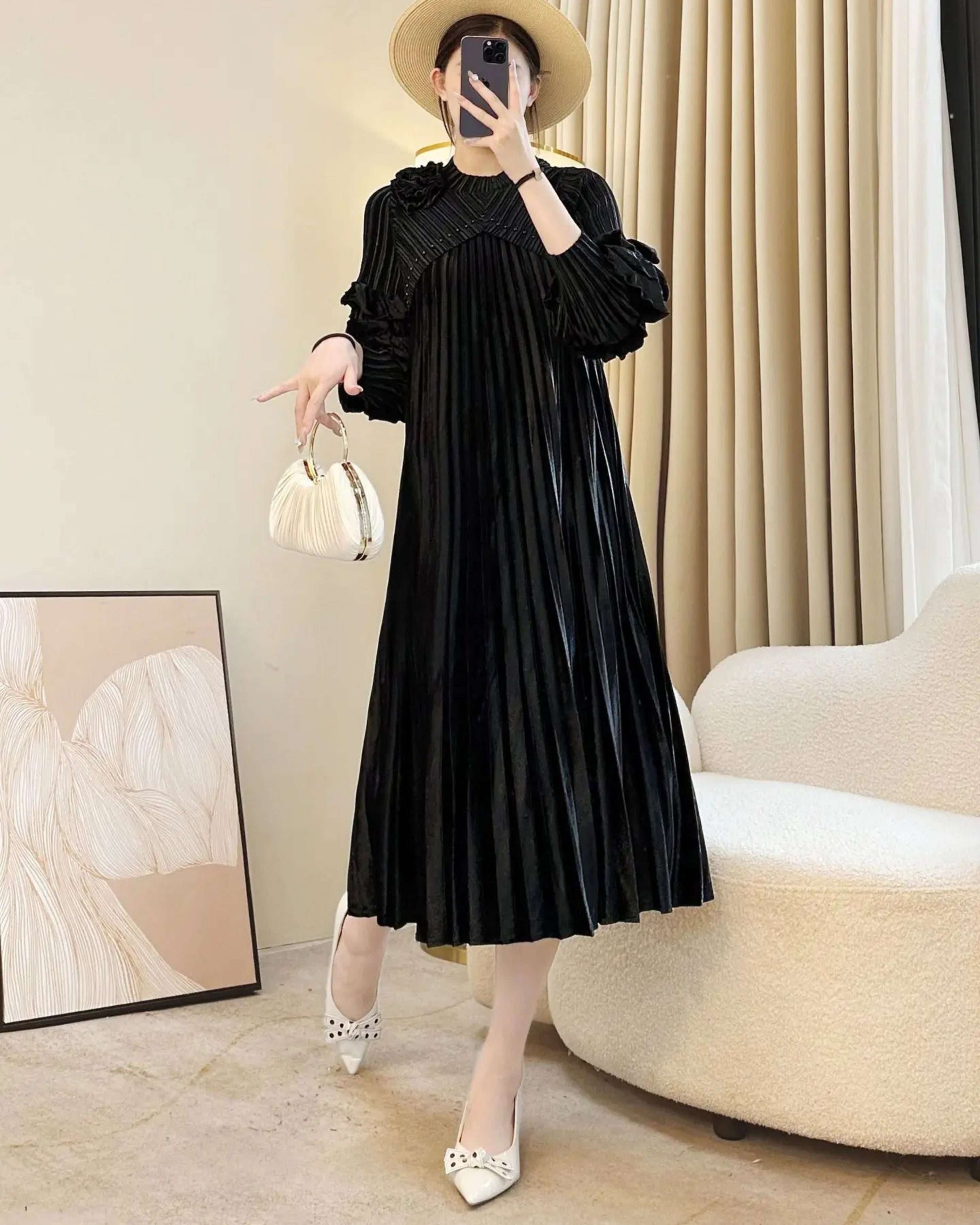 Thick Japanese Pleats Pleated Midi Long-Sleeve Dress