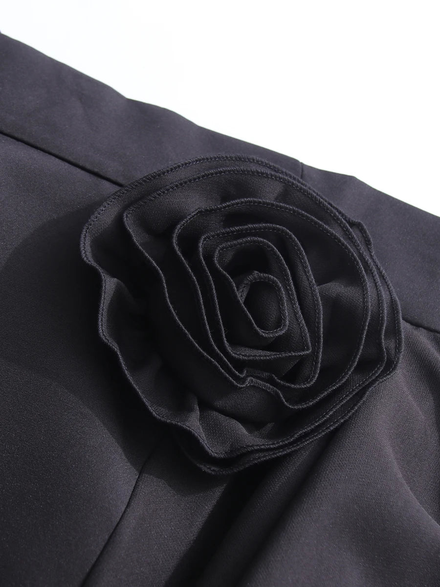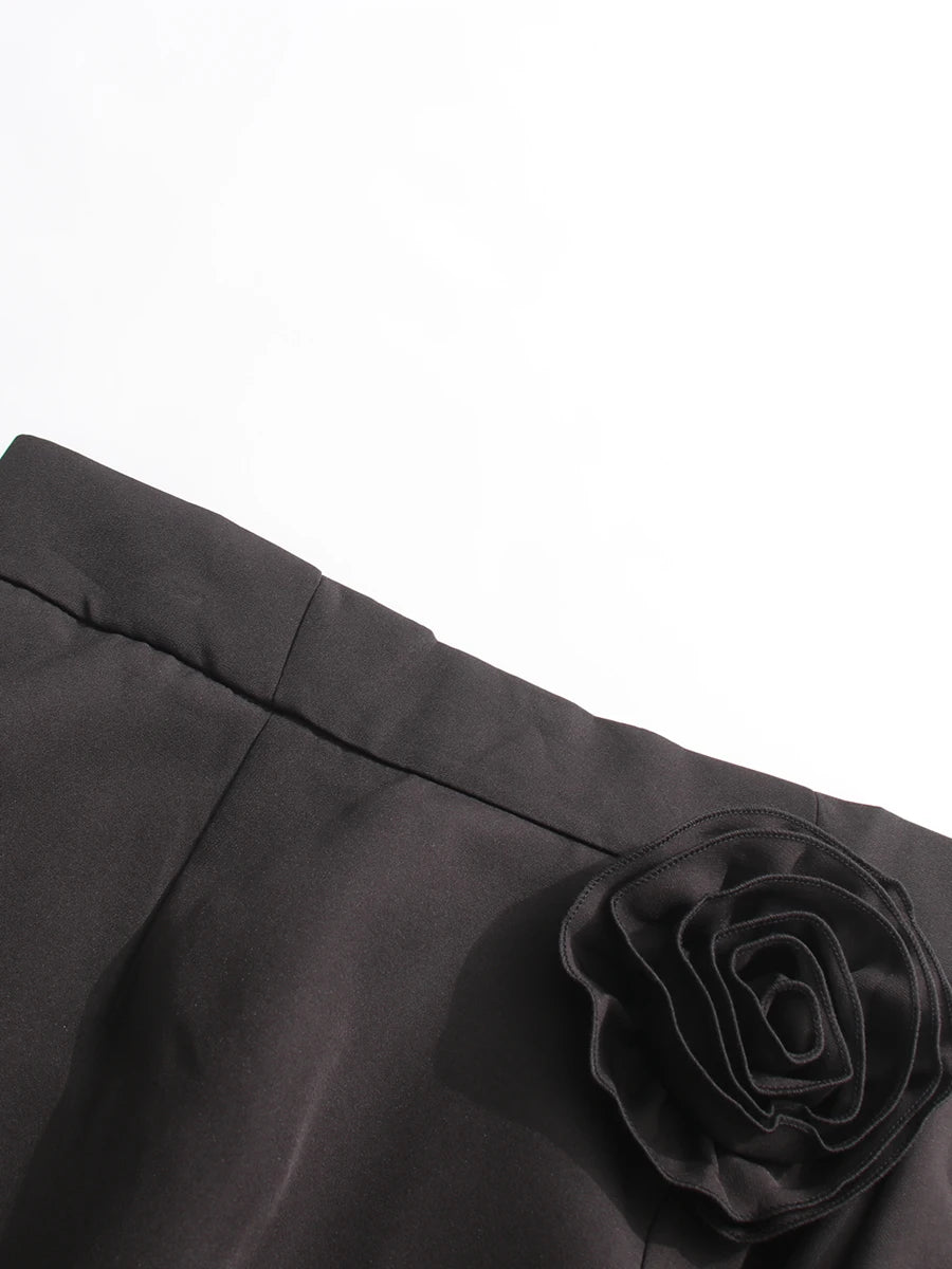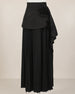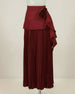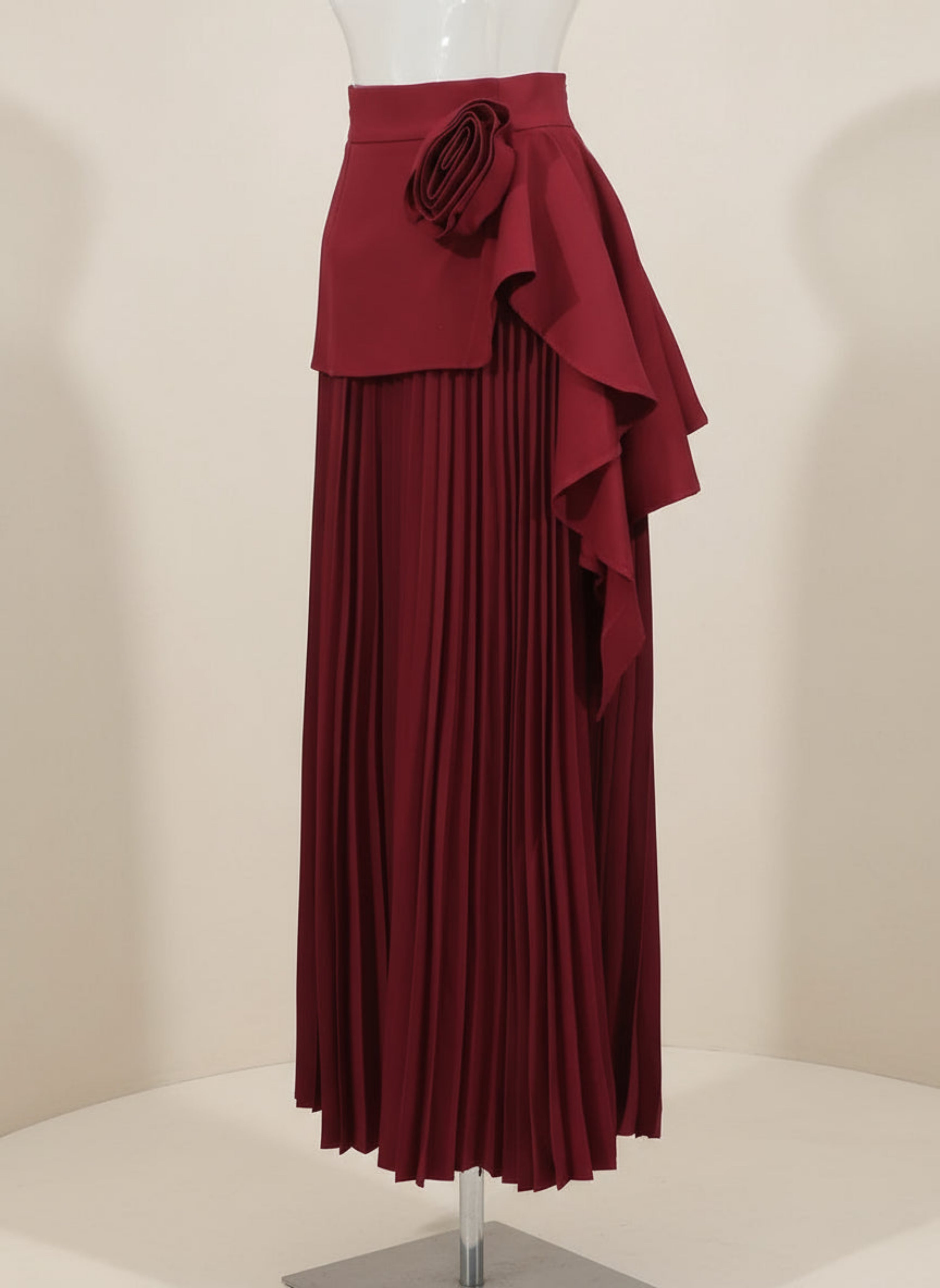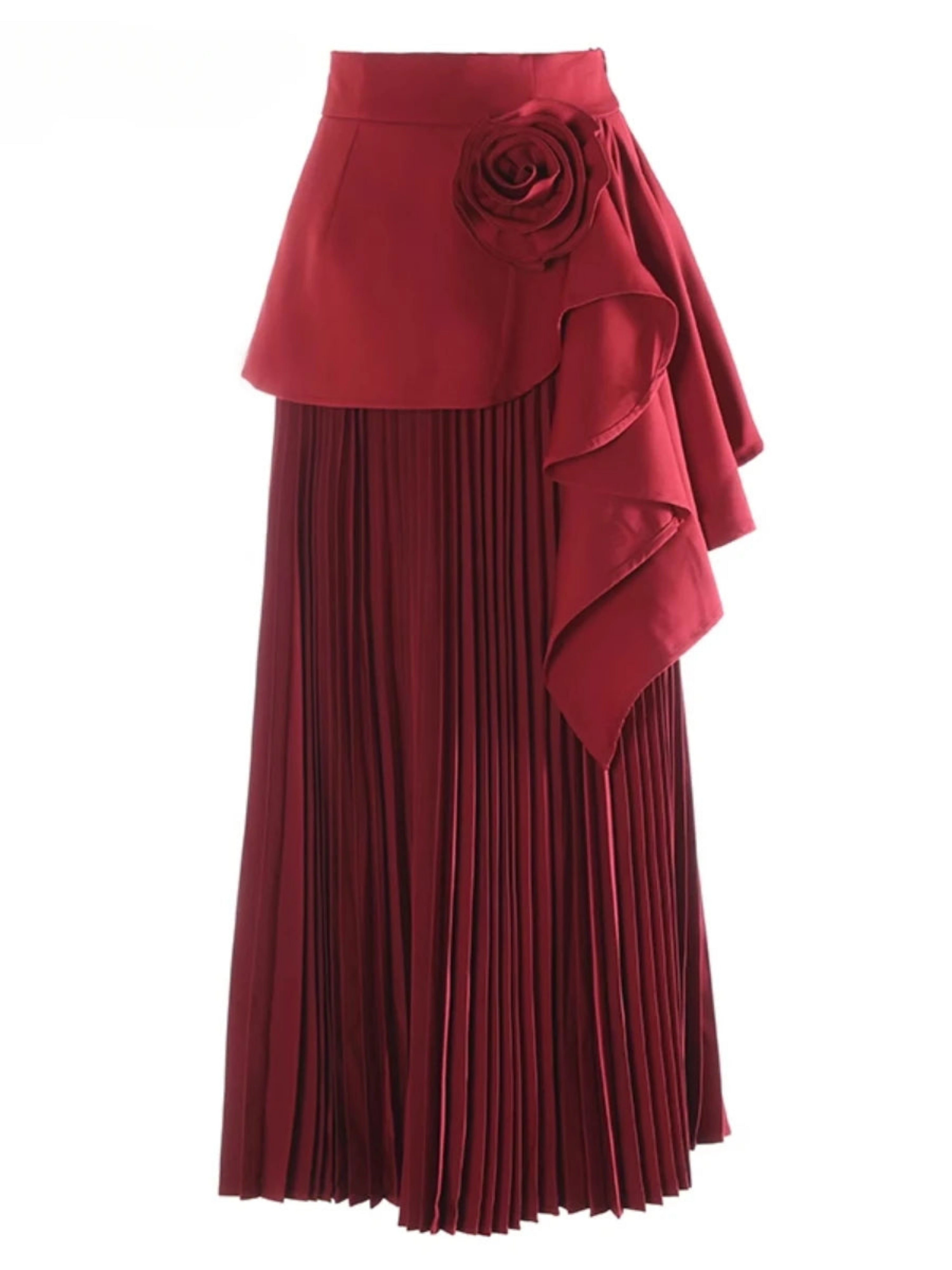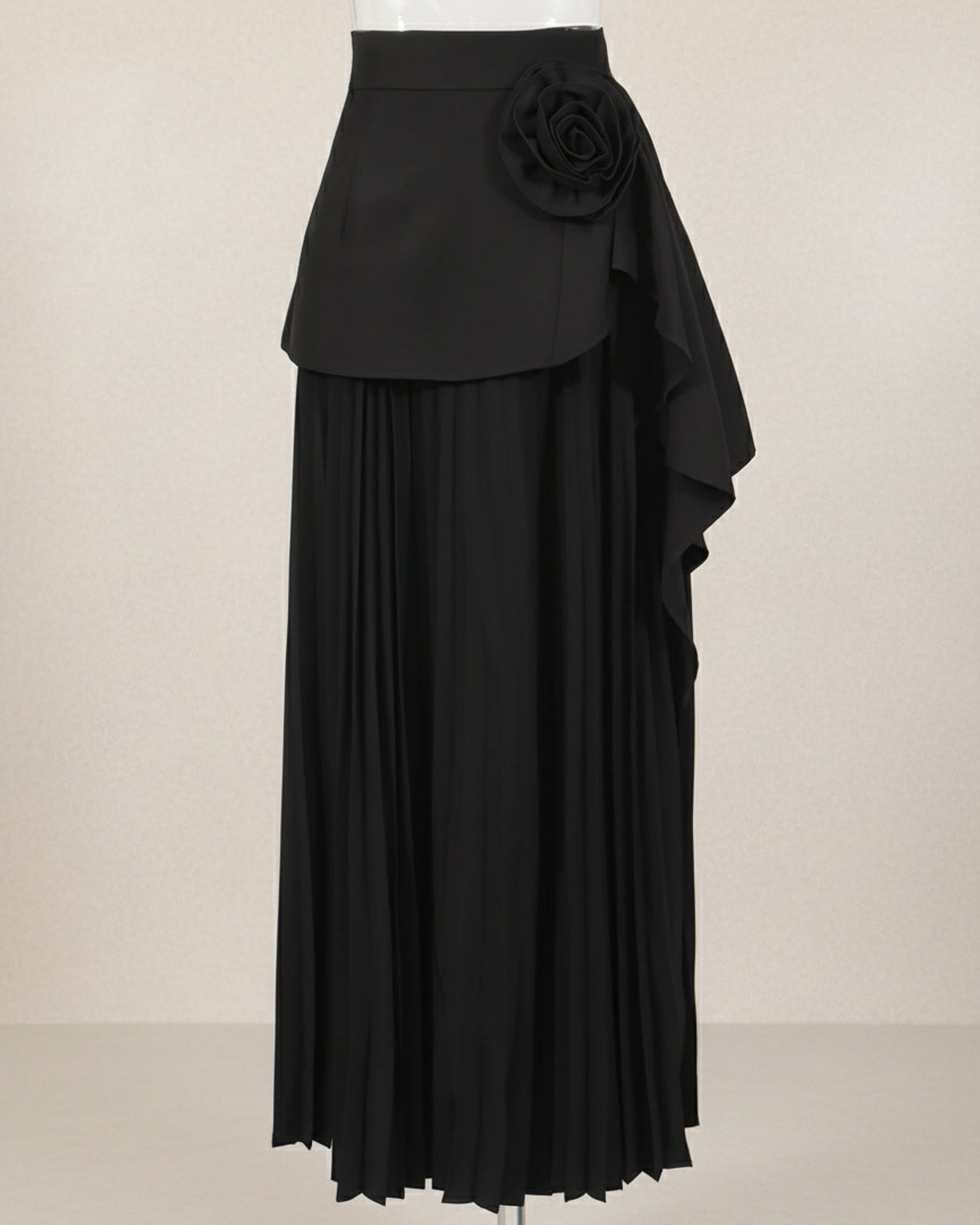 A high-waisted, full-length pleated skirt with an A-line silhouette that moves gracefully. The waist is highlighted by a dramatic 3D floral appliqué and asymmetric cascading ruffles.