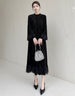 The long bell sleeves flare with ruffled cuffs, while delicate ruffled trim at the hem adds movement. Made from stretchy, wrinkle-resistant fabric, the dress offers comfort, elegance, and effortless style for travel, formal, or evening wear.
